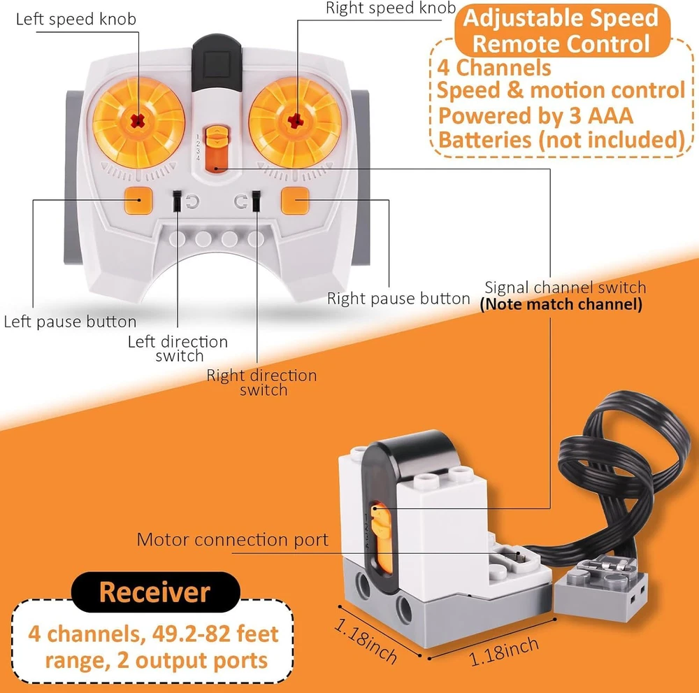 Versatile Power Function: Our techn -ic motor set offers a combination of M and L motors, providing powerful performance for various building block toys. The battery box is capable of running multiple motors simultaneously, allowing for more complex and dynamic creations. Remote Control for Ultimate Flexibility: Take control of your motorized creations with the speed-adjustable tec-hnic remote control, providing you with the freedom to operate your motors anytime, anywhere. The 2.4G receiver ensures a stable connection, giving you the ability to control your projects from a distance. Unleash your imagination and explore endless possibilities with this comprehensive motor kit. Comprehensive Tec-hnic Motor Kit: Elevate your building experience with this all-in-one motor kit, which includes 2 * M motors, 1 * L motors, 1 * battery box (batteries not included), 1 * speed-adjustable tech-nic remote control, 1 * 2.4G receiver, 1 * 9.84-inch extension cable, 1 * LED light cable, and 1 * direction change switch. Made from durable, high-quality ABS plastic, this kit is designed for long-lasting enjoyment. Wide Compatibility & Customization: This motor kit is compatible with most building blocks, such as LEGO, allowing you to mix and match components to fit your specific needs. Transform static building blocks into dynamic, moving creations, adding an extra layer of fun and excitement to your projects. Fun, Engaging & Educational: The process of integrating motors into your building block creations presents a fun and challenging experience. Children can develop their creativity, problem-solving skills, and hands-on abilities through assembly, while parents can enjoy quality time with their kids. This tec-hnic motor set makes a perfect gift for family and friends. Product Description Boost Creativity with Our Motor Set Ignite your child's imagination by transforming building block toys into motorized creations with our easy-to-use Tech-nic Motor Kit. This set promotes hands-on learning, fostering creativity and problem-solving skills. Transform Your Building Block Creations with Our Motor Power Kit Elevate your building experience and bring your projects to life with our nine-in-one motor power kit. Designed to seamlessly integrate with your creations, this comprehensive set provides everything you need to enhance your playtime. Power Combo Basic Power Combo: Connect motors to battery box with ease. Enhanced Power Combo: Multi-motor parallel battery box for enhanced power. Remote Drive Combo With receiver & adjustable-speed remote control, remote control possible. Other Combo Customizable Switch Combo: Flexible motor-to-battery connection via switch. LED light Combo: lights and battery for brighter builds.