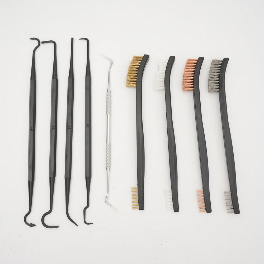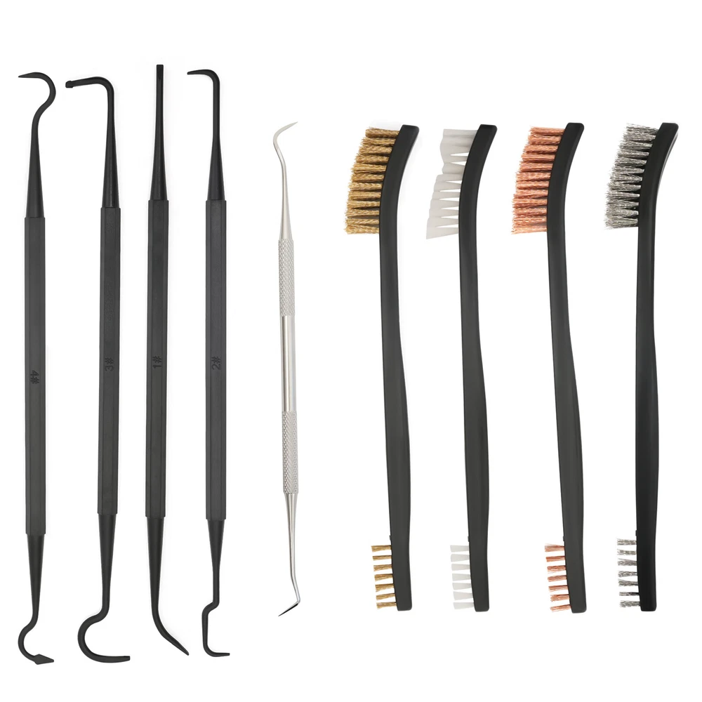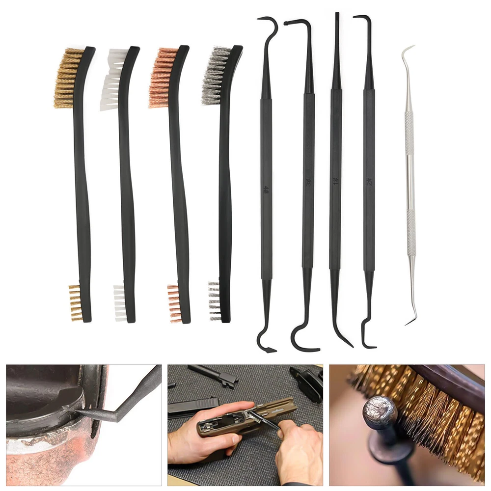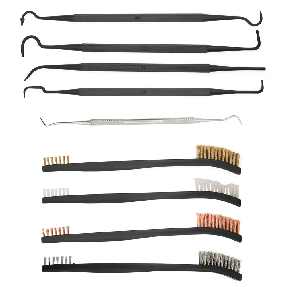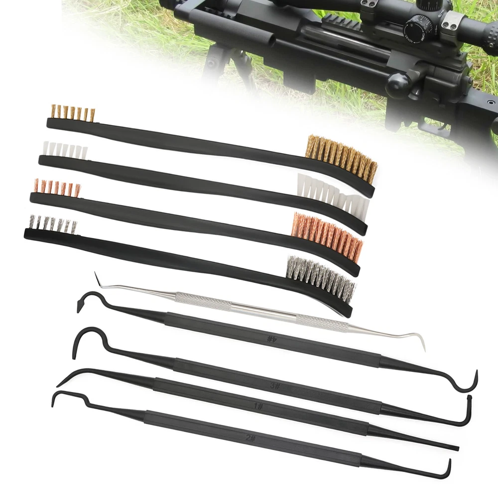 Application This set is suitable for cleaning most guns. It is suitable for hunters, police, bodyguards, soldiers, shooting galleries, troops, etc. Specification Color: Black and Silver Silver Pick Material: Stainless Steel Black Pick Material: Nylon Brushes Material: Nylon Brush Bristle Material: Copper Wire, Stainless Steel, Nylon Number of Pieces: 9 Gross Weight: 0.1kg0.22lbs Package Size: 10*2*5cm/3.9*0.8*2.0inch Package Included 4* Brushes 5* Picks 9pcs Gun Cleaning Set - 4 Double Ended Nylon/Brass Brushes & 5 Picks Maintenance Description This is a gun cleaning set that contains 4 double-ended brushes and 5 multi-function picks. The complete set is very easy to use. Moreover, 9 cleaning tools of different types can meet your different usage needs. The fine brushes and picks can clean out the dirt in the crevices of the gun and keep your gun new. It will be a good guardian of your gun! Key Features Complete Set: This set contains 5 different picks and 4 brushes, which is enough for you to clean your gun. You do not need to buy these cleaning tools separately. It is very convenient to use. Different Materials of Bristles: These brushes have different brush bristles, containing brass, stainless steel and nylon. Bristles of different hardness can be used to clean different stains for better satisfaction of your needs. Different Shapes of Picks: There are different shapes of picks such as straight, curved and slanted. You can choose the right pick to clean up according to the different shapes of gun pieces. Double-ended Design: The brush and pick are both double-ended, which means you will get double the product for the price of one. Moreover, the double-headed products can be used for a longer time. Precise Cleaning: Because of the gun's complex and precise structure, it needs our fine set to clean it. Picks of different shapes can reach many narrow places of the gun. So the thin pick and bristles can clean out the stains in the crevices of the gun precisely. Compact: The brush and picks are small and lightweight, so they are very easy to carry and store. You can easily put them in your bag. Comfortable Ergonomic Design: The brushes and picks have ergonomically designed grips in the shape of a pen, so they are very comfortable to hold. Guaranteed Customer Service: Your satisfaction is our top priority, we will make things right for you. If you are unsatisfied with our products, you can contact us and we will ensure you have a pleasant shopping experience in our store. Details Stainless Steel Pick: The silver stainless steel pick is harder and more durable than other nylon picks, so it can be used to clean the stubborn dirt off the gun. Protective Sleeves: The stainless steel pick has two protective sleeves over the cleaning needles, which prevent the needle from deforming as well as preventing it from stabbing you. Different Density Bristles: Each brush has a different bristle density at both ends, with one side lush and the other sparse. You can choose the right brush head according to your needs. Application This set is suitable for cleaning most guns. It is suitable for hunters, police, bodyguards, soldiers, shooting galleries, troops, etc. Specification Color: Black and Silver Silver Pick Material: Stainless Steel Black Pick Material: Nylon Brushes Material: Nylon Brush Bristle Material: Copper Wire, Stainless Steel, Nylon Number of Pieces: 9 Gross Weight: 0.1kg0.22lbs Package Size: 10*2*5cm/3.9*0.8*2.0inch Package Included 4* Brushes 5* Picks Notes Please allow the slight color difference caused by the shooting light and 1-3 cm error due to manual measurement, and make sure you do not mind before ordering. Payment Delivery details Terms of sales About us Contact us Payment We accept ebay payment 。 Fees such as import duties, taxes are not included in the item price or shipping costs. These charges are the buyer's responsibility. Delivery details Shipping: 2-9 working days to: USA Terms of sales We maintain high standards of excellence and strive for hundred percent customer satisfaction. Feedback is very important to us. We hope that you contact us immediately before you give neutral or negative feedback, so that we can address your concerns. It is impossible to address issues if we do not know about them! About us Your satis faction is our ultimate goal. We work hard to earn your trust and future business. Our certified technicians have tested each item before shipping. The unit comes with 1 year limited warranty on all manufacturing defects. a) If you receive a defective item, you may return it or ask for a discount. Please contact us within 14 days after you receive the package. b) What you returned must be intact and in its original packaging as re? u. Customer is responsible for shipping costs of the returned item. c) We will cover the cost of shipping back t with the shipping rate indicated in the registration page. We will send you a new unit or refund the full payment you paid. Thank you. Contact us Business Hour Business Hour: Monday To Friday: 8:30 AM to 5:00 PM (Beijing China time) Due to time zones, our reply to your questions may not be immediately. But within above working time, we will reply your email within 24 hours. If it's non-workdays, please kindly be patient and wait till Monday. Please contact us with ebay message. Please feel free to contact us if you have any questions. Monday To Friday: 8:30 AM to 5:00 PM (Beijing China time) Due to time zones, our reply to your questions may not be immediately. But within above working time, we will reply your email within 24 hours. If it's non-workdays, please kindly be patient and wait till Monday. Please contact us with ebay message. Please feel free to contact us if you have any questions. On Jan 13, 2025 at 19:49:58 PST, seller added the following information: