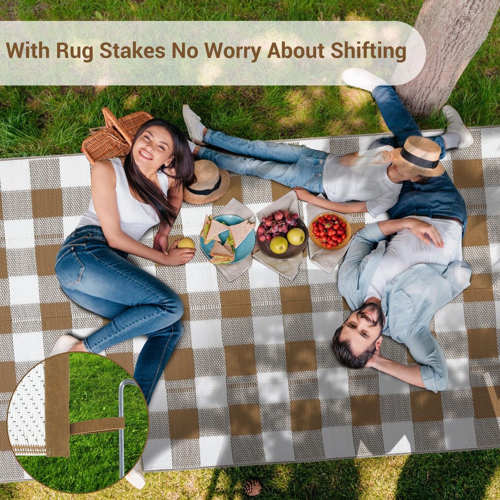 【Stain and Water Resistant】Our outdoor plastic rug features excellent stain and water-resistant properties, allowing you to enjoy picnics, camping trips, or outdoor gatherings without worries. Even accidental spills or rain won't be an issue, as this rug can easily withstand the elements. Clean-up is a breeze; simply wipe it with a damp cloth or rinse it lightly, and the rug will look as good as new, maintaining the cleanliness and beauty of your outdoor space 【Durable and Fade-Resistant】Made from 100% polypropylene, this rug ensures exceptional durability and long-lasting color vibrancy. Even with prolonged exposure to sunlight, the geometric pattern will not fade, keeping its beautiful appearance intact. Whether facing high temperatures, intense sunlight, or humid conditions, this rug stands up to the test, making it the perfect companion for your outdoor activities 【Simple Geometric Design】Our plastic straw rug features a simple geometric pattern that showcases modern style, easily blending into various outdoor environments. Whether placed in your backyard, on the patio, at the beach, or during a picnic, this design not only enhances the aesthetic appeal of the area but also creates a comfortable and stylish gathering atmosphere for you and your guests 【Lightweight and Portable for Various Uses】Designed to be lightweight and easy to carry, this rug is suitable for any outdoor activity. Whether it's a barbecue party, a beach outing, or a camping adventure, you can easily slip it into your car or backpack. Thanks to its versatility, you can enjoy a comfortable outdoor experience anytime and anywhere, fully immersing yourself in nature 【Comes with Carrying Bag and Anchoring Stakes】Each outdoor PP tube rug comes with a carrying bag and anchoring stakes for your convenience. The carrying bag allows for easy storage and transport, while the stakes help secure the rug in place during windy conditions, ensuring it stays where you want it. This thoughtful inclusion offers you additional ease and peace of mind, letting you fully enjoy every outdoor activity