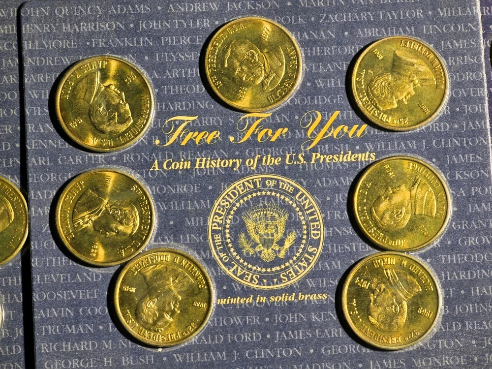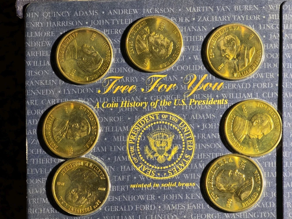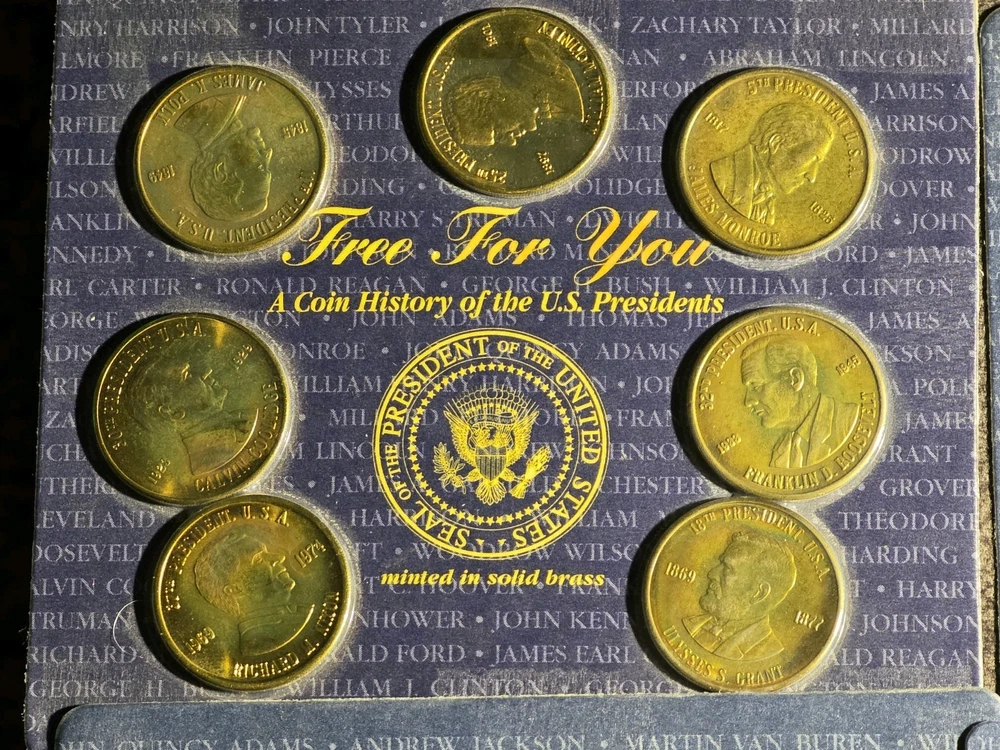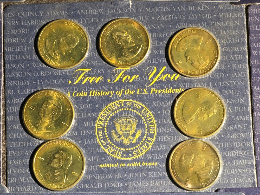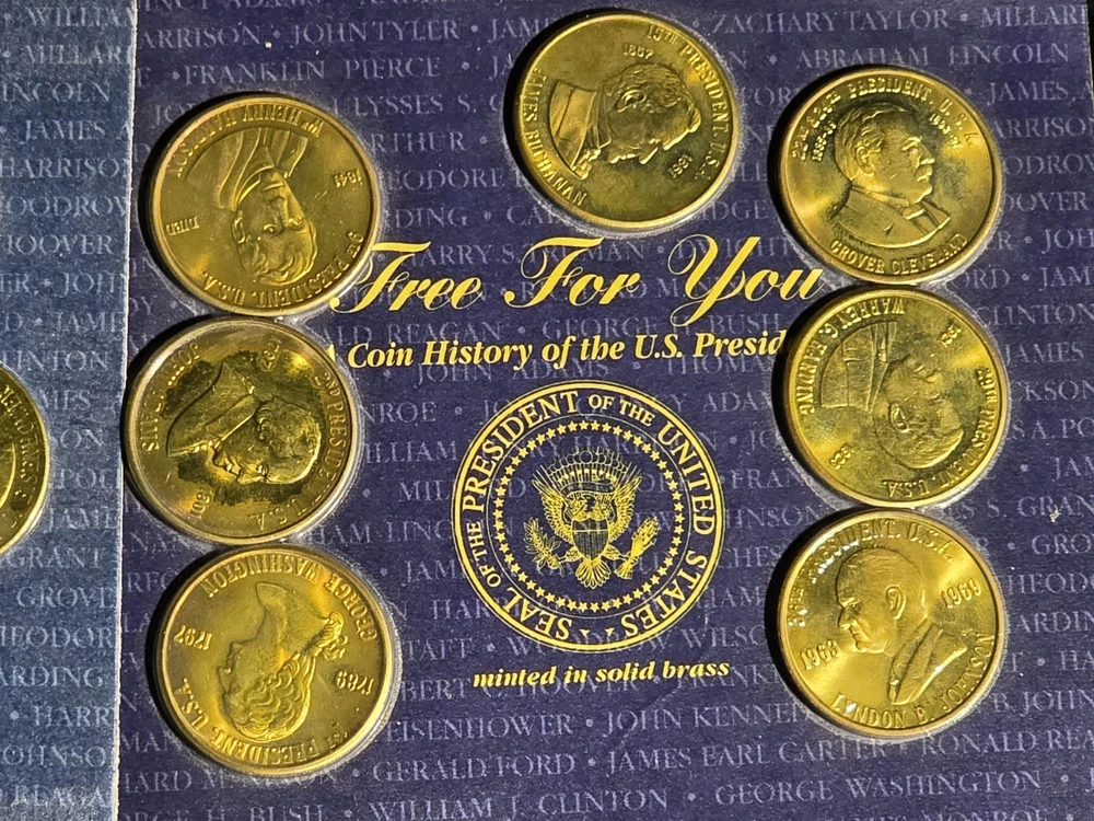 The product is >> NINE << setS of five uncirculated solid brass coins depicting US presidents, housed in a sealed container. Each coin is a unique piece of exonumia, showcasing the history and likeness of different American presidents. This collection serves as a commemorative piece for collectors or those interested in numismatics, offering a tangible connection to the past leaders of the United States. The coins are a representation of American heritage and can make for a meaningful addition to any numismatic collection.