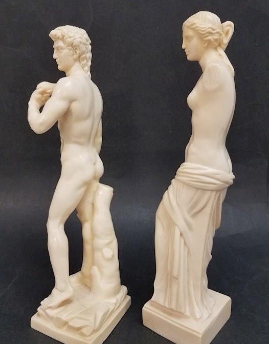 Crafted with meticulous attention to detail, the A. Santini Classic Figure Statues capture the essence of renowned artistic masterpieces, such as Michelangelo's David and the Venus de Milo. These medium-sized sculptures, designed in a figurative art style, bring a touch of timeless beauty to any space. The statuettes are rendered in a high-quality resin material and boast a limited edition status, emphasizing their exclusivity. Originating from Italy, a country synonymous with artistic innovation, these pieces reflect a contemporary take on classic themes, making them a meaningful addition to any art collection or as standalone statement pieces. In other words, they rock!