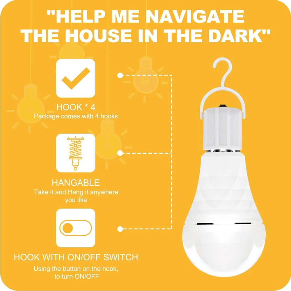Light Features A necessity and safe tool during blackout, Can work during power outage for 4-6 hours, not only for daily use, but also for like blackout, power failure, storm, hurricane ect. Perfect for candles and flashlights, lanterns. A19 size that most popular choices for light fixtures, other light bulbs on the market are often large in size that may can'fit in your light fixture, this smaller size led bulb is a more secure choice. 60 watt equivalent 5000K Daylight Light Bulb with no yellow or hues added. A great all around color that can be used anywhere. E26 base, also applies for E27 base, Just easily screw it to the right lamp and get your home lighted. With hooks for you to move it around or camping Specification Size:A19 Voltage: 85-265 V Power Output: 12W, 60 watt equivalent Lumens:750-800lm Color temperature: 5000K Daylight Applicable lamp base: E26 【Lights for Home Power Failure】 rechargeable light bulbs work as normal A19 LED bulbs and can self-charging during daily use. Each light bulb built-in 1200mAh battery backup, can provide lighting for 4-6 hours with no electricity during power outage. 4 combo pack design for 2-4 days lighting needs. 【Easy to Use & High applicability】60 watt equivalent + 5000K daylight is most popular choice for home daily use. A19 size bulb is versatile for most lamps with E26 or E27 socket. Just screw them into the socket and done! (Other light bulbs on the market are often large in size that may can't fit in your light fixture. This like the normal type A bulb, perfect for any light fixtures , like floor lamp, desk lamp, table lamp, ceiling light ect) 【A Must-have Family Survival Tool】A necessity during blackout, storm, hurricane etc. To get prepared for with this light bulbs. Say goodbye to candles that are not safe to use. You can replace your current bulb in any room, storage, basement, hallway, barn etc. 【Multi-Function】Three usage options: 1.Use as normal bulbs on daily. 2. Use with portable power cap, ideal use for outdoor activity like camping, pillow forts, reading under the covers. 3.Work as a portable flashlight during power outages. 【What You Get】Includes 2 rechargeable led light bulbs, 2 portable power caps,and 24/7 . No radiation, 80% electricity cost savings, 100% environmental friendly.