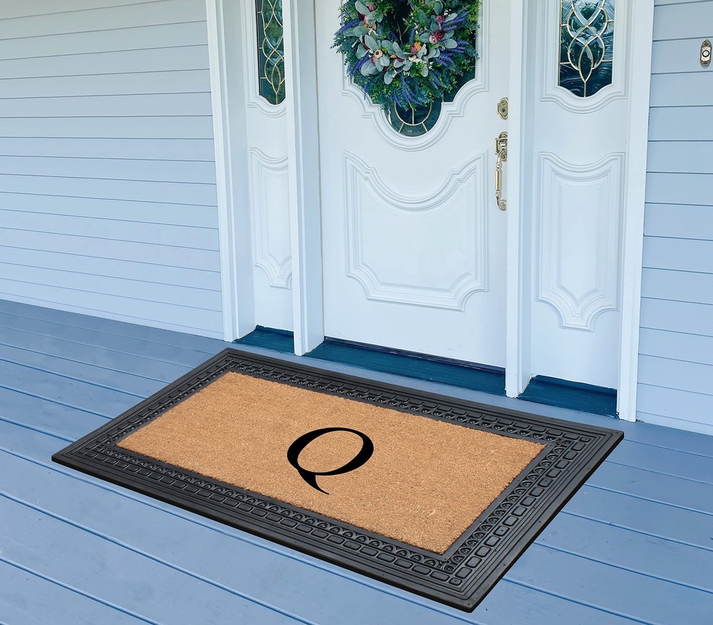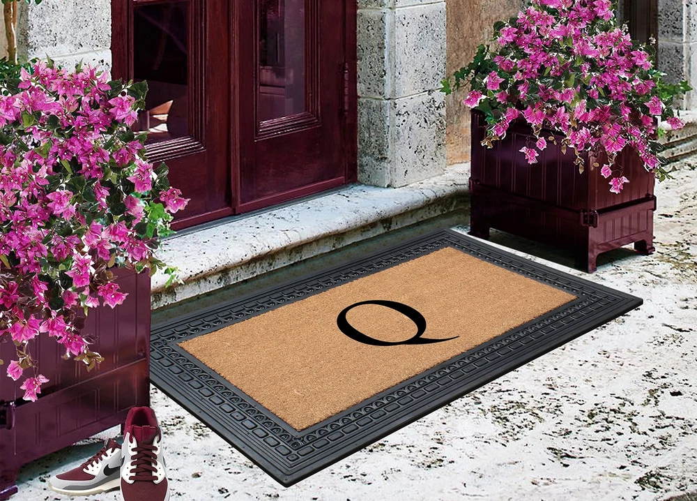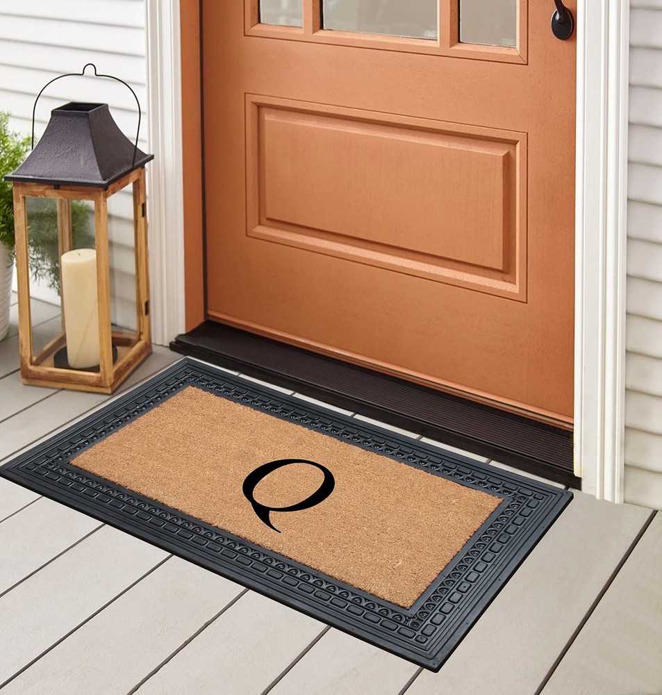 Like all of our door mats, our Monogrammed Coco Door Mat is as durable as it is beautiful. Handmade from 100% coir, an all-natural material known for its scrubbing power and resistance to the elements. Dyes saturate the fibers for vibrant color. Specify you single-letter monogram for the perfect finishing touch, or enjoy the classic border motif alone NEWLY DEVELOPED RUBBER AND COIR MONOGRAMMED DOOR MAT : This is a completely newly designed door mat, suitable for both single and double doors. The large size monogrammed door mat is made of Natural Coir fiber and high quality rubber. This coir door mat has a large coir area to clean and wipe your shoes which keeps your house clean. Molded door mats are stronger and more durable lasting thrice as long as regular door mats. Each outdoor rug is QC inspected for 20 quality check points. NATURAL COIR PILE MONOGRAMMED FRONT DOOR MAT: This Door mat is made from 100% natural coir fibers which are of the strongest fibers and they naturally trap dust and other particles. The biodegradable coir fiber material is environmentally friendly and compostable. HEAVY DOOR MAT WITH RUBBER BACKING: This Doormat is heavy weight with a solid rubber backing. This door mat doesn’t get easily blown away by wind and anchors to the ground to prevent slipping. ATTRACTIVE DESIGN AND ANTI SHED TREATED FRONT DOOR MAT: This is a personalized designed door mat and every door mat is Hand monogrammed individually in the USA. The coir portion of this door mat is treated with Anti Shed dyes to minimize shedding. The rubber molded doormat easily lasts 3 times longer than usual doormats since the rubber adds to the durability making it suitable for high traffic areas. LOW MAINTENANCE OUTDOOR MAT: Coconut coir is naturally resistant to unwanted substance, making this the most low-maintenance door mat possible.