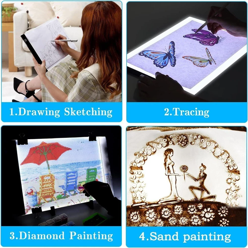 CONTACT US DIRECTLY FOR FREE & PREPAID RETURNS A4 Light Pad 5d Art Supplies Diamond Painting Cross Stitch Tools Accessories Kit A4 Light Pad 5D Art Supplies Diamond Painting Cross Stitch Tools Accessories Kit Free Fast Shipping 【Perfect Diamond Painting LED Light Pad Kit】You don't need to look for dazzling gadgets in the market, upgrade diamond painting accessories specially added 2 storage boxes, this diamond painting LED light pad kit can meet all your needs. The rich combination is enough to meet the needs of any beginners, hobbyists, or professionals. 【A4 Diamond Painting Light Pad】 LED Copy Board have three levels to adjust brightness, you can choose low-middle-high level to adjust brightness by pressing the button. Just touch simple switch design, turn on/off. Flicker-free and High-quality LED, advanced vision protection technology, make your eyes no longer pain after long hours of work. 【Complete Diamond Painting Tools】 Comes with 1 x A4 LED Light Pad, 1 x Light Pad Stand, 1 x USB Cable, 2 x 28 Slots Storage Box, 4 x Clips, 3 x Plastic Trays, 20 x Reclosable Bag,1 x Diamond painting roller, 1 x Tweezers, 20 x Glue Clay, 1 x 64 Blank Sticker, 5 x Diamond Painting Pens (5 different type), 4 x EVA pen cover,1 x Diamond Painting Fixing Tool,1 x Storage bag, which can meet all diamond art accessories that you need. 【Easy to Use】Lightweight and portable light pad,thickness only 0.2inch, about 5mm.It's powered by a USB cord, compatible with a USB rechargeable battery or a plug in adapter. you can plug the USB cable into the computer, mobile power or directly connect to any USB port of the wall outlet. 【Wide Application】The uses are endless, beyond your imagination! LED Light Board is perfect idea for Diamond Painting, stenciling, 2D animation, calligraphy, embrossing, scrapbooking, tattoo tracking, sketching & drawing, streaming, sewing projects, embroidery craft projects , fabric design, photograph , film , slider transferring , architecture , drawing etc. A4 Light Pad 5D Art Supplies Diamond Painting Cross Stitch Tools Accessories Kit REVIEWS The product came very well packaged. I'm very happy. thank you for everything. Seller strongly recommended. This is great! I definitely recommend! Product looks amazing Delivery was fast. Excellent seller, great communication. I advise everyone
