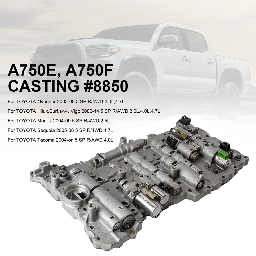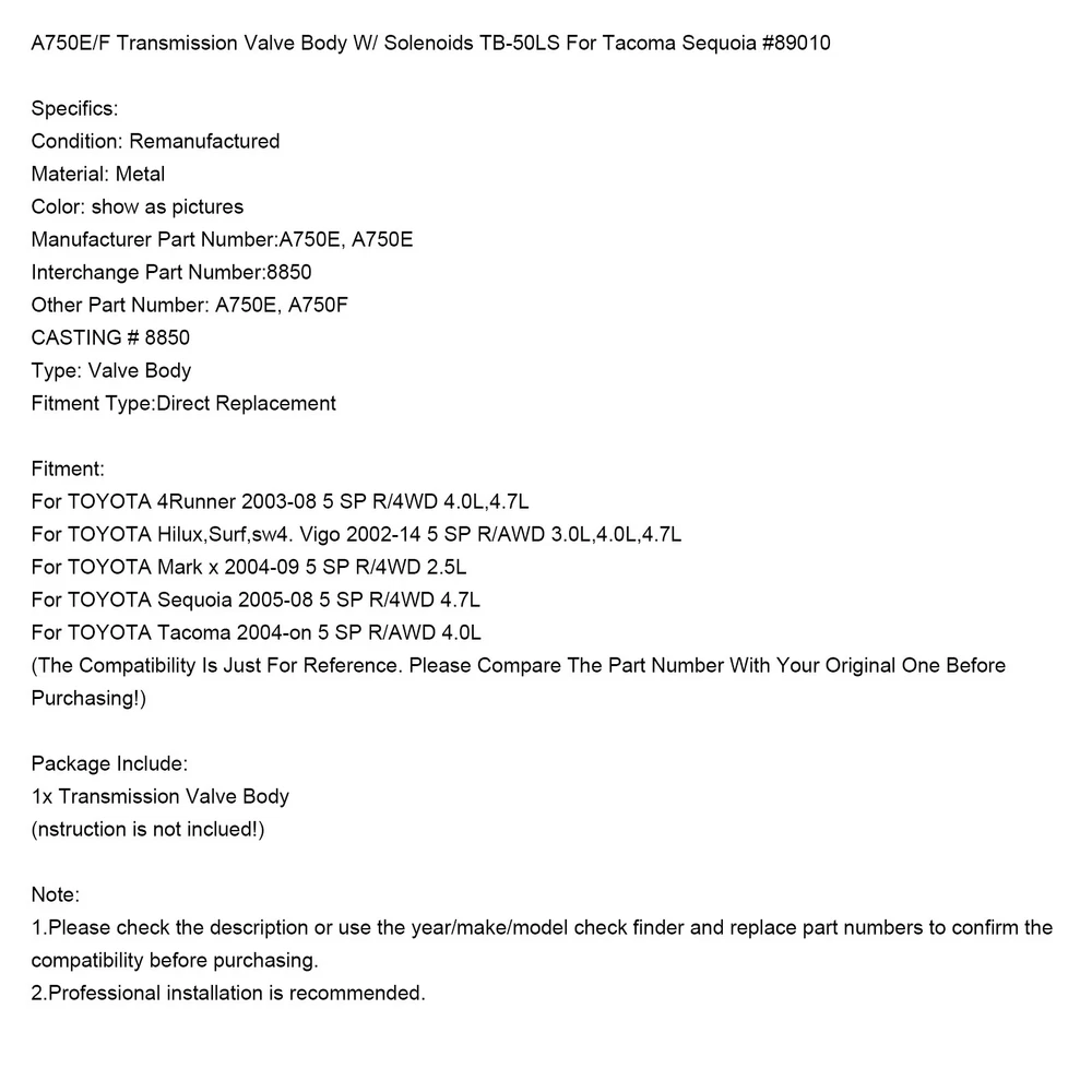 CNC Adjustable Kickstand Side Stand Fit HONDA CBR 600 1000 RR 600RR 1000RR 35.99 USD Free shipping Air Filter Cleaner For Motorcycle Sportster 1200 Custom XL1200C Low XL883L USA 28.13 USD Free shipping 50x Small M5 5mm Motorcycle Fairing Spring Clips Speed Spire Nuts Clip U Nut 16.79 USD Free shipping ABS Anti-Lock Brake Pump Assembly 57110-T2F-L22 for Honda Accord Sport 2.4L 2014 582.79 USD Free shipping All Three Catalytic Converter Flex Y-Pipe Fits For Nissan Maxima 3.5L 2009-2014 175.87 USD Free shipping 0B5 DL501 Transmission Valve Body For Audi VW Porsche 629.99 USD Free shipping 116PCS Allen Screw & washer kit For Sportster XL 883/1200 2004+ Engine Covers 44.69 USD Free shipping FUEL PUMP FUSE RELAY fit for Yamaha YZF R1 R6 FZ1 Fazer FZ8-N Naked 5VK-81950-40 28.99 USD Free shipping 50cc Cylinder Piston Gasket Kit For Yamaha YW50F YW50FX Zuma 50F 4T 2012-2019 58.7 USD 61.79 USD Free shipping 5% off Pulsing Electrical Coil AM105573 AUC15118 For John Deere 325 335 345 425 445 455 24.92 USD Free shipping Gbox Detent Kit for Porsche Transmission 996 997GT3 Boxster S Fixes 2ND Gear WR 18.99 USD Free shipping Fuel Return Line Hose Pipe Injector Hose Leak Line Fit BMW 3 5 6 7 X3 X5 X6 48.79 USD Free shipping A Fantastic Shop Send us a message Our Store Seller Profile Feedbacks Save this seller Contact A750E/F Transmission Valve Body W/ Solenoids TB-50LS For Tacoma Sequoia #8850 A750E/F Transmission Valve Body W/ Solenoids TB-50LS For Tacoma Sequoia #8850 Feature: 1: According to the original factory specifications,perfect match for the original car. 2: Own different test machines to design exact accurate parameter for our products.All items were tested for performance. 3: Made by high quality material, lightweight, anti-rust, colorfast and durable. 4: Aftermarket product with premium quality. 5: Stable performance, high reliability,suitable for replacing your broken one. Specifics: Condition: Remanufactured Material: Metal Color: show as pictures Manufacturer Part Number:A750E, A750E Interchange Part Number:8850 Other Part Number: A750E, A750F CASTING # 8850 Type: Valve Body Fitment Type:Direct Replacement Fitment: For TOYOTA 4Runner 2003-08 5 SP R/4WD 4.0L,4.7L For TOYOTA Hilux,Surf,sw4. Vigo 2002-14 5 SP R/AWD 3.0L,4.0L,4.7L For TOYOTA Mark x 2004-09 5 SP R/4WD 2.5L For TOYOTA Sequoia 2005-08 5 SP R/4WD 4.7L For TOYOTA Tacoma 2004-on 5 SP R/AWD 4.0L (The Compatibility Is Just For Reference. Please Compare The Part Number With Your Original One Before Purchasing!) Package Include: 1x Transmission Valve Body (Instruction is not inclued!) Note: 1.Please check the description or use the year/make/model check finder and replace part numbers to confirm the compatibility before purchasing. 2.Professional installation is recommended. About US About Our Items We strive to describe all items accurately and thoroughly, with the utmost care and attention to detail. However, to ensure a mutually satisfactory transaction, we kindly ask for your assistance in thoroughly reviewing the item description and photos, and addressing any questions before placing a bid. Customer Satisfaction We stand behind our commitment with exceptional service, a 100% money-back guarantee, and a dedication to customer satisfaction. I am readily available to address any inquiries or concerns you may have, both before and after your purchase. Our aim is to ensure your shopping experience is enjoyable and that you're delighted with your purchase. Feedback Your feedback is crucial to our business's success. If you're satisfied with your purchase and the service you received, we would greatly appreciate your positive feedback, along with an overall Detailed Selling Rating (DSR) of 5. Please take a moment to leave us positive feedback. Our eBay account is set up to automatically reciprocate positive feedback once yours is received. If you're considering leaving neutral/negative feedback or opening an eBay/PayPal case, we encourage you to reach out to us immediately. We're committed to resolving any issues to the best of our ability. Shipping Parcel will be shipped using Standard shipping method. For security purposes, items will be shipped exclusively to the confirmed address on Paypal. Please ensure your Shipping address is up to date before proceeding with payment. Estimated delivery time within the United States ranges from 3 to 10 business days, depending on your location. Returns We accept returns within 60 days from the date the buyer receives the item. If the item is found to be defective upon receipt, the customer has up to 30 days from the date of receipt to request an exchange for a new item or a refund. For returns due to a change of mind, we accept items in their original selling condition. However, if the package has been opened due to a mistaken order, it does not qualify for our return policy. Please note that the buyer is responsible for covering the cost of return postage. If you encounter any issues, please reach out to us via eBay message, and we'll respond within 24 hours. U760E U760 TOYOTA RAV4 Transmission Valve Body For Toyota Camry RAV4 269.87 USD Free shipping 901064 K110 K111 K112 CVT Transmission Chain Belt For TOYOTA RV4 167.87 USD Free shipping 02E Automatic Trans 6 Speed DSG Clutch Repair Kit For VW Audi MK5 MK6 TDI 2.0T 299.87 USD Free shipping 6pc Set 4L60E Trans Master Solenoid Kit Fits For GM EPC Shift 2003-2024 89.87 USD Free shipping 24227747 Transmission TCC PWM Lock Up Solenoid 4L60E 4T65E 5L40E For GM 96-12 YU 31.87 USD Free shipping U150 U151 U250 Transmission Valve Body 7 Solenoid For Toyota Lexus 2004-2014 312.87 USD Free shipping 7PCS 6R80 Transmission Valve Body Solenoid Kit For Ford F-150/Expedition 109.87 USD Free shipping 10R80 Transmission Valve Body Control Assembly For Ford F-150 HL3Z-7A100-B 2017 449.99 USD Free shipping 6F50 6F55 Auto Transmission Valve Body For FORD LINCOLN MERCURY 6-Speed 199.87 USD Free shipping 09D 09D325039A TR60SN Valve Body with Solenoid For Audi Q7 VW T