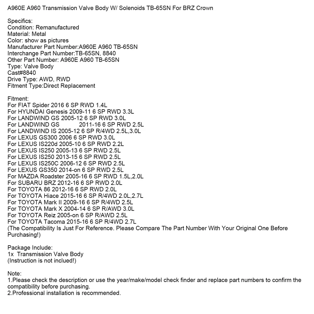 50x Small M5 5mm Motorcycle Fairing Spring Clips Speed Spire Nuts Clip U Nut 16.79 USD Free shipping Air Filter Cleaner For Motorcycle Sportster 1200 Custom XL1200C Low XL883L USA 28.13 USD Free shipping ABS Anti-Lock Brake Pump Assembly 57110-T2F-L22 for Honda Accord Sport 2.4L 2014 582.79 USD Free shipping CNC Adjustable Kickstand Side Stand Fit HONDA CBR 600 1000 RR 600RR 1000RR 35.99 USD Free shipping Gbox Detent Kit for Porsche Transmission 996 997GT3 Boxster S Fixes 2ND Gear WR 18.99 USD Free shipping Traction Side Tank Pad Gas Knee Grip For Honda CBR1000RR 08-13 CBR600RR 03-06 ⏳ 11.87 USD Free shipping 0B5 DL501 Transmission Valve Body For Audi VW Porsche 629.99 USD Free shipping 67mm Cylinder Jug Top End Piston Gaskets Kit for Yamaha YFM200 Moto 4 1985-1989 97.99 USD Free shipping 6L80 6L90 Transmission Rebuild 1-2-3-4 3-5-Reverse Clutch Seals Pack O-Rings 21.99 USD Free shipping 116PCS Allen Screw & washer kit For Sportster XL 883/1200 2004+ Engine Covers 44.69 USD Free shipping All Three Catalytic Converter Flex Y-Pipe Fits For Nissan Maxima 3.5L 2009-2014 175.87 USD Free shipping Fuel Return Line Hose Pipe Injector Hose Leak Line Fit BMW 3 5 6 7 X3 X5 X6 48.79 USD Free shipping A Fantastic Shop Send us a message Our Store Seller Profile Feedbacks Save this seller Contact A960E A960 Transmission Valve Body W/ Solenoids TB-65SN For BRZ Crown A960E A960 Transmission Valve Body W/ Solenoids TB-65SN For BRZ Crown Feature: 1: According to the original factory specifications,perfect match for the original car. 2: Own different test machines to design exact accurate parameter for our products.All items were tested for performance. 3: Made by high quality material, lightweight, anti-rust, colorfast and durable. 4: Aftermarket product with premium quality. 5: Stable performance, high reliability,suitable for replacing your broken one. Specifics: Condition: Remanufactured Material: Metal Color: show as pictures Manufacturer Part Number:A960E A960 TB-65SN Interchange Part Number:TB-65SN, 8840 Other Part Number: A960E A960 TB-65SN Type: Valve Body Cast#8840 Drive Type: AWD, RWD Fitment Type:Direct Replacement Fitment: For FIAT Spider 2016 6 SP RWD 1.4L For HYUNDAI Genesis 2009-11 6 SP RWD 3.3L For LANDWIND GS 2005-12 6 SP RWD 3.0L For LANDWIND GS 2011-16 6 SP RWD 2.5L For LANDWIND IS 2005-12 6 SP R/4WD 2.5L,3.0L For LEXUS GS300 2006 6 SP RWD 3.0L For LEXUS IS220d 2005-10 6 SP RWD 2.2L For LEXUS IS250 2005-13 6 SP RWD 2.5L For LEXUS IS250 2013-15 6 SP RWD 2.5L For LEXUS IS250C 2006-12 6 SP RWD 2.5L For LEXUS GS350 2014-on 6 SP RWD 2.5L For MAZDA Roadster 2005-16 6 SP RWD 1.5L,2.0L For SUBARU BRZ 2012-16 6 SP RWD 2.0L For TOYOTA 86 2012-16 6 SP RWD 2.0L For TOYOTA Hiace 2015-16 6 SP R/4WD 2.0L,2.7L For TOYOTA Mark II 2009-16 6 SP R/4WD 2.5L For TOYOTA Mark X 2004-14 6 SP R/AWD 3.0L For TOYOTA Reiz 2005-on 6 SP R/AWD 2.5L For TOYOTA Tacoma 2015-16 6 SP R/4WD 2.7L (The Compatibility Is Just For Reference. Please Compare The Part Number With Your Original One Before Purchasing!) Package Include: 1x Transmission Valve Body (Instruction is not inclued!) Note: 1.Please check the description or use the year/make/model check finder and replace part numbers to confirm the compatibility before purchasing. 2.Professional installation is recommended. About US About Our Items We strive to describe all items accurately and thoroughly, with the utmost care and attention to detail. However, to ensure a mutually satisfactory transaction, we kindly ask for your assistance in thoroughly reviewing the item description and photos, and addressing any questions before placing a bid. Customer Satisfaction We stand behind our commitment with exceptional service, a 100% money-back guarantee, and a dedication to customer satisfaction. I am readily available to address any inquiries or concerns you may have, both before and after your purchase. Our aim is to ensure your shopping experience is enjoyable and that you're delighted with your purchase. Feedback Your feedback is crucial to our business's success. If you're satisfied with your purchase and the service you received, we would greatly appreciate your positive feedback, along with an overall Detailed Selling Rating (DSR) of 5. Please take a moment to leave us positive feedback. Our eBay account is set up to automatically reciprocate positive feedback once yours is received. If you're considering leaving neutral/negative feedback or opening an eBay/PayPal case, we encourage you to reach out to us immediately. We're committed to resolving any issues to the best of our ability. Shipping Parcel will be shipped using Standard shipping method. For security purposes, items will be shipped exclusively to the confirmed address on Paypal. Please ensure your Shipping address is up to date before proceeding with payment. Estimated delivery time within the United States ranges from 3 to 10 business days, depending on your location. Returns We accept returns within 60 days from the date the buyer receives the item. If the item is found to be defective upon receipt, the customer has up to 30 days from the date of receipt to request an exchange for a new item or a refund. For returns due to a change of mind, we accept items in their original selling condition. However, if the package has been opened due to a mistaken order, it does not qualify for our return policy. Please note that the buyer is responsible for covering the cost of return postage. If you encounter any issues, please reach out to us via eBay message, and we'll respond within 24 hours. U760E U760 TOYOTA RAV4 Transmission Valve Body For Toyota Camry RAV4 269.87 USD Free shipping U150 U151 U250 Transmission Valve Body 7 Solenoid For Toyota Lexus 2004-2014 312.87 USD Free shipping 7PCS 6R80 Transmission Valve Body Solenoid Kit For Ford F-150/Expedition 109.87 USD Free shipping 901064 K110 K111 K112 CVT Transmission Chain Belt For TOYOTA RV4 167.87 USD Free shipping 02E Automatic Trans 6 Speed DSG Clutch Repair Kit 