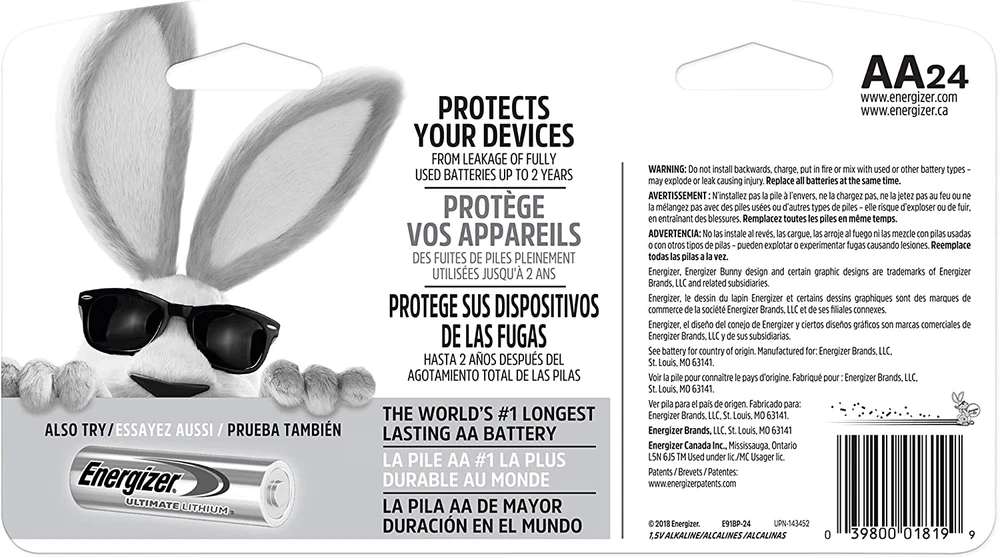 24 Pack of Energizer MAX alkaline AA batteries Our Longest Lasting MAX AA battery powers everyday devices Power for your nonstop family’s must have devices like toys, flashlights, clocks, remotes, and more Long-lasting power and innovation is what the Energizer MAX family is all about. Meet our longest-lasting AA and AAA Energizer MAX batteries yet. They also hold their power for up to 10 years while in storage, so you have power when you need it most. Plus, the AA and AAA sizes are designed to protect devices from leakage of fully used batteries up to 2 years. So, when it comes to toys, digital cameras, and other valuable devices, you can feel confident knowing you have the long-lasting power and protection you expect from Energizer. Energizer will repair or replace, at our option, any device damaged by leakage from Energizer MAX Alkaline batteries either during the life of the battery or within two years following the full use of the battery. If exact replacement is not available, devices may be replaced with a product of comparable market value at the time of claim. Leaking battery and damaged device must be provided to Energizer as proof of claim. Energizer reserves the right to deny claims of damage caused by misuse or modification of the batteries or device.