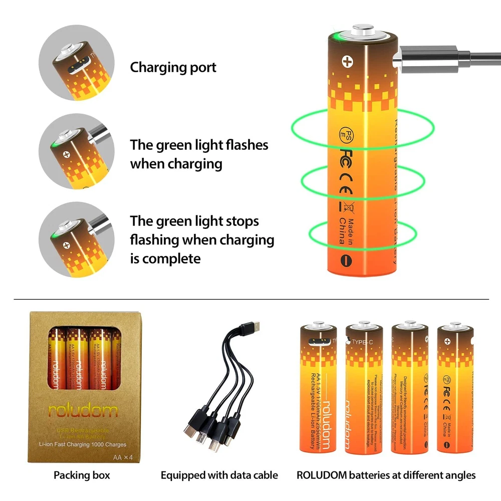 Why Should Choose Lithium Ion Rechargeable Batteries? 1.The Advantages of Lithium-ion Batteries Are Large Capacity And Constant Operating Voltage. 2600 mWh AA batteries 1.5V USB-C rechargeable aa batteries.This Type C Port Charging Rechargeable Battery Only Plug a USB-C Cable Into A Port On The Side Of The Battery To Charge. 2.Widely Used: AA lithium batteries are widely used in household devices like toys, remote controls, flashlights, alarm-clock, wireless mouse, toothpaste, and other devices that need batteries aa size. 3.High Safety, Safe Fast Charging And Discharging. Lithium-Ion Batteries Have The Characteristics Of Resistance To Short Circuit, Resistance To Overcharge, Over-discharge, Shock Resistance, Vibration Resistance, Acupuncture, No Fire, No Explosion, Etc 4.The Lithium-ion Battery Has Excellent High And Low-temperature Discharge Performance, Can Work At -20ˉ+60℃, And Its High-temperature Discharge Performance. 5.Long Cycle Life. Lithium-ion Batteries Use Carbon Anodes. During The Charging And Discharging Process, The Carbon Anodes Will Not Generate Dendrite Lithium, Which Can Prevent The Battery From Being Damaged Due To The Short Circuit of Internal Dendrite Lithium. After 1200 Times of Continuous Charging And Discharging, The Battery Capacity Will Still Not Be Lower Than 70% of The Rated Value, And It is Economical For Long-term Use. 6.No Pollution. The Battery Does Not Contain Harmful Substances Such As Cadmium, Lead And Mercury, And Is A Clean "Green" Energy Source. 7.Small Size, Light Weight, High Specific Energy. No Memory Effect. It Can Be Used Repeatedly At Any Time, Especially In Wartime And Emergency Situations, Showing Its Excellent Performance. 8.These New Stylish Type C Port Charging Lithium-Ion Batteries Are Also Better Than The Older Style Rechargeable Battery Which Required a Normal Multi-function Lithium Battery Charger. Package include: 4 x AA Rechargeable Lithium Ion Batteries ♥[Rechargeable and Money-Saving]: 2600 mWh AA batteries 1.5V USB-C rechargeable aa batteries, The 4 Packs High-capacity Lithium-Ion AA Batteries Can Provide Almost The Same And Stable Voltage Until The Entire Battery Is Exhausted. Compatible with various 1.2-1.5V devices. Our goal is to help you save money and get a green life. ♥[Rechargeable and Money-Saving]: 2600 mWh AA batteries 1.5V USB-C rechargeable aa batteries, The 4 Packs High-capacity Lithium-Ion AA Batteries Can Provide Almost The Same And Stable Voltage Until The Entire Battery Is Exhausted. Compatible with various 1.2-1.5V devices. Our goal is to help you save money and get a green life. ♥[1 Hour USB-C Fully Fast Charged]: USB-C Port Fast Charged can save your time, The aa lithium battery can be easily charged; no additional charger or adapter is required. The LED indicator clearly shows the charging progress, and the lithium batteries aa can be easily charged through the power bank of the adapter, laptop USB port, and USB cable. ♥[ENERGY SAVING & ECO FRIENDLY USB BATTERY]: The lithium ion battery can be charged up to 1200 cycles, which is more environmentally friendly. After three years of non-use, aa lithium battery can maintain 80% of the initial capacity; each battery can store 85% of the initial capacity after being produced in the factory. ♥[Multiple safety protection]: Designed by high-quality intelligent lithium battery chip, through innovative technology to transfer the working voltage from 3.7V battery chip to 1.5V, aa lithium battery maintain a constant working voltage of 1.5V, battery charger aa can improve the charging efficiency, outstanding charging Long maintenance life, automatic safety function, overcharge protection.