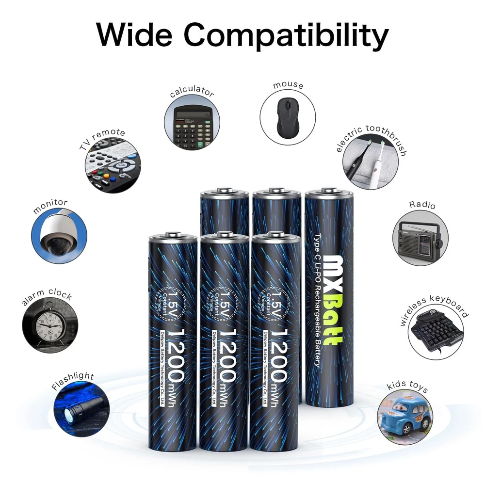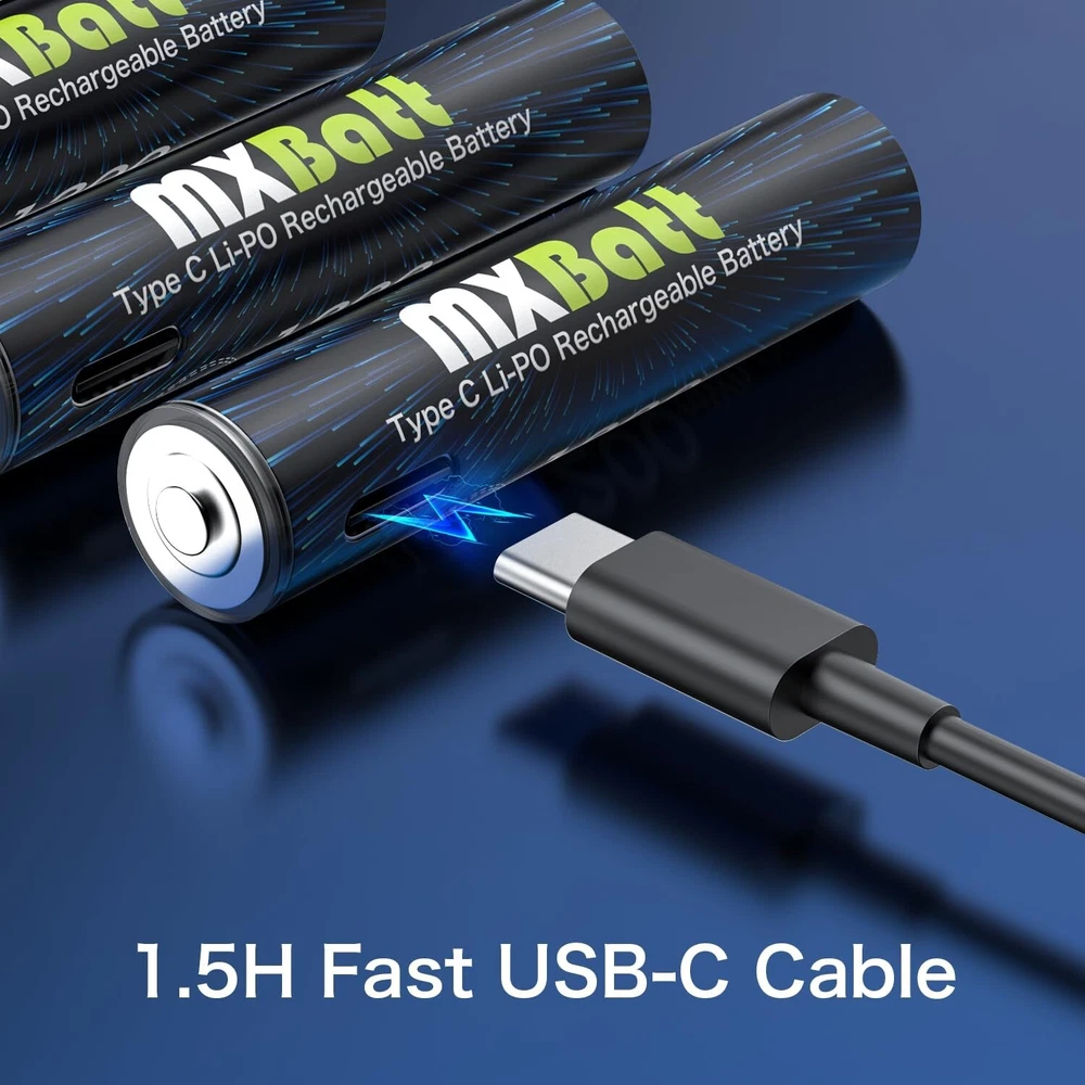 AAA Rechargeable Battery USB C 1.5V 1200mWh High Capacity,Rechargeable AAA Batteries Lithium 6-Pack with USB C Port Cable 1500 Cycles Product Details Size: LD-USB-6AAA Brand: MXBatt UPC: 753775359995 EAN: 0753775359995 MPN: Does not apply Number of Batteries: 6 AAA batteries required. Brand: MXBatt Battery Cell Composition: Lithium Polymer Compatible Phone Models: NO Recommended Uses For Product: Flashlights, Camera, Clock Package Dimensions: 4.25 x 3.86 x 0.87 inches Item Weight: 2.39 ounces Batteries: 6 AAA batteries required. Date First Available: July 18, 2023 Manufacturer: Delipow Country of Origin: China 1200mWh AAA Rechargeable Batteries: MXBatt aaa rechargeable battery usb c 1200mWh high capacity can offer at least 30% longer time than other AAA batteries, All of MXBatt rechargeable batteries are pre-charged, ready to use once received Direct USB-C Charging: New design with USB C Port on the AAA batteries, easily to charge, and they are powered up quickly when you are on the go, at work, home or traveling 1.5V Constant Voltage : The MXBatt rechargeable aaa batteries lithium ion are suitable for equipment with strict voltage devices. Charged AA lithium batteries maintain 1.5V under 100% to 0% capacitance Low Self Discharge:The use of MXBatt aaa rechargeable battery 1.5V can be charged 1500 times, energy saving fully charged can be stored for one and two months Attentive Service : If you have problem with our product , please feel free to contact us , we will reply you in 24 hours and provide you a 100% satisfactory solution