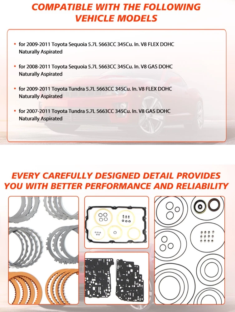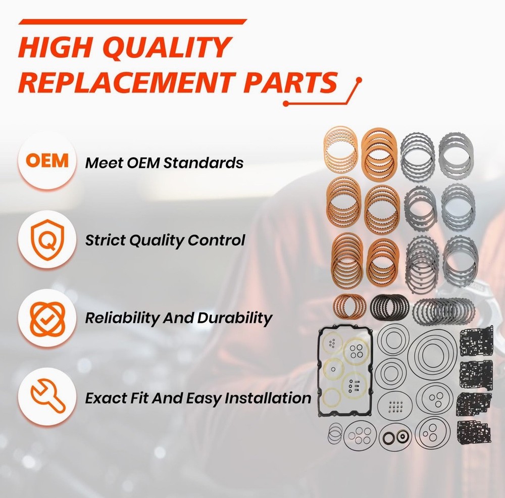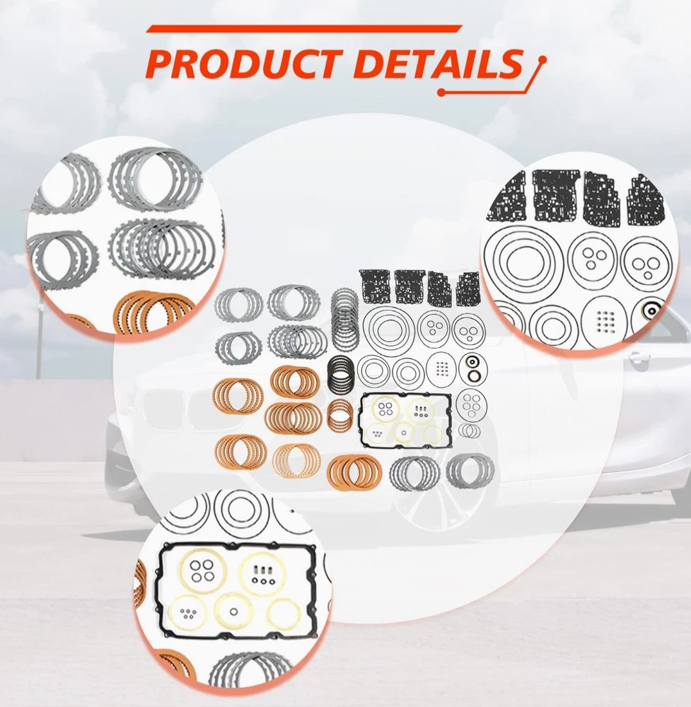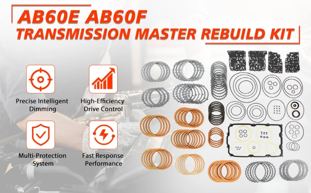 #3025 AB60E AB60F Transmission Master Rebuild Kit, Compatible with Sequoia Tundra V8 5.7L 2007-2011, Automotive Transmission Rebuild Overhaul Set with Friction Plate Steel Plates Replaces Parts 【Part Number】AB60E AB60F Transmission Master Rebuild Kit with Friction Kit Gasket Seal. 【Compatible With】For Sequoia Tundra V8 5.7L 2007-2011. Please read our product descriptions and pictures carefully to ensure that the model is the same as your needs, so as not to waste your precious time by placing a wrong order. 【Smooth Gear Shifting Without Jerking】The fit between friction plates and steel plates is precisely calibrated for stable and reliable friction performance. Combined with a scientifically designed inter-plate gap, it ensures seamless and natural gear transitions, eliminating shifting shocks and jolts, and greatly enhancing daily driving comfort. 【Superior Sealing Protection】Our transmission rebuild kit comes with high-quality seals and interface gaskets that deliver excellent sealing performance. It effectively prevents transmission oil leakage and blocks external contaminants from entering the interior, avoiding component contamination or corrosion, and ensuring the transmission operates stably in an optimal condition at all times. 【High Compatibility&Easy Installation】Manufactured strictly in accordance with universal standards, the components feature precise dimensions that perfectly match original equipment specifications. The complete kit includes all core parts required for a major overhaul, eliminating the need for additional purchases. This simplifies the repair and installation process, saving both labor costs and time. What's in the box Overhaul kit Friction plates kit Steel plates kit Why Choose YDMON Precision Craftsmanship : Utilizing cutting-edge manufacturing technology, each part undergoes rigorous testing to deliver exceptional performance. Client Assistance Service: Our professional service team is always ready to answer your questions and provide personalized advice and support. High Cost-Effectiveness : Experience premium quality at an affordable price, helping you effectively reduce vehicle maintenance costs. Transmission Master Rebuild Kit Our Transmission Master Rebuild Kit can repair and upgrade the transmission, enhancing the transmission efficiency, making gear shifting smoother, and reducing power transmission losses. With strong durability, the kit can effectively extend the service life of the transmission, decrease the probability of malfunctions, and ensure the stable operation of the vehicle. OE Part Number AB60E AB60F Product Condition Brand New & High Quailty