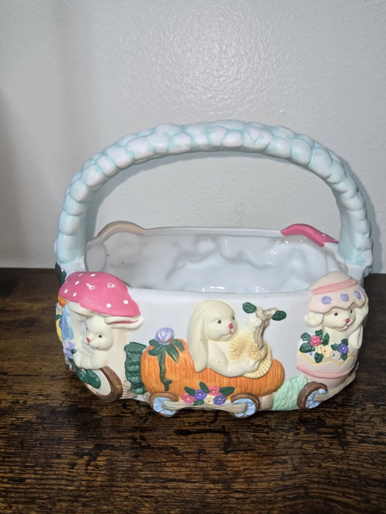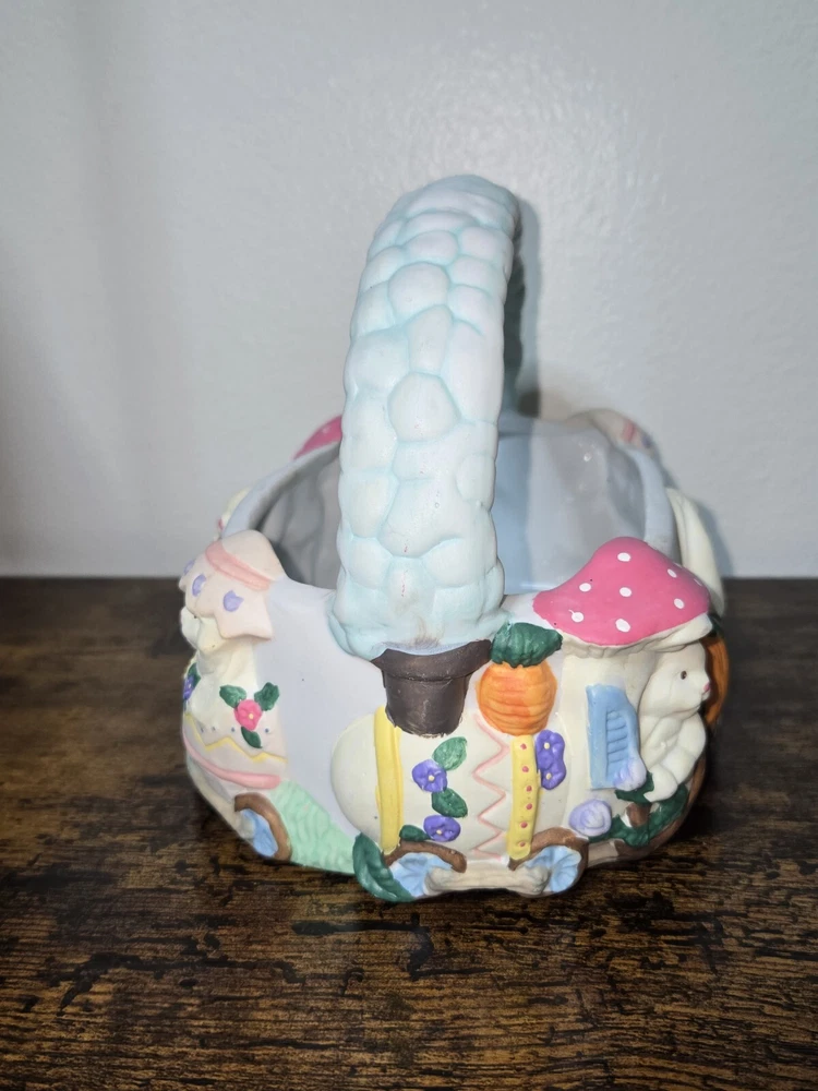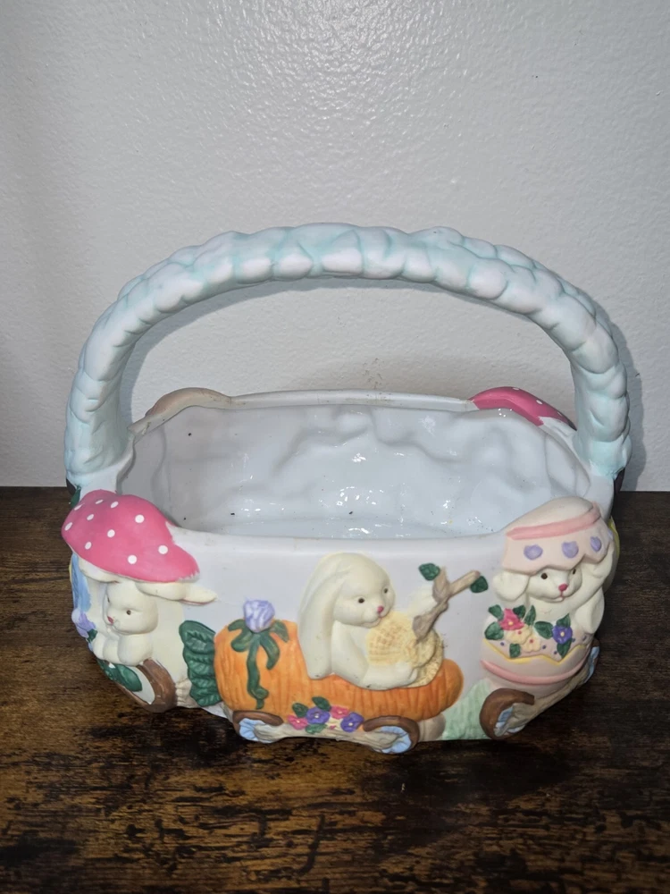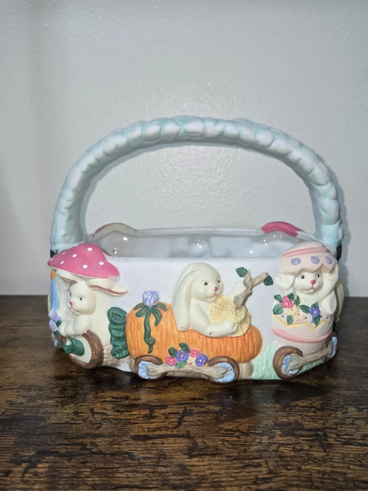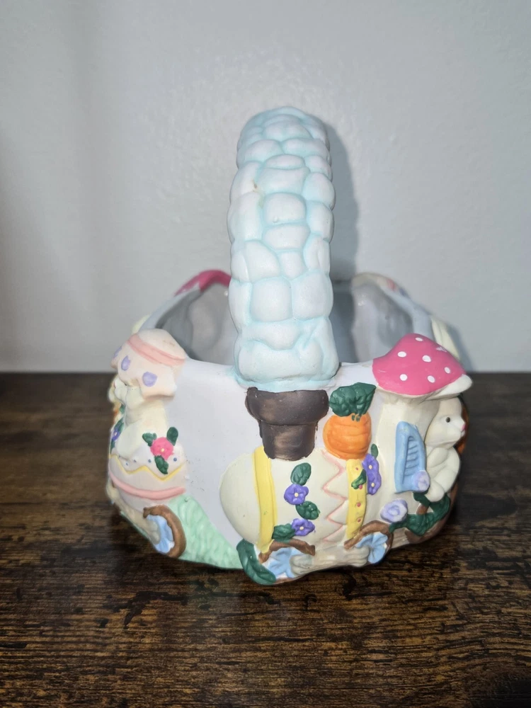 Celebrate Easter with a touch of nostalgia using the Vintage ABC Distributing 1995 Ceramic Blue Easter Basket, adorned with charming bunny decorations. This collectible piece from 1995 brings a festive and whimsical vibe to your holiday decor, perfect for those who appreciate retro aesthetics. Crafted with care, the basket boasts a vibrant multicolored design that captures the spirit of the season. Ideal for adding to your collection of holiday memorabilia or as a unique centerpiece for your Easter table, this ceramic treasure from ABC Distributing Inc. is sure to spark conversation and fond memories.