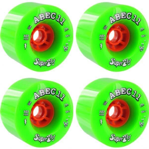 ABEC 11 Superfly Skateboard Wheels Love to cruise? These brand new ABEC 11 wheels are built to last! Measuring 107mm in diameter and 74a in hardness, they pack a super smooth ride. Over gravel or while you film that dope skate video that'll put you on the map (go ahead - all of us at Warehouse Skateboards will wait), these softer wheels help you dominate like a smooth operator. ABEC 11 Superfly Skateboard Wheels are sold in (1) set of four (4) wheels. Note: Bearings not included. Features: One (1) set of 107mm ABEC 11 Superfly Skateboard Wheels; includes four (4) wheels Diameter: 107mm Durometer: 74a Color: Lime