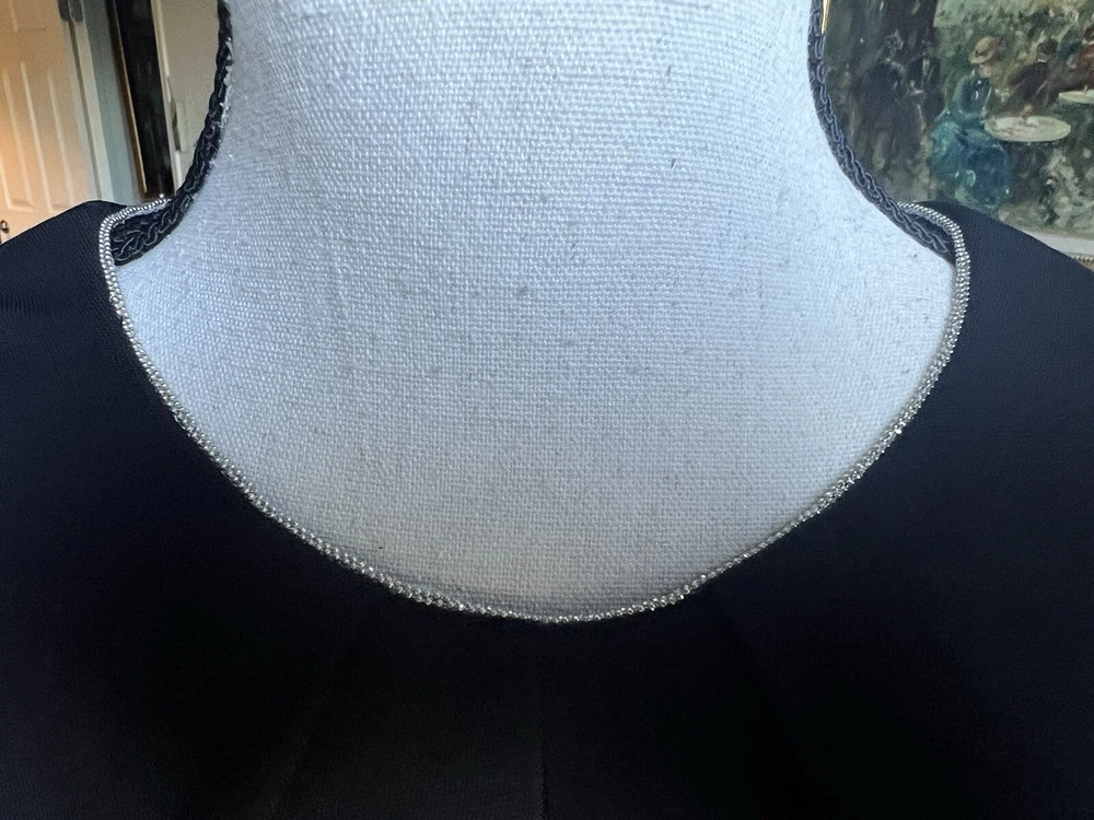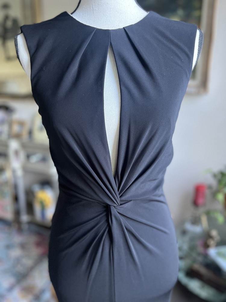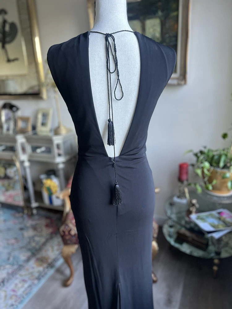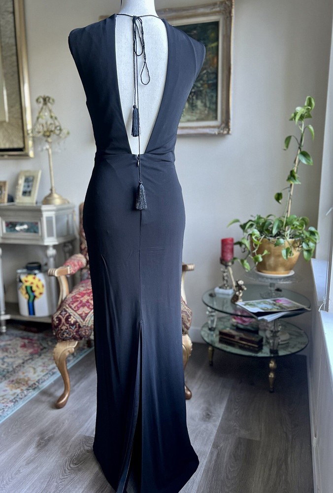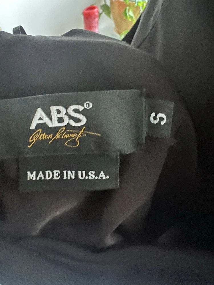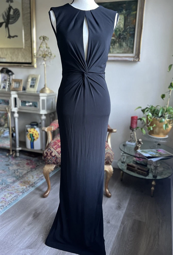 This stunning ABS by Allen Schwartz maxi dress is the perfect choice for any formal occasion. Featuring a solid pattern and a sleeveless design with a crew neckline, this dress is made from a comfortable jersey fabric blend of rayon and polyester. The dress has a twisted front and an open low back, adding a touch of elegance to the overall look. The dress is a size small and fits as a regular size. It has a zip closure and tasseled, studded, and zipper accents that make it stand out. The dress is perfect for weddings, parties, cocktails, and any other formal events. The dress is dry clean only and is suitable for all seasons.