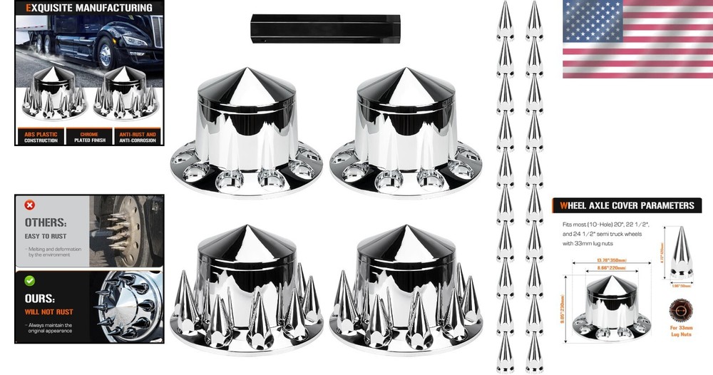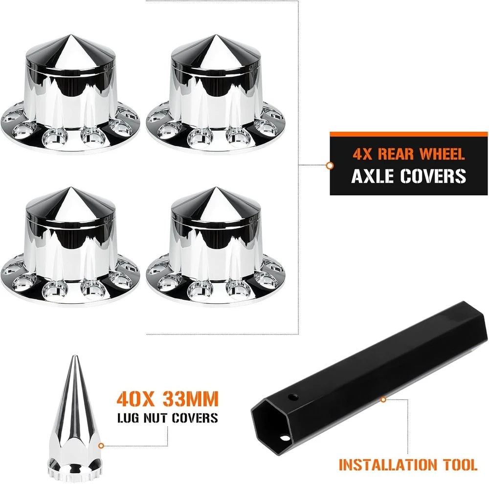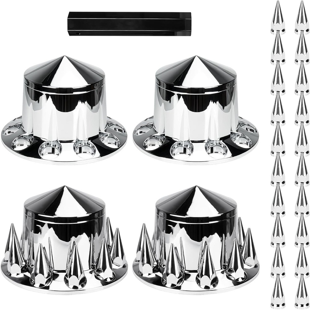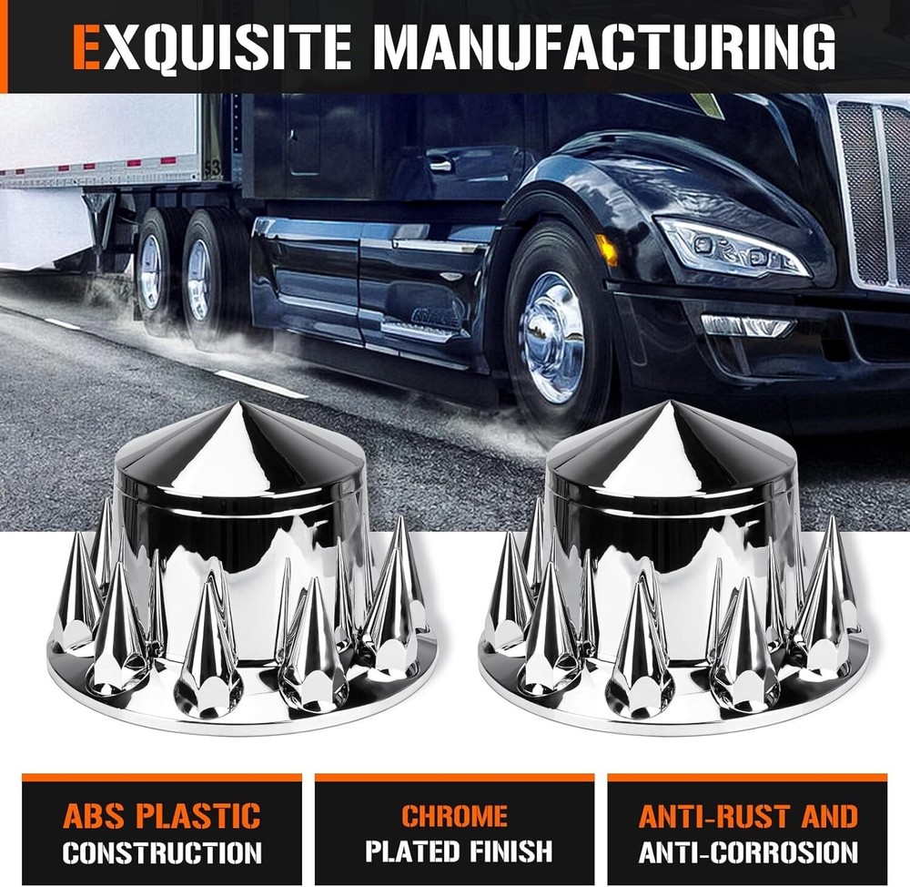 This ABS chrome spike axle cover combo instantly upgrades any semi truck with a sleek, custom look. The universal fit works on most common wheel sizes, and installation is a breeze—no special tools needed. The high-quality ABS plastic holds up well against road wear while the chrome finish stays shiny. Perfect for adding that extra touch of style to your rig without breaking the bank.