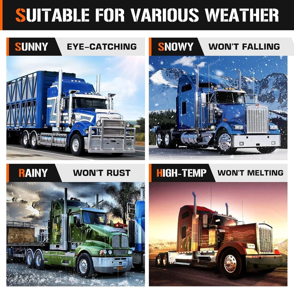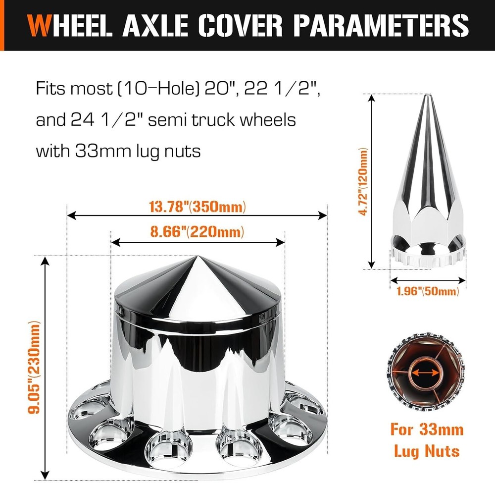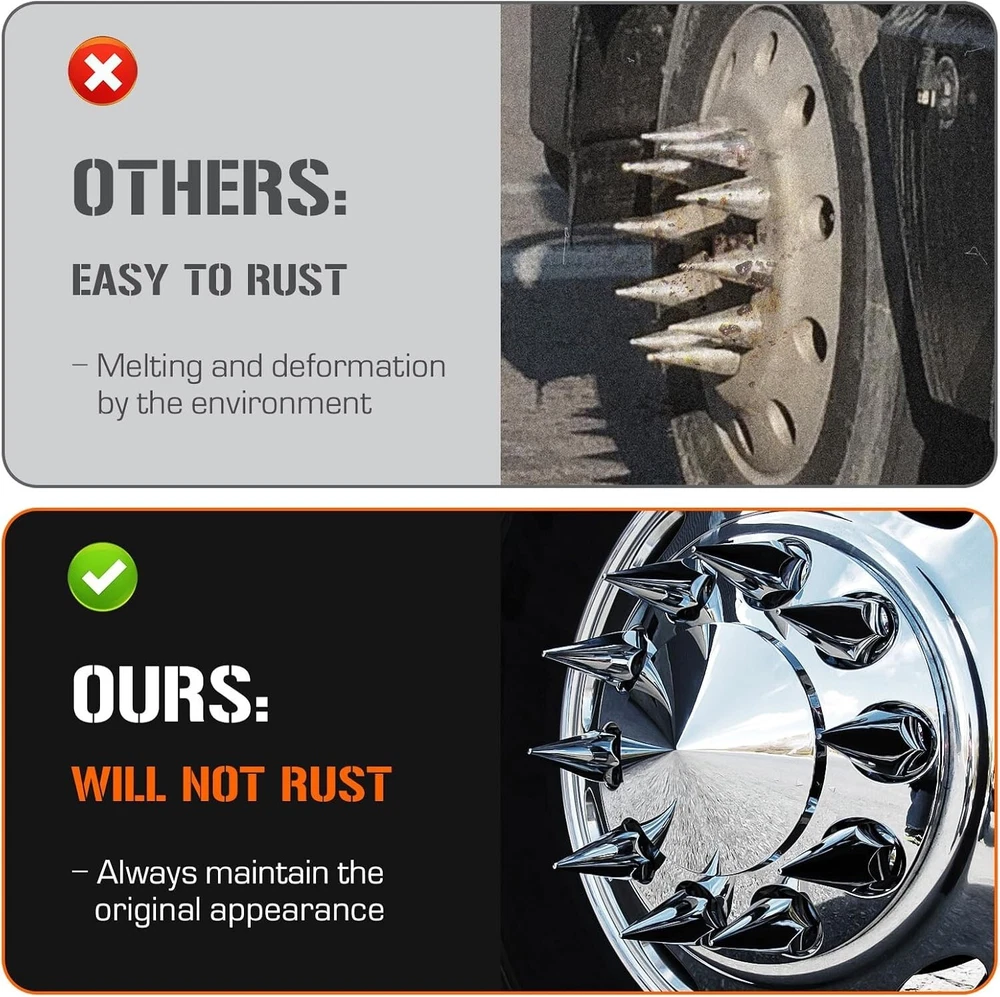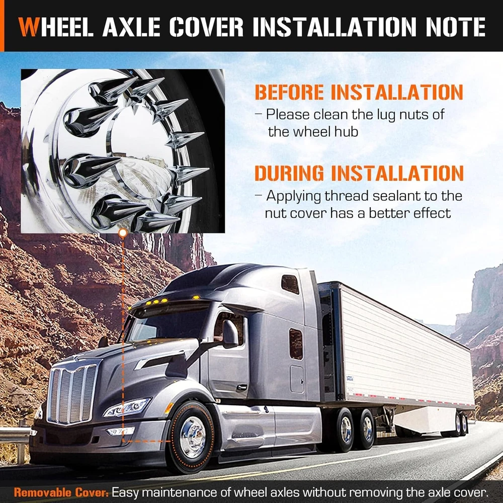 This ABS chrome spike axle cover combo instantly upgrades any semi truck with a sleek, custom look. The universal fit works on most common wheel sizes, and installation is a breeze—no special tools needed. The high-quality ABS plastic holds up well against road wear while the chrome finish stays shiny. Perfect for adding that extra touch of style to your rig without breaking the bank.