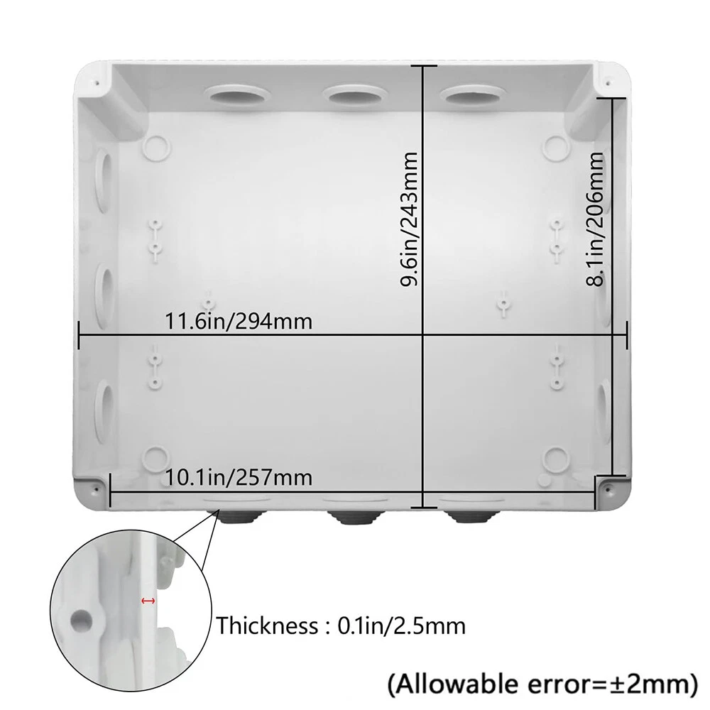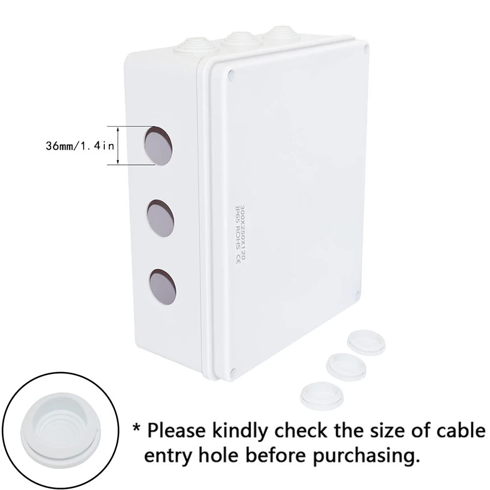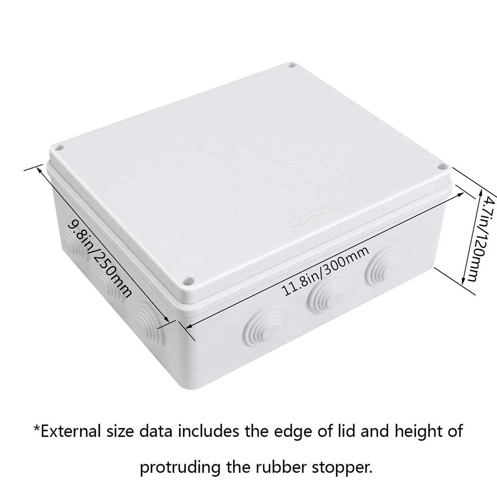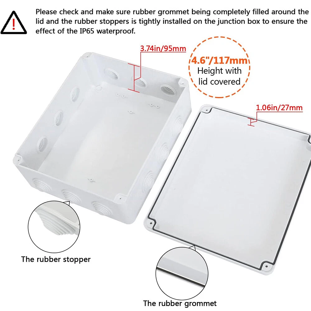 Features: [ Sturdy Construction ] Electrical Junction box is made of high-quality ABS plastic material, which offers excellent impact resistance and electrical insulation. Rest assured that your equipment will be well-protected in harsh environments. [ Safe and Certificated ] With CE RoHS compliant and waterproof rated, the electrical box is free of hazardous substances. The plastic box is predrilled which is easy to install and modify for your project. [ Indoor and Outdoor Use ] With the feature of water resistance and dustproof,it can effectively block splashing water, rain, dust, snow, oil, UV and more. Whether you need to use it indoors or outdoors, this surface mounted project box is easy to operate. [ Extensive Application ] Our junction box is used in a variety of applications: residential homes wiring and connecting electrical devices, such as light fixtures, switches, and outlets; protect and connect electrical equipment for machines, motors etc. Size: 11.8"x9.84"x4.72" Package Included: 1x Electrical Junction Box