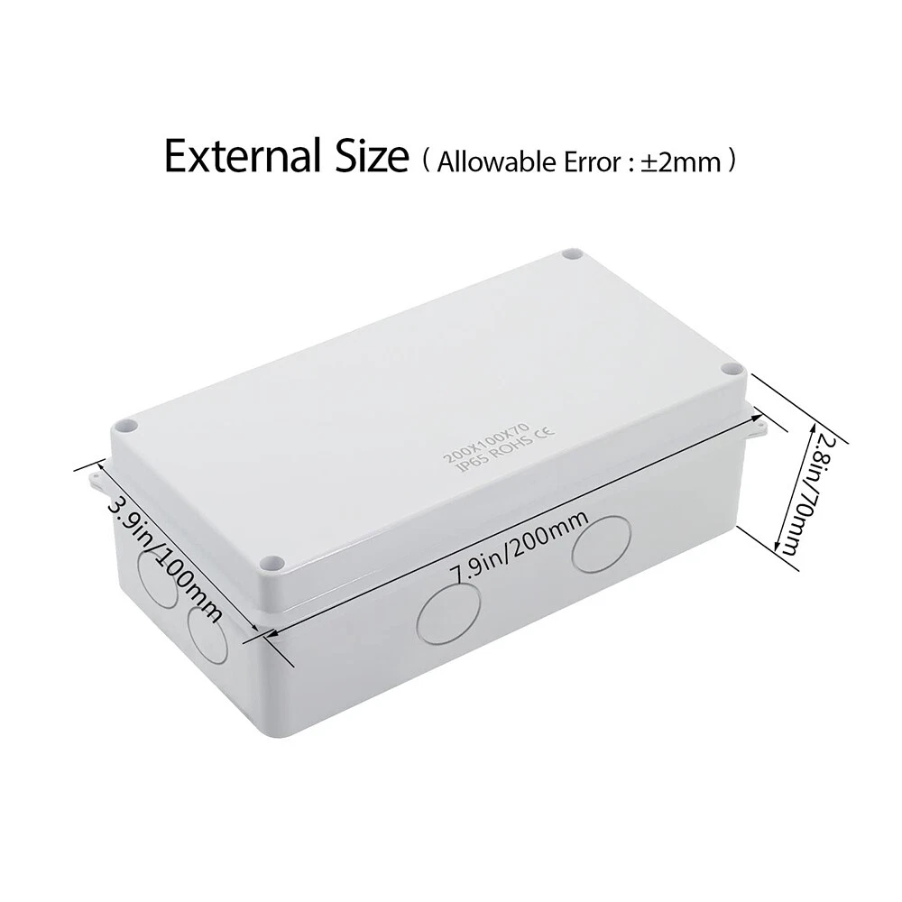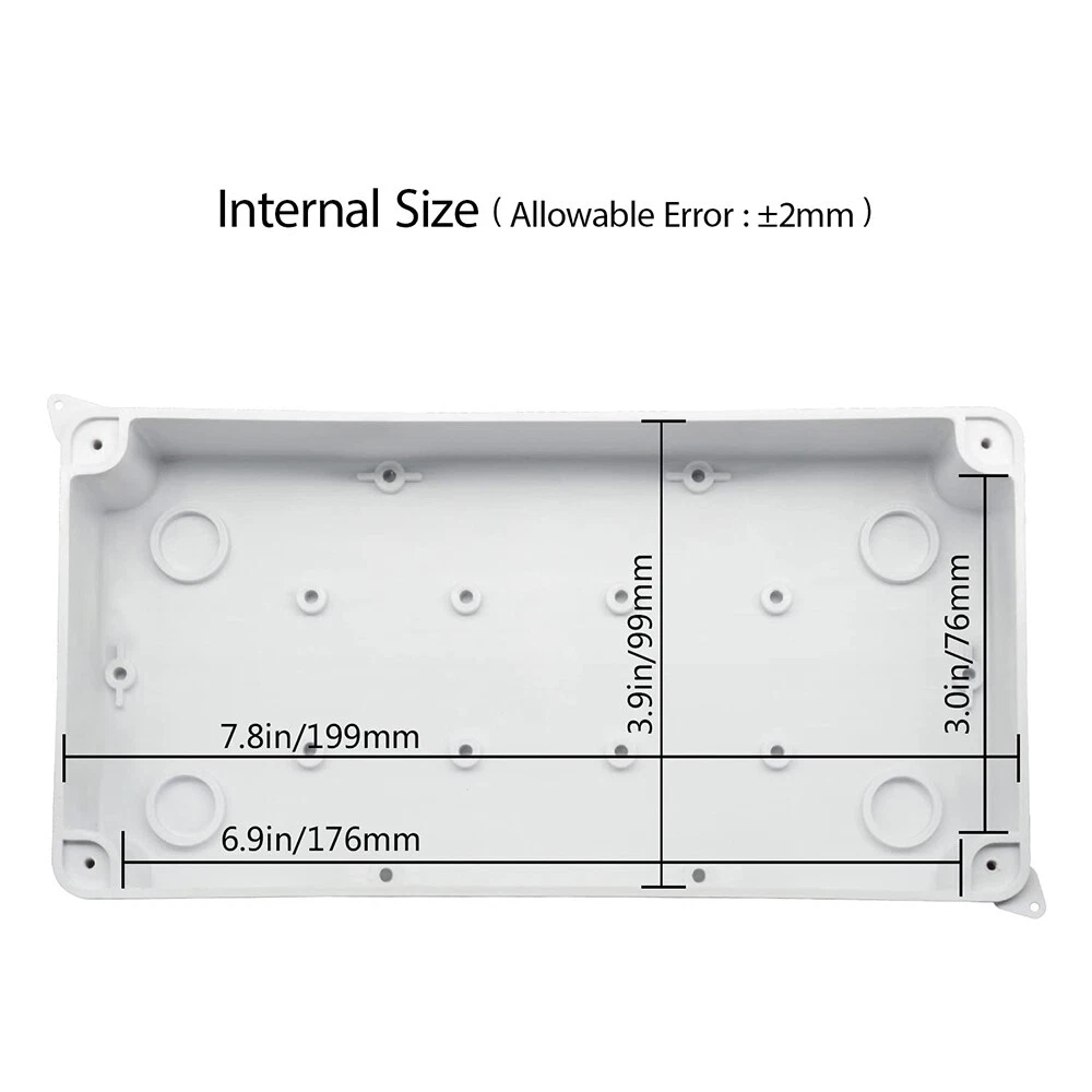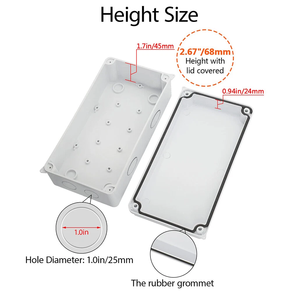 Features: [ Sturdy Construction ] Electrical Junction box is made of high-quality ABS plastic material, which offers excellent impact resistance and electrical insulation. Rest assured that your equipment will be well-protected in harsh environments. [ Safe and Certificated ] With CE RoHS compliant and waterproof rated, the electrical box is free of hazardous substances. The plastic box is predrilled which is easy to install and modify for your project. [ Indoor and Outdoor Use ] With the feature of water resistance and dustproof,it can effectively block splashing water, rain, dust, snow, oil, UV and more. Whether you need to use it indoors or outdoors, this surface mounted project box is easy to operate. [ Extensive Application ] Our junction box is used in a variety of applications: residential homes wiring and connecting electrical devices, such as light fixtures, switches, and outlets; protect and connect electrical equipment for machines, motors etc. Size: 7.87"x3.93“x2.75" Package Included: 1x Electrical Junction Box