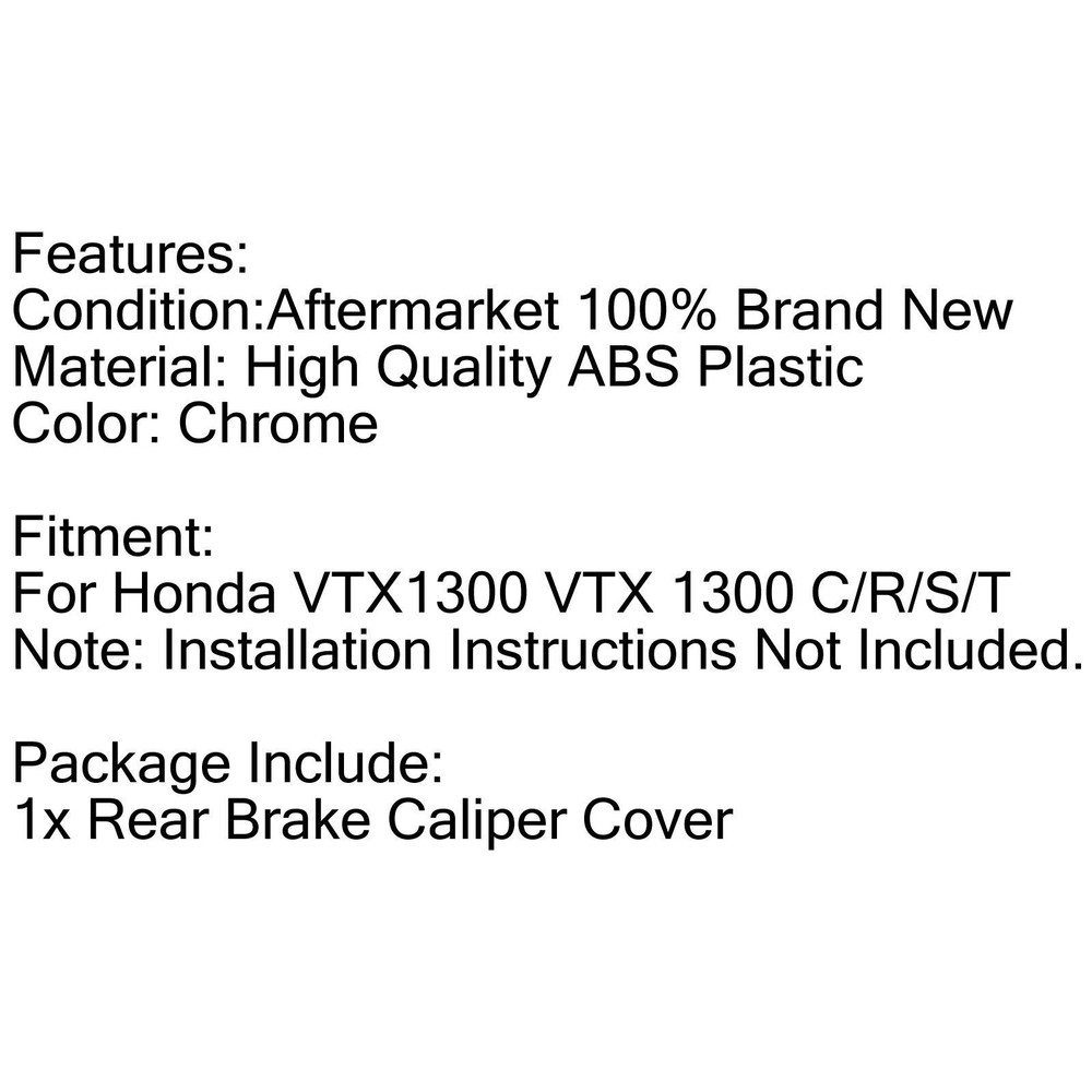 Product Description ABS Plastic Rear Brake Caliper Cover Chrome For 03-09 HONDA VTX1300 VTX 1300 Chrome Rear Brake Caliper Cap Cover Case Fit for Honda VTX 1300 C R 2003-2009 FEATURES: Enhanced appearance yet performance the same features. Double-side tape included in package. Easy installation, instructions Not included. SPECIFICATIONS: Condition: Aftermarket 100% Brand New Material: ABS Plastic Type: Brake Caliper Cap Color: Chrome-plated Placement on Vehicle: Rear FITMENT: Fit for Honda VTX1300 2003-2009 PACKAGE INCLUDES: 1x Rear Brake Caliper Cap NOTE: Please check out the size and product fits your motorcycle or not before you purchase. About Us Bruce & Shark is a company Focus on Motorcycle parts more than 11 years. The design inspiration comes from the awe of the vast sea and worship of the fighting sharks, therefore Bruce & Shark takes a shark as brand logo. Since its inception, we have always put the "customer first" and "top quality" as our principle. We specialized in selling Motorcycle parts and providing customers with various types of high-quality products. Our brand Bruce & Shark has enjoyed good reputation in America, Europe, Japan, Canada and Africa, covering more than 30 countries. Our vision is to deliver high-quality Motorcycle parts products and sincere services to the world. Our main products are motorcycle mounted, fuel pump, stator, windshield, Seat Cover, motorcycle fairing. Welcome to our shop to choose products that are worth more for your Motorcycle! Please Add me to your list of favorite sellers and visit often. Thank you for your business. Shipping United States Buyers Parcel will send via USPS or UPS or FedEx from our United States Warehouse. Shipping Time Usually parcel will be delivered 2-7 working days include handling time. Sometimes shipping time may has a little delay, such as Bad weather, Holidays. Terms We stand behind everything that we sell and will do everything possible to assure you are satisfied. When you receive your purchase if you are not 100% satisfied, please sent me ebay message and we will do our best to make you happy. If you still want to return your purchase, simply ship the item(s) back to us and we will refund your original purchase price and the original shipping charge. Buyers are responsible for the postal cost of returning the items. We must be notified of the intent to return your item within 30 days of receiving the item. Items returned must be in the same condition that they were received. How to return 1,Please ask us for return address . 2,Shipping back the package . The RMA#(Return Merchant Authorization Number = Your ebay ID) must be clearly written on the return package ,Otherwise the package will be refused. 3,Sent us the return tracking number. 4,All returns will be inspected prior to a credit being issued. Contact Us Send us ebay message in English If you have any questions, our Customer Service staffs welcome you to sent me ebay message. We strive to answer all questions and resolve any problems as quickly as possible. Business Hours: HongKong Time GMT+8:00 Monday-Saturday 9:00-17:00 Frame Sliders Protector Crash For Honda CBR600RR 2009-2012 Black US 62.65 USD Free shipping CDI Coil Unit Assy fit for Yamaha 25HP 25B 25Q 25V 30HP 30H 30G 61N-85540-11 USA 36.65 USD Free shipping Tank Pads Traction Grips Protector 2-Piece Kit Fit for Kawasaki Z900 2017-2020 E 21.65 USD Free shipping 3 LEFT ENGINE STATOR COVER GASKET FOR SUZUKI SAVAGE LS650 BOULEVARD S40 86-19 US 22.65 USD Free shipping Regulator Magneto Stator Coil Gasket Kit For Yamaha YZ 250 FX, WR 250 F 15-19 UE 129.65 USD Free shipping Engine Starter Motor Starting Fits Suzuki GSX-R 1000 GSXR1000 K1-K8 2001-2008 119.65 USD Free shipping Copyright © Bruce&Shark All rights reserved