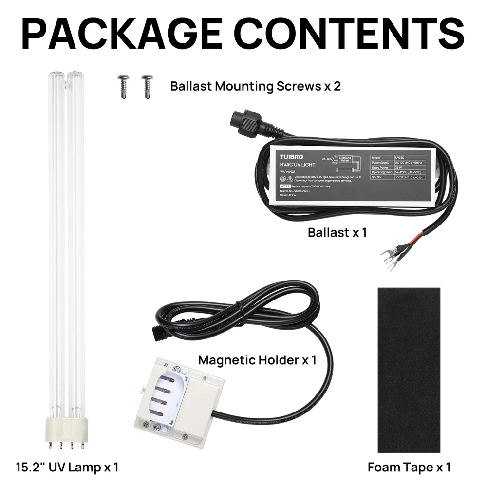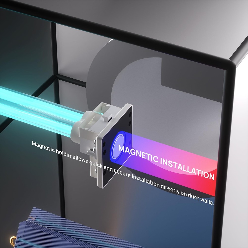 High-Output UV Bulb: Rated at 36 W for more effective UV disinfection than standard 6-25W lamps without Ozone generation; emits 253.7 nm short-wave ultraviolet light to sterilize HVAC ducting and AC systems for cleaner air TiO2 coated UV-C bulb: Titanium Dioxide coated lamps comply with EPA and CARB ozone limit standards, ensuring ozone concentration remains below 0.05 ppm, posing no harm when used as intended Effortless Setup: Ballast wires connect directly to the HVAC wiring terminal for seamless power integration; can be secured with screws or foam tape for flexible mounting Reliable Construction: Built with a 2G11 4-pin ceramic base; made from quartz glass; provides clear UV light transmission; enhances longevity for continuous use Versatile HVAC Use: Reduces contaminants within circulated air and internal components of AC systems to support a cleaner environment; suitable for use within HVAC systems in schools, hospitals, hotels, offices, and more Easy Magnetic Use: Our 15.2β UV lamp mounts on a magnetic holder, attaching securely to the inner wall of the HVAC unit; requires a minimum 17-inch space for setup Use only with UV lamps; avoid direct exposure to UV light when in use to protect people, pets, and other creatures; avoid handling UV bulbs with bare hands. This product is currently under CARB application, so it cannot be shipped to California at this time. However, it is compliant with EPA standards for sale in other regions.