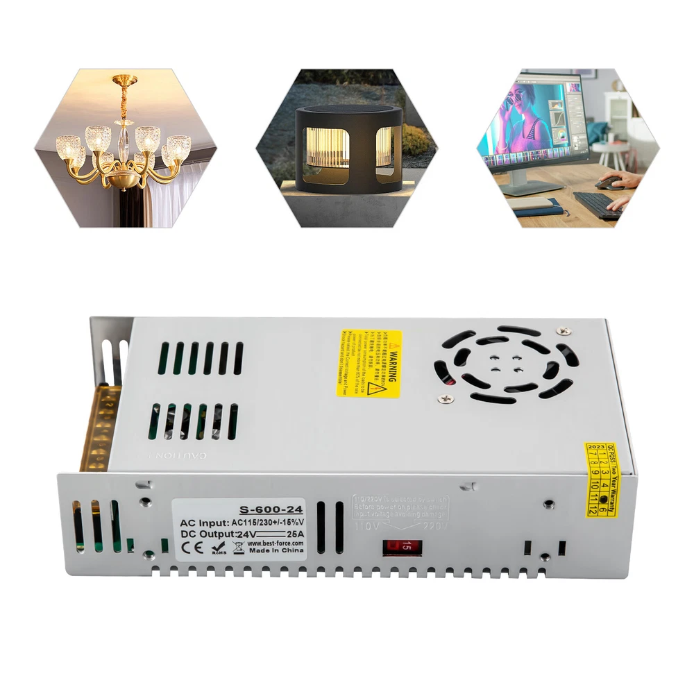 AC 110Volt TO DC 24V Voltage Transformer Switch Power Supply Converter 25A 600W Description If you are troubled with situations such as poor safety performance of electrical appliances, frequent tripping due to unstable voltage, and electrical appliances brought back from abroad cannot be used normally, then you should get our switch power supply that can effectively realize voltage convert from 110V to 24V. It uses high-quality aluminum and pure copper coils , ensuring durable use and stable performance. It is widely applicable for various appliances to meet your daily needs. Key Features Stable Output: Using the pure copper coils/transformer, EMI filter capacitor, premium chip, high-performance IC, and the soft start current design, this switch power supply has stable performance converting AC voltage to stable DC voltage while effectively reducing electromagnetic interference. It has 2 output ports and each port outputs 0~25A automatically to match your device. The default output voltage is 24V, but it can be regulated by 5%. Premium Material: The high-quality aluminum housing and premium interior materials such as PCB fiberglass board and pure copper make this product strong, wear-resistant , and durable. The wiring terminal has anti-rust and anti-corrosion functions. High Safety: Adopting a cooling fan with heat-sink holes, temperature detector, pure copper transformer, high-temperature-resistant capacitor, auto-reset or fuse function, surge protection, over-voltage protection, short-circuit protection, over-current protection, and overload protection, this product is safe to use. A Great Helper: Once in operation, this SMPS can effectively convert AC 110V to DC 24V and provide different currents per watt for multiple devices, which is a great helper in your daily life. Compact Size: The compact size(8.46*4.52*1.96 inches) means this machine won't occupy your space, so you can put it in any small corner. Simple Installation : The simple structure and pre-drilled holes allow for easy and convenient installation. Protective Package: To prevent the product from being damaged and bumped during transportation, we packed it with foam cotton to protect your products to the maximum extent possible. Buy with Confidence: We have been working hard to provide better service and quality for our customers, which is our goal. If there is any problem with our products. Please contact us in time. Details Indicator Light: The indicator light shows the normal work condition of this switch power supply when it works for your convenience. Clear Cover: The safety protection cover is dustproof and better avoids accidental electric shock during power operation. Application It is suitable for LED power supplies, medical power supplies, display screen power supplies, industrial control systems, power equipment, instruments, solar photovoltaic power supplies, stepper motors, PLC control systems, surveillance cameras, LED light boxes, LED lamps, luminous characters, communication equipment, home appliances, industrial equipment, building lighting, medical equipment, traffic signal control, etc. How to Calculate Support Max. LED Strip Length Assumption: Your LED strip is 60LEDs/m and each LED 0.2W, then calculate max LED strip length: 0.2W/LED × 60LEDs/m=12W/m, 24W(this listing)÷12W/m=2m. So, it supports the LED strip(60LEDs/m, 0.2W/LED) length (Max)=2m light. Wiring Description L, N: AC Power Input GND: Ground Wiring -V: DC Power Output "-" +V: DC Power Output "+" ADJ: Adjust the Output Voltage(±5%) Specifications Model: S-600-24 Color: Silver Style: Modern Shape: Rectangular Mounting Type: Wall Mount Housing Material: Aluminum Power Source: Corded Electric AC Input: 110V DC Output: 24V, 25A Power: 600W Frequency: 50-60Hz Error Accuracy: ±1% Efficiency: >80% Output Adjustable Voltage Range: ±5% Leakage Current: <1mA/230V Temperature Coefficient: ±0.03%/℃(0~50℃/32~122 °F ) Operating Temperature&Humidity: -10℃~+60℃/14~140 °F , 20%~90%RH Environment Temperature&Humidity: -20℃~+85℃/-4~185 °F ,10%~95%RH Start/Up/Maintain Time: 200ms, 50ms, 20ms Shock Resistance : 10~500Hz, 2G 10min /Period, 60min, Each Axis Pressure Resistance between Input and Output: 1.5KvAC Input and Shell; 1.5KvAC Output and Shell; 0.5KvAC Installation Hole Diameter: 2.5mm/0.01inch Product Size: 21.5*11.5*5cm/8.46*4.52*1.96inch Package Size: 23*13*6cm/9.05*5.12*2.36inch Gross Weight: 0.75kg/1.65 lbs Package Included 1* Switch Power Supply Notes This item does not include the power cord and screws. Please refer to the corresponding model "output voltage, current, and power". It does not apply to the battery, speed-regulating motor, heater, and engraving machine. The testing condition for the parameter above is 110VAC input, rated load, 25℃ temperature, and 70% RH. The error includes the setting error, ling stability, and load stability(The test of the load is from 0% to 100%.). The wave test adopts A12 double wires for 30MHZ and 0.1uF847uF capacitor short-circuit for interrupting. The inlet voltage stability test: when it is overloaded, the lowest voltage of the inlet is up to the highest voltage. Please calculate the actual power before using the product to make sure of its lifespan. It‘s suggested that the total power consumption of the loads to be connected be not more than 75% of the rated power of the product. Please make sure your device has a voltage of 24V and uses power less than 600W. If it runs 24*7 hours, the power consumed should not exceed 40% of the full load. Applied to the motor: 2 times the power of the device = the nominal power of the transformer unit. Please switch to a suitable voltage before use. When working at 110V, please keep the load under 70%; When working at 220V, the load can reach 100%. Professional installation by a licensed electrician is highly recommended. Please check if the wiring is correct before wiring. It supplies less than 25A. For example, if your device draws 7.5A, then 7.5A w