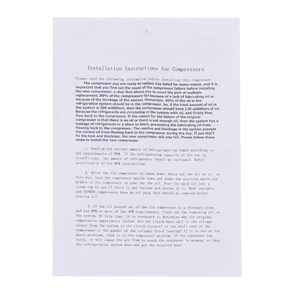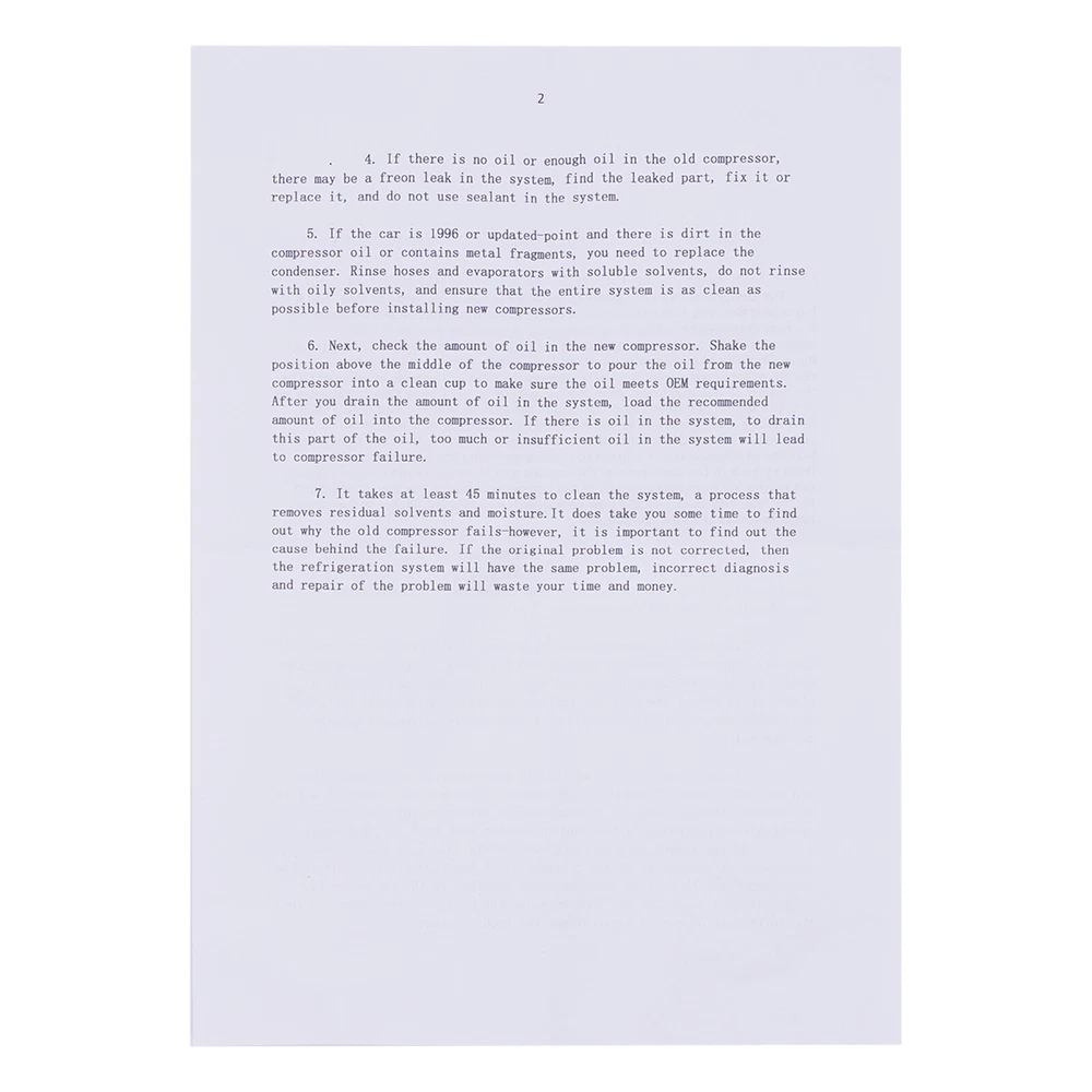 AC Compressor York Style Freightliner Peterbilt Kenworth ET210L-25150 Specifications OEM: ET210L-25150, ET210L25150, 48821001, ABPN83304081, ABPN83304101T, ABPN83304031, 206RD34, 80417494, ET210625150, F7HS19D629AA Applicable Models: Freightliner Peterbilt Kenworth Compressor Model: ET210L Oil Type: ESTER/PAG 100 Oil Capacity(Oz): 11 Omega Oil No.: 41-50000 Compressor Fitting: PAD TOP Cylinder: LHS Coil Pos.: W/O Material: Iron, Aluminum, Copper Color: Silver Way of Use: Direct Replacement Assembly Method: Closed Gross Weight: 4kg/ 8.82 lbs Package Size: 28*22*19 cm/ 11.02*8.66*7.48in Key Features Good Compatibility: This product is a customized product, specially customized for the Freightliner Peterbilt Kenworth. So it can be compatible with the adapted models. Stable and Efficie A/C AC Compressor York Type for Freightliner Peterbilt Kenworth ET210L-25150 USA AC Compressor York Style Freightliner Peterbilt Kenworth ET210L-25150 Specifications OEM: ET210L-25150, ET210L25150, 48821001, ABPN83304081, ABPN83304101T, ABPN83304031, 206RD34, 80417494, ET210625150, F7HS19D629AA Applicable Models: Freightliner Peterbilt Kenworth Compressor Model: ET210L Oil Type: ESTER/PAG 100 Oil Capacity(Oz): 11 Omega Oil No.: 41-50000 Compressor Fitting: PAD TOP Cylinder: LHS Coil Pos.: W/O Material: Iron, Aluminum, Copper Color: Silver Way of Use: Direct Replacement Assembly Method: Closed Gross Weight: 4kg/ 8.82 lbs Package Size: 28*22*19 cm/ 11.02*8.66*7.48in Key Features Good Compatibility: This product is a customized product, specially customized for the Freightliner Peterbilt Kenworth. So it can be compatible with the adapted models. Stable and Efficient: The high-efficiency compressor (ET210L) allows your car air conditioner to run more smoothly and efficiently. Good Customer Service: Communication is the best way to solve problems. If you encounter any problem after purchase, please contact us in time before opening or unpacking the box. We will do our best to solve the problem for you. Highlights High Quality Direct Replacement Trouble-free Installation Stylish Appearance Strong and Durable Exquisite Workmanship Easy to Clean Stable Performance Long Service Life Notes 1.We strongly recommend professional installation. Please contact us if you have any questions. 2.Please allow the slight color difference caused by the shooting light and 1-3cm error due to manual measurement, and make sure you do not mind before you place the order. Fits (As a Reference) For Freightliner Peterbilt Kenworth OEM Part Number: ET210L-25150, ET210L25150, 48821001, ABPN83304081, ABPN83304101T, ABPN83304031, 206RD34, 80417494, ET210625150, F7HS19D629AA Package Included 1 x Air Conditioner Compressor When you receive this compressor item, please first check if there is any damage to the compressor, and then manually rotate the wheels and suction blades to see if there are any abnormalities. Furthermore, please confirm if the 12V plug of the power clutch is properly powered on. Automotive Air Conditioning Compressor Disassembly and Assembling Steps 1. Preparation Before you start to disassemble the automobile air conditioning compressor, you need to do the following preparatory work. 1. Make sure the car has been parked and completely turned off. 2. The vehicle should be in a flat and safe environment, avoiding operation on slopes or unstable ground. 3. Wear acid and alkali-resistant gloves and goggles for protection. 4.When you receive this compressor item, please first check if there is any damage to the compressor, and then manually rotate the wheels and suction blades to see if there are any abnormalities. Furthermore, please confirm if the 12V plug of the power clutch is properly powered on 2.Disassemble the air conditioning compressor 2.1 Compressor location determination Before removing the air conditioning compressor, its location needs to be determined. Typically, the air conditioning compressor is located at the front of the engine compartment, and its exact location can be found through the technical manual provided by the vehicle manufacturer or online resources. 2.2 Discharging the refrigerant Before removing the air conditioning compressor, the refrigerant in it must be drained. This is very important as refrigerants can be harmful to the environment and illegal. The following are the steps for discharging the refrigerant. 1. Open the hood of the vehicle. 2. Locate the refrigerant charging and discharging ports on the air conditioning compressor. 3. Use a refrigerant recovery machine to pump out the refrigerant and store it. Be sure to follow local regulations to ensure proper handling of the refrigerant. 2.3 Removing the connecting piping After discharging the refrigerant, it is necessary to remove the connection pipes on the air conditioning compressor. These pipes are usually bolted or clamped to the compressor. The following are the steps for removing the connecting pipes. 1. Loosen the bolts or pliers on the connecting pipes with the appropriate tools. 2. Carefully separate the connecting pipe from the compressor. It may be necessary to shake the connection pipes gently to loosen them. 2.4 Removing the electrical connections After removing the connecting pipes, it is necessary to remove the electrical connections on the compressor. These electrical connections are usually secured to the compressor by plugs or screws. The following are the steps for removing the electrical connections. 1. Locate the electrical connections on the compressor. 2. If there is a plug connection, carefully unplug it from the compressor. 3. If there is a screw connection, use the appropriate tool to loosen the screw and remove the wire. 2.5 Removing the compressor After completing the above steps, the entire air conditioning compressor can now be removed. The following are the steps for removing the compressor. 1. Remove the bolts or screws holding the compressor in place using a wrench or wrench glove device. 2. Carefully remove 