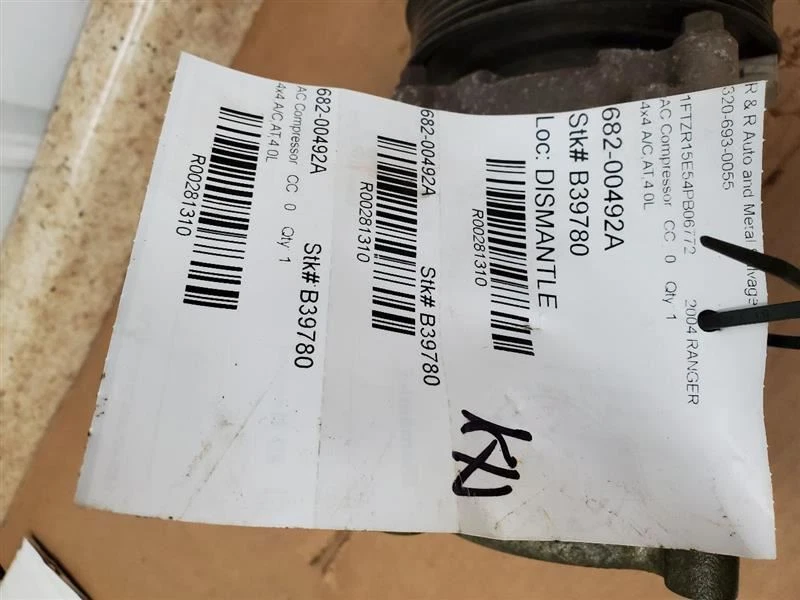 Welcome to our eBay Store! AC Compressor 6-245 Fits 01-11 RANGER 281310 Description Donor Vehicle VIN: 1FTZR15E54PB06772 Model: RANGER Year: 2004 Mileage: 0 (0 = not available or unknown) Stock Number: B39780 Store Number: 1 Part Detail Part Grade: A Part Category: U Part Placement: Notes: 4x4,A/C,AT,4.0L This part will fit these makes and models with these options BRONCO 96 COUGAR 96-97 6-232 (3.8L) FORD F150 PICKUP 96 FORD F250 PICKUP 96 gasoline FORD F250 PICKUP 97 from 8501 GVW, 8-351 (5.8L) FORD F250 PICKUP 97 from 8501 GVW, 8-460 (7.5L) FORD F350 PICKUP 96 gasoline FORD F350 PICKUP 97 8-351 (5.8L) FORD F350 PICKUP 97 8-460 (7.5L) FORD F450 PICKUP 96-97 gasoline MAZDA B-4000 01-10 MUSTANG 96-04 6-232 (3.8L) MUSTANG 04 6-238 (3.9L) RANGER 01-02 exc. electric vehicle; 6-245 (4.0L) RANGER 03-11 6-245 (4.0L) THUNDERBIRD 96-97 6-232 (3.8L) WARRANTY / GUARANTEE SHIPPING NOTES ABOUT US HELP Core Charge. Core is an acronym for ‘Cash On Return’. A core charge is sometimes applied to rebuildable parts such as engines or alternators that can be redeemed for a portion of their original price. If the part you are purchasing has a core charge applied, it will be noted in the description. Parts Grading. A standard code system is used to communicate the condition and quality of a part between automotive recyclers, automotive repair shops, and insurers. Knowing how these codes are used will help you understand whether the part meets your expectations before you buy it and what you can expect from the part when you receive it. A Grade - The highest quality part. It is of low miles and/or exceptional condition for its age. B Grade - The second level quality part. It is of average miles and normal condition for its age. C Grade - The third level quality part. It has high miles and/or light damage. No Grade - A part that has not yet been graded.