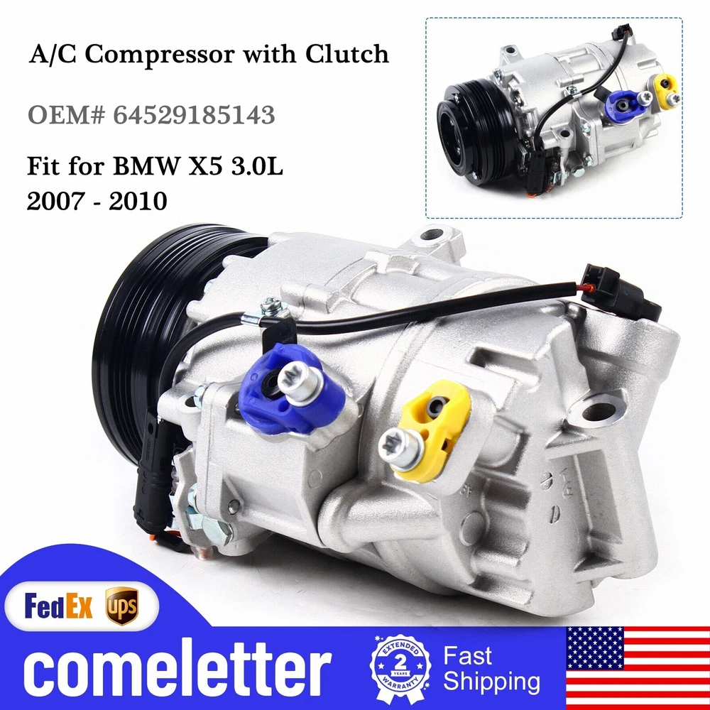 A/C Compressor & Clutch CSE717 Fit For BMW X5 07-10 3.0L 64529185143 57647 58647 A/C Compressor With Clutch CSE717 For BMW X5 07-10 3.0L 64529185143 57647 58647 Condition: New Fitment Type: Direct Replacement Installation Instructions: Not included Brand: Unbranded Interchange Part Number: 64529185143, 57647, 58647, 5512755, 6512755, 7512755, 2022211AM, 141005, 141005C, 141005NEW, C2117, 351340931, 64509121759, 64529195973, 9121759, 9195973, 890038, 20-22211-AM, 274624, CO 29108C Product Type: A/C Compressor Compressor Type: CSE717 Grooves: 4 Oil: PAG 46 Voltage: 12 Suction Port (mm): 18.40 Gauge Line (mm): 68 Discharge Port (mm): 15.5 Clutch Diameter (mm): 110 Manufacturer Part Number: Does Not Apply Port Angle: LEFT Rotor Groove: PV4 Warranty: 2 Year UPC: Does not apply Product function description: Features: 100% brand new and high quality,Durable. It could correctly replace the original quality part . Note: Installation Manual Is NOT Included Professional Installation Is Highly Recommended Please make sure it will fit your machine before purchasing it. Please check pictures for more details. Warranty: If our product does not work properly for you and you want to exchange another one or get a refund, please confirm with our customer service first and list the product detailed problems. We keep our promises that we will provide you with the best solution within 24 hours. Fits (For the reference): BMW BMW X5 - 2007/2010 Vehicle Trim Year Engine X5 3.0si 2007/2009 L6 CC:2996 CID:- 3.0L DOHC FI MFI Naturally Aspirated GAS X5 xDrive30i M Sport 2009/2010 L6 CC:2996 CID:- 3.0L DOHC FI MFI Naturally Aspirated GAS X5 xDrive30i 2009/2010 L6 CC:2996 CID:- 3.0L DOHC FI MFI Naturally Aspirated GAS The Compatibility Is Just For Reference. Please Compare With Your Original One Before Purchasing! OEM Part Number: 64529185143 Package includes: 1 x A/C Compressor with Clutch Automotive Air Conditioning Compressor Disassembly and Assembling Steps 1. Preparation Before you start to disassemble the automobile air conditioning compressor, you need to do the following preparatory work. 1. Make sure the car has been parked and completely turned off. 2. The vehicle should be in a flat and safe environment, avoiding operation on slopes or unstable ground. 3. Wear acid and alkali-resistant gloves and goggles for protection. 4.When you receive this compressor item, please first check if there is any damage to the compressor, and then manually rotate the wheels and suction blades to see if there are any abnormalities. Furthermore, please confirm if the 12V plug of the power clutch is properly powered on 2.Disassemble the air conditioning compressor 2.1 Compressor location determination Before removing the air conditioning compressor, its location needs to be determined. Typically, the air conditioning compressor is located at the front of the engine compartment, and its exact location can be found through the technical manual provided by the vehicle manufacturer or online resources. 2.2 Discharging the refrigerant Before removing the air conditioning compressor, the refrigerant in it must be drained. This is very important as refrigerants can be harmful to the environment and illegal. The following are the steps for discharging the refrigerant. 1. Open the hood of the vehicle. 2. Locate the refrigerant charging and discharging ports on the air conditioning compressor. 3. Use a refrigerant recovery machine to pump out the refrigerant and store it. Be sure to follow local regulations to ensure proper handling of the refrigerant. 2.3 Removing the connecting piping After discharging the refrigerant, it is necessary to remove the connection pipes on the air conditioning compressor. These pipes are usually bolted or clamped to the compressor. The following are the steps for removing the connecting pipes. 1. Loosen the bolts or pliers on the connecting pipes with the appropriate tools. 2. Carefully separate the connecting pipe from the compressor. It may be necessary to shake the connection pipes gently to loosen them. 2.4 Removing the electrical connections After removing the connecting pipes, it is necessary to remove the electrical connections on the compressor. These electrical connections are usually secured to the compressor by plugs or screws. The following are the steps for removing the electrical connections. 1. Locate the electrical connections on the compressor. 2. If there is a plug connection, carefully unplug it from the compressor. 3. If there is a screw connection, use the appropriate tool to loosen the screw and remove the wire. 2.5 Removing the compressor After completing the above steps, the entire air conditioning compressor can now be removed. The following are the steps for removing the compressor. 1. Remove the bolts or screws holding the compressor in place using a wrench or wrench glove device. 2. Carefully remove the compressor from its mounting position. 3.Installation of a new air-conditioning compressor 3.1 Preparation for installing a new compressor Before installing a new air conditioning compressor, some parts need to be prepared. The following are the steps of preparation. 1. Clean the joints of the connecting pipes and make sure that their surfaces are clean and dust-free. 2. Prepare the new compressor and make sure it fits your vehicle model and cooling system. 3. Prepare new washers, bolts, or screws to fix the new compressor. 3.2 Installing the air conditioning compressor The following are the steps for installing a new air conditioning compressor. 1. Carefully place the new compressor in its mounting position. 2. Use new bolts or screws and place washers in the necessary positions before installation. 3. Tighten the compressor bolts or screws using a wrench or wrench-glove device. 3.3 Connecting the wires The following are the steps for connecting the wires. 1. Connect the compressor wires to the new compressor. Depending on the disassembly procedure in the previous section, plug or