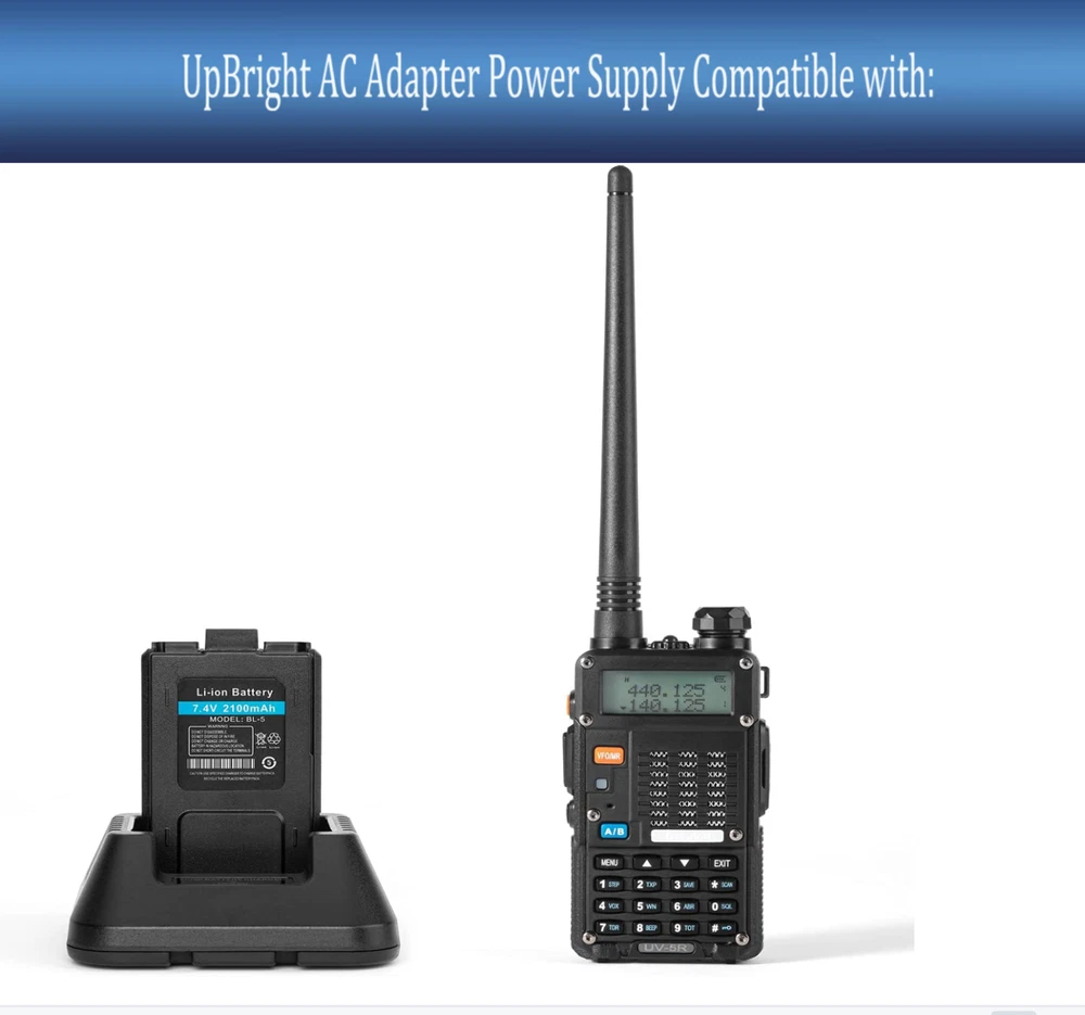 For sale is a brand new replacement AC Adapter Charger Power Supply: Features and Specification: Worldwide Input Voltage: 100-240VAC/50-60Hz Intelligent chip inside Output Protection: Complete OVP, OCP, SCP Protection: OVP: Over Voltage output Protection OCP: Over Current output Protection SCP: Short Circuit output Protection High efficiency and low power consumption In great working condition Safety Approval: CE, CCC, RoHS Condition: Brand New. Replacement and totally Compatible Part. Package Includes: 1pc AC Adapter. To Replace and Compatible Model Number/Part Number: UpBright Brand New Global AC / DC Adapter Switching Mode Power Supply Cord Cable PS Battery Charger Mains PSU Compatible with: Ham Radio Walkie Talkie (UV-5R 8W) Dual Band 2-Way Radio with 2 Rechargeable 2100mAh Battery Handheld Walkie Talkies Complete Set with Earpiece and Programming Cable ⚠️!!!Tips: Rechargeable batteries don't last forever, the average battery last 1 to 3 years. If the battery is old/dead, it will not accept a charge. But not charger's problem. If you're not sure whether battery or charger is dead or not. You must have a volt meter in order to tell whether or not a charger is working. BEST PRODUCTS ! BEST SERVICE ! YOUR SATISFACTION IS GUARANTEED! This Unit is TESTED, and would be backed by our professionals if any issues. This Unit offers 14 days money back, 30 days exchange, 180 days warranty! This Unit ships from USA, Same Day Shipping, shipped out normally not later than 24 hours. This Unit is at this right time, BUY IT NOW, BID WITH CONFIDENCE!!! Service: We are professional company providing high-quality computer, radio & electronic equipments and parts, antennas, headsets through our local store and online store. We try our best to ensure utmost customer satisfaction. Please understand that on eBay, your bid/purchase is a contract. If you are not ready to buy it, please do not place your bid/order. A cancellation fee will apply if you commit to purchase an item but then notifying us that you do not want the item. If you have any questions about your order or payment, please let us know in ebay account. We try our best to answer your questions in a timely manner and most of the times we respond within 6 hours. Please note that our office is closed during weekend and holidays. If you do not receive our response within 12 business hours, please contact us again. Payment: We accept PayPal and Credit Card. But we do not take credit card directly. All credit card payments still need to be collected through PayPal payment system (We do not want to store customers' info). Shipping: We use USPS for retail packages. The large quantity wholesale order would be shipped by UPS or FedEx. Expedite/Express shipping are available as well. The international orders would be shipped by USPS. Please choose the right shipping options when checking out the order. ***We only ship to PayPal confirmed address. We use real time shipping system. YOU NEED TO UPDATE YOUR SHIPPING ADDRESS WHEN CHECKING OUT to make sure the shipping address is correct. There is fee of changing a shipping address,if other than the confirmed address. We may refuse the request of changing shipping address.*** Return/Warranty Online order has 14 days money back, 1 month exchange and 1 year fix/repair service warranty. For DOA unit or Within 1 month defective unit, NO QUESTION ASKED, we will offer exchange/replacement. Customers are responsible for the return shipping charges. We will pay the shipping fee to send you the replacement. Warranty does not include changing mind, wrong ordering and misuse. For any other return request, please notify us thru ebay account. to request an RMA number, before returning the package to us. Returns without RMA number may not be recognized or processed. Feedback: We strive to provide our customer best products and reliable services. Buyers are encouraged to leave us positive feedback if you are satisfied. Please DON'T leave negative feedback before contacting us. W e will try our best to correct any issues to ensure your satisfaction. Leaving negative feedback will not help resolve your issue, and may result in void of warranty. Wholesale/Business relationship We could be your business partner. If you have special needs, please let us know in ebay account.