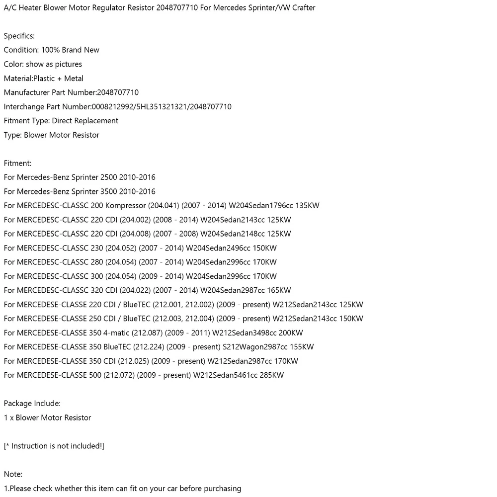 Heater Blower Motor Resistor 64119226780 For BMW F10 F11 F01 528i 535i 535d U4 29.75 USD 31.65 USD Free shipping 6% off Heater Blower Motor Resistor 64119226780 For BMW F10 F11 F01 528i 535i 535d 30.07 USD 31.65 USD Free shipping 5% off Product Description A/C Heater Blower Motor Resistor 2048707710 Fit Mercedes Sprinter/VW Crafter A/C Heater Blower Motor Regulator Resistor 2048707710 For Mercedes Sprinter/For VW Crafter Feature: 1: According to the original factory specifications,perfect match for the original car. 2: Own different test machines to design exact accurate parameter for our products.All switches were tested for performance. 3: Made by high quality material, lightweight, anti-rust, colorfast and durable. 4: Aftermarket product with premium quality. 5: Stable performance, high reliability,suitable for replacing your broken one. Specifics: Condition: 100% Brand New Color: show as pictures Material:Plastic + Metal Manufacturer Part Number:2048707710 Interchange Part Number:0008212992/5HL351321321/2048707710 Fitment Type: Direct Replacement Type: Blower Motor Resistor Fitment: For Mercedes-Benz Sprinter 2500 2010-2016 For Mercedes-Benz Sprinter 3500 2010-2016 For MERCEDESC-CLASSC 200 Kompressor (204.041) (2007 - 2014) W204Sedan1796cc 135KW For MERCEDESC-CLASSC 220 CDI (204.002) (2008 - 2014) W204Sedan2143cc 125KW For MERCEDESC-CLASSC 220 CDI (204.008) (2007 - 2008) W204Sedan2148cc 125KW For MERCEDESC-CLASSC 230 (204.052) (2007 - 2014) W204Sedan2496cc 150KW For MERCEDESC-CLASSC 280 (204.054) (2007 - 2014) W204Sedan2996cc 170KW For MERCEDESC-CLASSC 300 (204.054) (2009 - 2014) W204Sedan2996cc 170KW For MERCEDESC-CLASSC 320 CDI (204.022) (2007 - 2014) W204Sedan2987cc 165KW For MERCEDESE-CLASSE 220 CDI / BlueTEC (212.001, 212.002) (2009 - present) W212Sedan2143cc 125KW For MERCEDESE-CLASSE 250 CDI / BlueTEC (212.003, 212.004) (2009 - present) W212Sedan2143cc 150KW For MERCEDESE-CLASSE 350 4-matic (212.087) (2009 - 2011) W212Sedan3498cc 200KW For MERCEDESE-CLASSE 350 BlueTEC (212.224) (2009 - present) S212Wagon2987cc 155KW For MERCEDESE-CLASSE 350 CDI (212.025) (2009 - present) W212Sedan2987cc 170KW For MERCEDESE-CLASSE 500 (212.072) (2009 - present) W212Sedan5461cc 285KW Package Include: 1 x Blower Motor Resistor [* Instruction is not included!] Note: 1.Please check whether this item can fit on your car before purchasing About Us Bruce & Shark is a company Focus on Motorcycle parts more than 11 years. The design inspiration comes from the awe of the vast sea and worship of the fighting sharks, therefore Bruce & Shark takes a shark as brand logo. Since its inception, we have always put the "customer first" and "top quality" as our principle. We specialized in selling Motorcycle parts and providing customers with various types of high-quality products. Our brand Bruce & Shark has enjoyed good reputation in America, Europe, Japan, Canada and Africa, covering more than 30 countries. Our vision is to deliver high-quality Motorcycle parts products and sincere services to the world. Our main products are motorcycle mounted, fuel pump, stator, windshield, Seat Cover, motorcycle fairing. Welcome to our shop to choose products that are worth more for your Motorcycle! Please Add me to your list of favorite sellers and visit often. Thank you for your business. Shipping United States Buyers Parcel will send via USPS or UPS or FedEx from our United States Warehouse. Shipping Time Usually parcel will be delivered 2-7 working days include handling time. Sometimes shipping time may has a little delay, such as Bad weather, Holidays. Terms We stand behind everything that we sell and will do everything possible to assure you are satisfied. When you receive your purchase if you are not 100% satisfied, please sent me ebay message and we will do our best to make you happy. If you still want to return your purchase, simply ship the item(s) back to us and we will refund your original purchase price and the original shipping charge. Buyers are responsible for the postal cost of returning the items. We must be notified of the intent to return your item within 30 days of receiving the item. Items returned must be in the same condition that they were received. How to return 1,Please ask us for return address . 2,Shipping back the package . The RMA#(Return Merchant Authorization Number = Your ebay ID) must be clearly written on the return package ,Otherwise the package will be refused. 3,Sent us the return tracking number. 4,All returns will be inspected prior to a credit being issued. Contact Us Send us ebay message in English If you have any questions, our Customer Service staffs welcome you to sent me ebay message. We strive to answer all questions and resolve any problems as quickly as possible. Business Hours: HongKong Time GMT+8:00 Monday-Saturday 9:00-17:00 Fuel Filter for Mercury 75HP F75 80HP F80 90HP F90 100HP F100 881538T1 4-strokes 17.72 USD 18.65 USD Free shipping 5% off Voltage Rectifier Regulator For Yamaha YZ450F 2010-2013 Repl.# 33D-81960-00-00 21.65 USD Free shipping 90cm/35" M10 Brake Oil Hose Line Banjo Fitting Stainless Steel End US 17.65 USD Free shipping Ignition Switch & Door Lock Cylinder With 2 Keys For Chevy GMC 2003-2006 US 48.12 USD 50.65 USD Free shipping 5% off 4X Carburetor Rebuild Repair Kit fit for Suzuki DRZ250 DR-Z250 2001-2007 YU 31.65 USD Free shipping Steering Stem Bearing Seal Kit for Kawasaki Ninja ZX-6R KLZ1000 ZR750 ER650 EJ 19.62 USD 20.65 USD Free shipping 5% off Copyright © Bruce&Shark All rights reserved