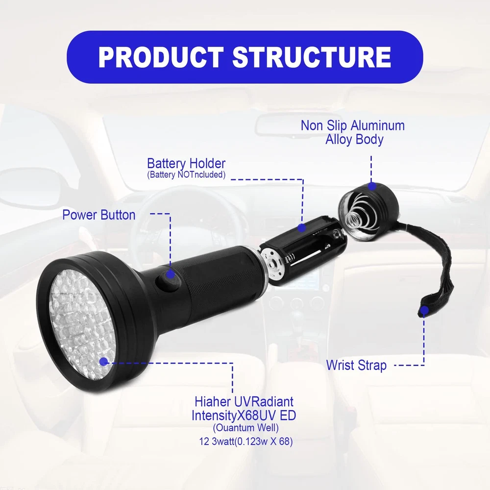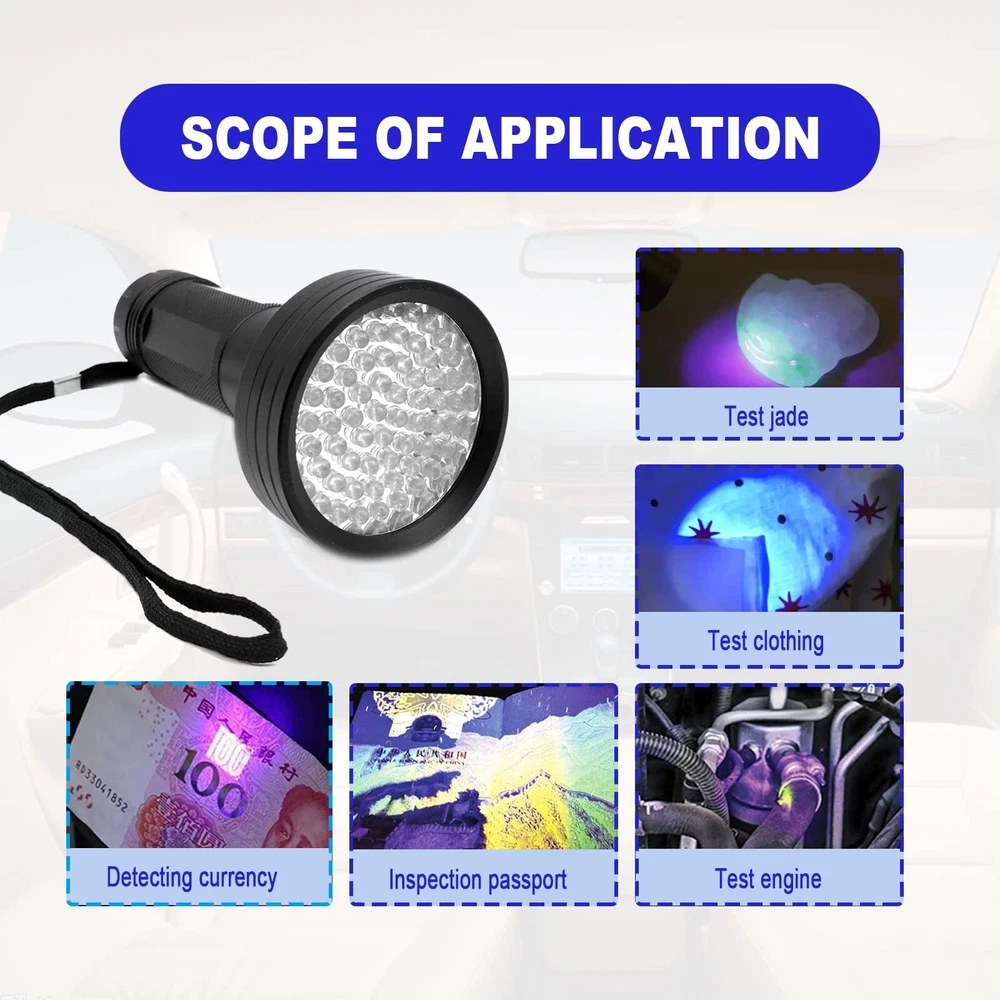 If you don't want to spend a lot of time and money checking the source of leaks in your car or air conditioner, please buy this product to help you detect leaks quickly Features: 1. High quality, can be used in all environments 2. Suitable for all types of UV leak detection dyes 3. Quick and easy to use 4. Uv goggles protect your eyes 5. Long service life Uv protection goggles: Protect your eyes when using AC leak detection flashlight, so that your eyes are not affected by UV rays, safe and reliable. Applicability: Suitable for all types of UV leak detection dye, AC auto air conditioning oil leak detection flashlight can help you quickly find the cause of the leak, even in some special environment, such as bright day, can also pinpoint the source of the leak. Easy to use: Turn on the switch and start checking the source of the leak. Easy and quick can help you save a lot of time. It is a necessary tool for car leakage and air conditioning maintenance. High quality: High precision car air conditioning leak detection tool, complimentary eye protection glasses. The AC Leak Detector flashlight is equipped with 68 high-quality leds that are Forty percent brighter than normal, helping you find the cause of leaks even indoors or outdoors at night. Durability: Long lighting time, the appearance of the texture design makes the flashlight easy to grab, the use of high-quality materials waterproof and dust, long service life.