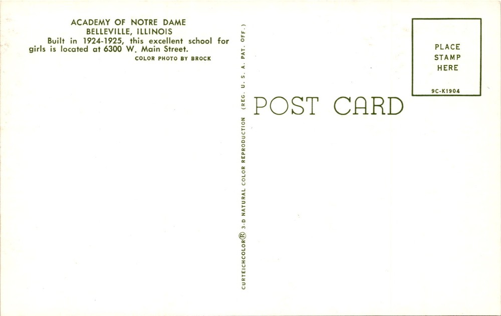 MAKE AN OFFER. THE MORE YOU BUY THE BETTER DEAL I WILL ACCEPT The Academy of Notre Dame in Belleville, Illinois was built in 1924-1925 and is located at 6300 W. Main Street. It is an excellent school for girls, known for its quality education and long history. The postcard features a color photo by Brock Curteichcolor, showcasing the beauty of the academy.