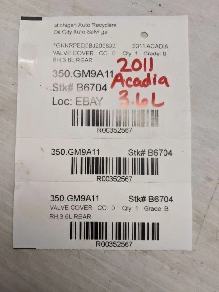 ACADIA 2011 Valve Cover 352567 60 Day Warranty Fast And Free Shipping SEND US YOUR VIN PRIOR TO PURCHASE TO CONFIRM FITMENT!! Interchange: Hollander Part Number: 350.GM9A11 Year: 2011 Model: ACADIA Mileage: 183000 Stock Number: B6704 Conditions/Notes: RH,3.6L,REAR Fits: WARRANTY / GUARANTEE Return Policy All parts we sell come with a 60 Day Money Back Guarantee unless otherwise stated. The 60 day period starts when you take possession of the part. Please contact us through eBay messaging for a Return Merchandise Authorization Number (RMA) before returning any part. We do not cover the cost of labor charges during the installation of your parts. All original shipping costs are non-refundable. Standard Warranty We offer a standard warranty on all mechanical parts. This covers the part only, no labor charges to install the part. We are not responsible for any improper installation or misdiagnosis. SHIPPING NOTES Michigan Auto Recyclers, formerly Oil City Auto Salvage ships to US addresses within the continental 48 states. Shipping to Alaska, Hawaii, Puerto Rico, APO, FPO or PO Box addresses is available for select parts only. Please contact us through eBay messaging for details and shipping rates. Local Pick-up at our facilities is available. Please contact us prior to your purchase to arrange local pick-up. Buyer must select 'Buy It Now' prior to local pick-up. Please allow up to 10 days for delivery unless your part is included in eBay's Guaranteed Delivery Program. Most areas in the US are within 5 days. If an item arrives damaged, please contact us via eBay messaging within 24 hours for assistance. *Some areas may require additional shipping fees about us Please contact us prior to purchasing this part if you have any questions regarding our business policies, the warranties or guaranties we offer or the fitment of this part with your vehicle. We strive to make sure your vehicles repair needs are met the first time you order a part through our store on eBay. To do so, we are happy to verify your vehicles VIN number prior to your purchase, please use the Contact Seller feature within the eBay listing. We want to provide you with the best possible customer experience. Please contact us through eBay Messaging and we will respond promptly. If you have questions about our listings or issues with a purchase, please email us. Our business hours are 8 to 5 Eastern Standard Time Monday through Friday.