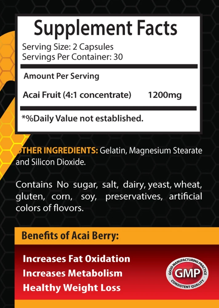 ACAI BERRY EXTRACT - Digestive Well-Being Support - 1B 60 Caps ACAI BERRY 1200. Increases Fat Oxidation Increases Metabolism Weight Loss Appetite Suppressant Made in USA 1 Bottles 60 Capsules Indulge in the extraordinary world of wellness with our Acai Berry (4:1 extract) 600 mg supplement, a testament to the age-old secrets of the Amazon rainforest. Immerse yourself in the fascinating story of the Acai Berry, plucked from the heart of the lush Amazonian landscapes, where it has been revered for centuries by indigenous communities for its incredible health benefits. Unveiling the Mystique of Acai Berry: Picture the vibrant colors of the Amazon, where the Acai Palm tree flourishes in the nutrient-dense soil, creating a haven for the precious Acai Berry. This small, purple jewel has woven itself into the cultural fabric of South American tribes, who have passed down the wisdom of its exceptional properties through generations. Our Acai Berry supplement encapsulates this mystique, bringing you the essence of the rainforest in each capsule. The Art of Harvesting: Embark on a journey that respects nature and sustains the delicate balance of the Amazon ecosystem. Our Acai Berry is sourced with utmost care, utilizing sustainable and ethical harvesting practices. By choosing our supplement, you not only prioritize your well-being but also contribute to the preservation of the rainforest, ensuring its bounty for generations to come. Antioxidant Symphony: Acai Berry is a symphony of antioxidants, including anthocyanins and polyphenols, that dance within your body, neutralizing free radicals and safeguarding your cells. This antioxidant powerhouse supports overall cellular health and may contribute to a radiant, youthful complexion. Revitalize Your Essence: Acai Berry, a natural source of energy, invigorates your body and spirit. Whether you seek an extra kick during workouts or a remedy for daily fatigue, our supplement may be your key to sustained vitality. Gut Harmony: Nurture your digestive health with the fiber-rich goodness of Acai Berry. It promotes regular bowel movements and cultivates a healthy gut microbiome, enhancing nutrient absorption for comprehensive digestive well-being. SUPPLEMENT FACTS: Serving Size: 2 Capsules Servings Per Container: 30 Acai Fruit (4:1 concentrate) 1200mg OTHER INGREDIENTS: Gelatin, Magnesium Stearate and Silicon Dioxide. Contains No sugar, salt, dairy, yeast, wheat, gluten, corn, soy, preservatives, artifcial colors of Covors. SUGGESTED USE: As a dietary supplement, adult take one (1)capsule, one to three times daily between meals, or as directed by a health care professional.