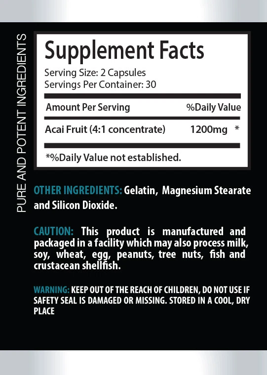 ACAI BERRY EXTRACT - Optimal Immune Boost - 1B 60 Caps Acai Berry Extract 1200mg Powerful Antioxidant Healthy Metabolism Healthy Weight Loss Made In USA 1 Bottles 60 Capsules Introducing our Acai Berry (4:1 extract) 600 mg supplement – a potent health ally hailing from the Amazon rainforest. Delve into the science-backed benefits of this remarkable fruit, meticulously extracted to bring you a powerhouse of nutrients that support your overall well-being. Sustainable Sourcing: Our commitment extends beyond your health to the preservation of the Amazon ecosystem. We employ ethical harvesting practices to ensure a minimal ecological footprint, prioritizing both your health and environmental sustainability. Acai Berry Origins: Native to the Amazon, the Acai Berry has gained recognition for its nutritional density and potential health advantages. Our supplement encapsulates the essence of this fruit, sourced responsibly from the heart of the rainforest, adhering to sustainable harvesting practices. Health Benefits Explored: Antioxidant Armor: Acai Berry is laden with antioxidants, such as anthocyanins and polyphenols, known for their ability to combat oxidative stress. This antioxidant protection contributes to cellular health and may mitigate the effects of free radicals. Cardiovascular Support: Rich in anthocyanins and plant sterols, Acai Berry may contribute to cardiovascular health by helping maintain optimal cholesterol levels and supporting healthy blood circulation. Natural Energy Boost: Acai Berry serves as a natural energy source, providing a sustainable boost for physical and mental vitality. Whether for your workout routine or daily fatigue, this supplement may offer the energy lift you need. Digestive Well-Being: With its high fiber content, Acai Berry supports digestive health by promoting regular bowel movements and fostering a balanced gut microbiome. Improved nutrient absorption contributes to comprehensive digestive well-being. Immune Boost: Packed with vitamins, minerals, and immune-supporting compounds, Acai Berry enhances your body's defense mechanisms. Strengthening your immune system, it aids in protecting against external threats. Immerse yourself in the health benefits of the Amazon with our Acai Berry (4:1 extract) 600 mg supplement. Designed with a focus on quality and sustainability, this product embodies a science-backed approach to holistic health. Elevate your well-being with the potent advantages of Acai Berry, meticulously extracted to support your journey toward a healthier lifestyle. Supplement Facts: Acai Fruit (4:1 concentrate) 1200mg OTHER INGREDIENTS: Gelatin, Magnesium Stearate and Silicon Dioxide. Contains: No sugar, salt, dairy, yeast, wheat, gluten, corn, soy, preservatives, arti cial colors of ovors. SUGGESTED USE : As a dietary supplement, adults take one (1) tablet, one (1) to three (3) times daily between meals, or as directed by a health care professional. Serving Size: 2 Capsules, Serving Per Container: 30