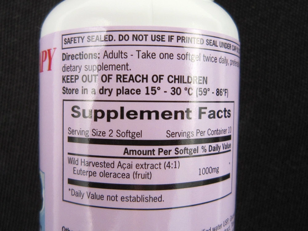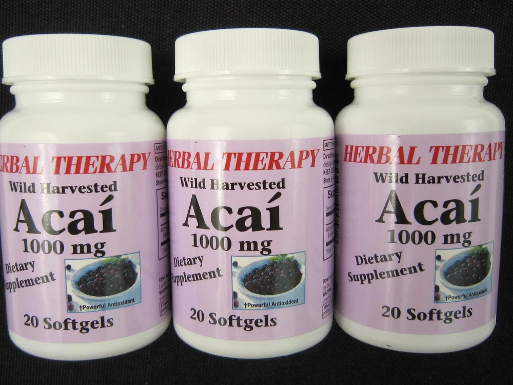 Herbal Therapy Wild Harvested - ACAI extract (4:1) ACAI 1000 mg. One bottle contains: 20 softgels For sale: 3(three) bottles 20+20+20=60 softgels Dietary Supplement Helps Protect against Free Radicals* Powerful Antioxidant with Natural Flavonoids. Acai has gained rapid popularity as a superfood used for health and vitality.* Sourced directly from Brazil, our beneficial formula utilizes Acai pulp and provides you with the natural flavonoids and antioxidants that make Acai so popular. Antioxidants help protect against free radicals that can damage cells including those of the heart, eyes and skin. No Artificial Color, Flavors or Sweetener, No Preservatives, No Sugar, No Starch, No Milk, No Lactose, No Gluten, No Wheat, No Yeast, No Fish. Sodium Free. *These statements have not been evaluated by the Food and Drug Administration. This product is not intended to diagnose, treat, cure or prevent any disease. For adults, take one (1) tablets twice daily, preferably after a meal. Store in a cool, dry place. If you are pregnant, nursing, or taking any medications, consult your doctor before use. Discontinue use and consult your doctor if any adverse reactions occur. Not intended for use by persons under the age of 18. Keep out of reach of children Ingredients: Sunfloweroil, Gelatin, purified water USP, glycerin, monoglycerides, lecithin, yellow beeswax, caramel powder, dark carob extract, titanium dioxide. Nutrition Facts Serving Size : 1 Tablet Serving per Container : 20 Amount Per Serving % Daily value* Wild Harvested ACAI extract (4:1) Euterpe oleracea (fruit) - 1000 mg