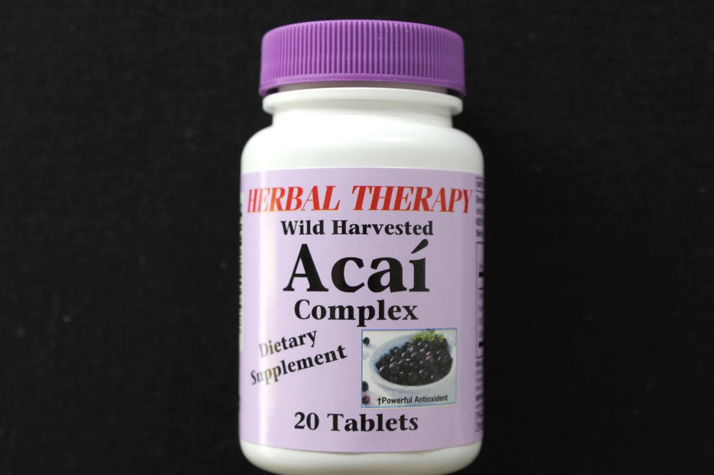 Herbal Therapy Wild Harvested ACAI complex Dietary Supplement Helps Protect against Free Radicals* Powerful Antioxidant with Natural Flavonoids. Acai has gained rapid popularity as a superfood used for health and vitality.* Sourced directly from Brazil, our beneficial formula utilizes Acai pulp and provides you with the natural flavonoids and antioxidants that make Acai so popular. Antioxidants help protect against free radicals that can damage cells including those of the heart, eyes and skin. No Artificial Color, Flavors or Sweetener, No Preservatives, No Sugar, No Starch, No Milk, No Lactose, No Gluten, No Wheat, No Yeast, No Fish. Sodium Free. For adults, take one (1) tablets twice daily, preferably after a meal. Store in a cool, dry place. If you are pregnant, nursing, or taking any medications, consult your doctor before use. Discontinue use and consult your doctor if any adverse reactions occur. Not intended for use by persons under the age of 18. Keep out of reach of children . Ingredients: Green tea leaf extract, Acai fruit (5:1), Yerba mate leaf, Hoodia gordonii cactus, capsicum fruit, Fueoxanthin wakame seaweed, Guarana seed extract, Uva-ursl leaf, Green coffee extract bean, Polygonuin cuspidntum root extract (50% resveratrol) Nutrition Facts Serving Size : 1 Tablet Serving per Container : 20 Amount Per Serving % Daily value* Chromium 250 mg Proprietary Blend 882 mg EGCG 90 mg Caffeine 50 mg Exp10.2027 For sale: one (1) bottle - 20 tablets