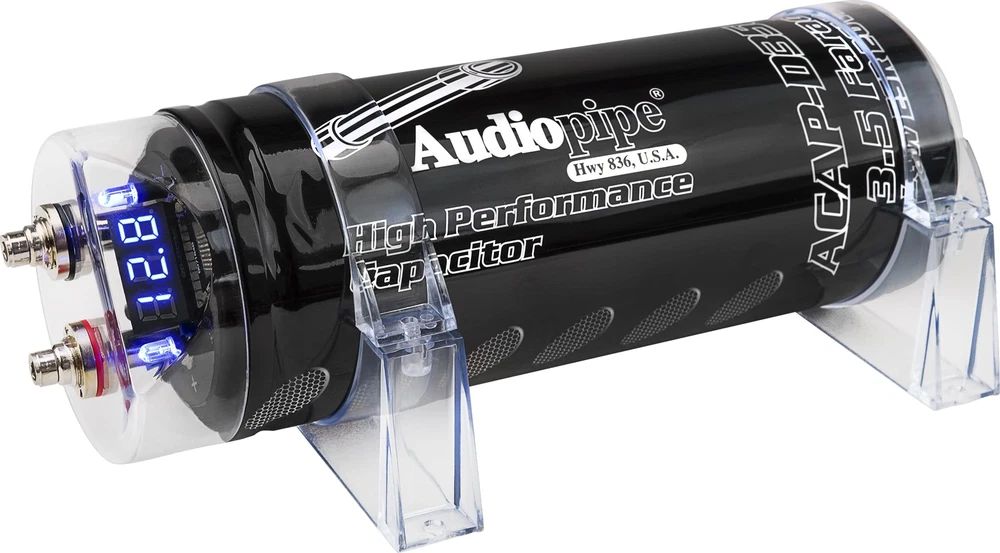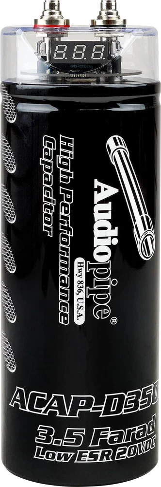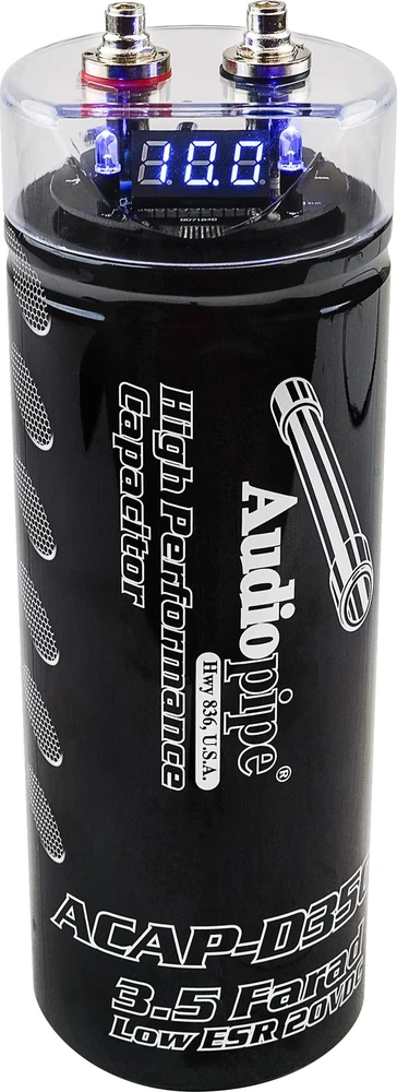 Buffer your amplifier's power source with the ACAP Farad Digital Car Audio Capacitor. This power cap will store temporary power and discharge it to stabilize voltage to the amplifier, giving you more consistent power to your subs or speakers. It features a low level input voltage of 20 volts and a high level input voltage of 24 volts. Also included is a digital display with a status indicator with a black finish. Make your system operate more efficiently and powerfully with the Digital Car Audio Capacitor. AMPLIFIER PROTECTION: Protects your amplifier from voltage surges when you're playing your music loud VEHICLE DYNAMIC CONTROL: 20 max with 24-volt surge for peak stability EQUIVALENT SERIES RESISTANCE: 0.002 ohm or less DIGITAL DESIGN: Includes digital electronic protection and digital display with status indicator; Color: Black SPECIFICATIONS: Weight: 4.5 pounds; Capacitance: 3.5 farad