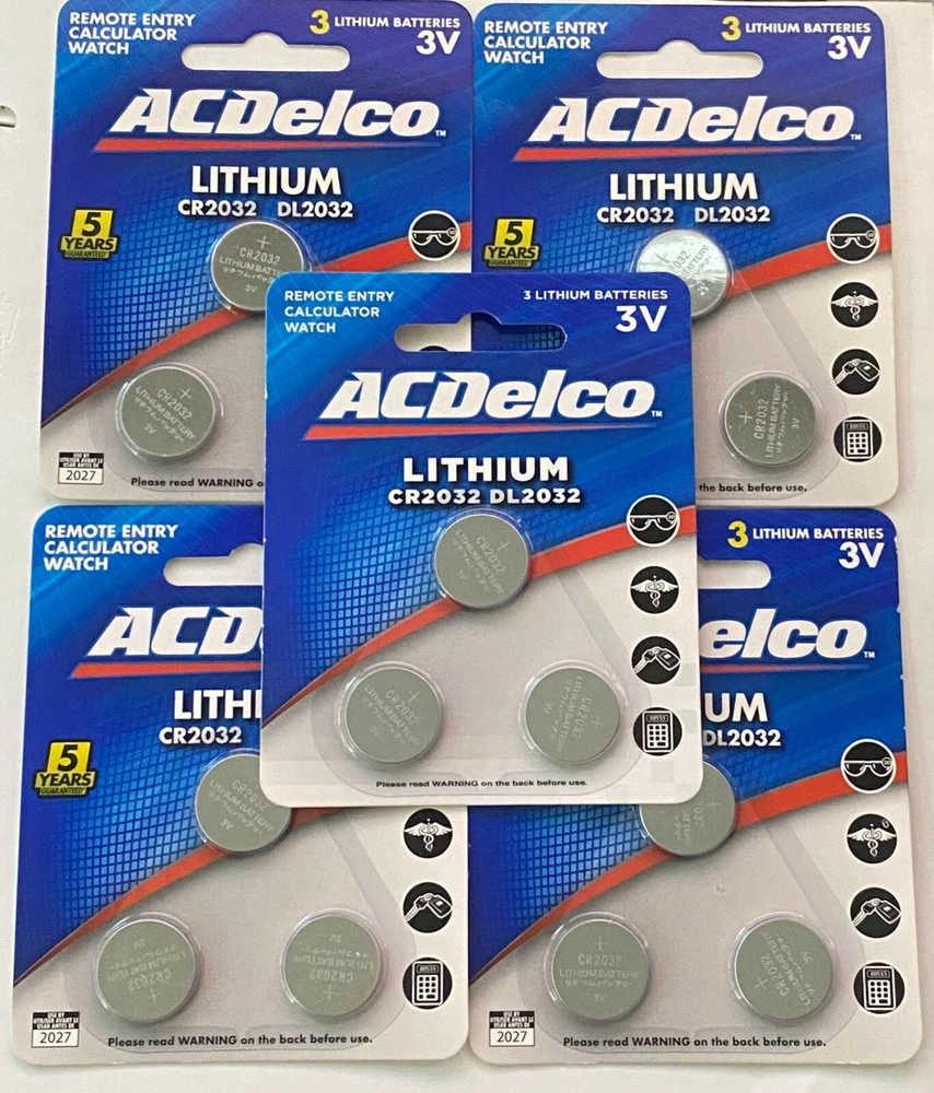 This lot includes 15 Count ACDelco CR2032 Lithium 3V Batteries, with 5 Packs and 3 Count each. Brand New & Factory Sealed! These batteries are suitable for a variety of purposes, from powering small electronic devices to providing backup power during outages. The expiration date for these batteries is in the year 2027. The batteries are made with Lithium Based chemical composition and have a voltage of 3V. They are classified as Coin/Button Cell type and have a battery size of CR2032.