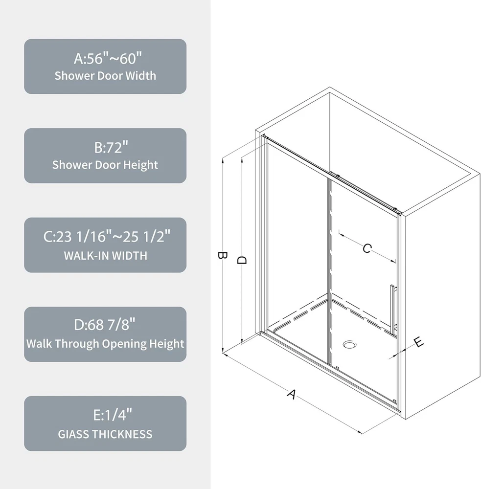 【Adjustable Size】: Our shower doors features a 1 9/16” adjustable wall channel, perfect for widths between 56-60 inches and heights of 72 inches. This design seamlessly fits various shower layouts, making installation a breeze. 【Safety and Security】: Our glass shower door is made of ANSI certified 1/4" (6 mm) thick clear tempered glass, featuring an explosion-proof film for durability and protective performance. Aluminum frame, 304 stainless steel hardware to ensure superior quality and corrosion resistance. 【Waterproof and Easy Clean】: The glass surface is coated with a nano waterproof layer, effectively preventing water spots and soap buildup, reducing the frequency of cleaning and facilitating maintenance.The bottom and side seal strip effectively prevent splashes and leaks, keeping your bathroom floor dry and tidy. 【Magnetic Seal】: Our shower door is equipped with a magnetic seal design, providing improved sealing and a smoother, quieter closing experience. This design offers superior water resistance compared to standard seals, effectively separating dry and wet areas and maintaining a dry and clean bathroom. 【Easy to Install】: The sliding shower door comes with detailed instructions and all necessary mounting hardware for a simple and hassle-free installation. Professional Installation is recommended to ensure optimal results.
