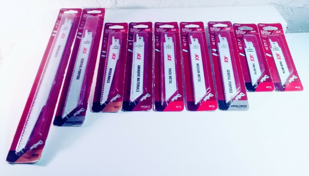 ACE HARDWARE Reciprocating Saw Bi-Metal 9 Piece Blade Set USA (See Description). 12"6TPI BI-METAL, 8"10/14 TPI BI-METAL, 6"6TPI BI-METAL, 6"30 GRIT TC, 6"14TPI BI-METAL, 6" 18TPI BI-METAL, 6" 10TPI BI-METAL, 4" 24TPI BI-METAL, 4" 14TPI BI-METAL. Condition is "New". Shipped with USPS Priority Mail.