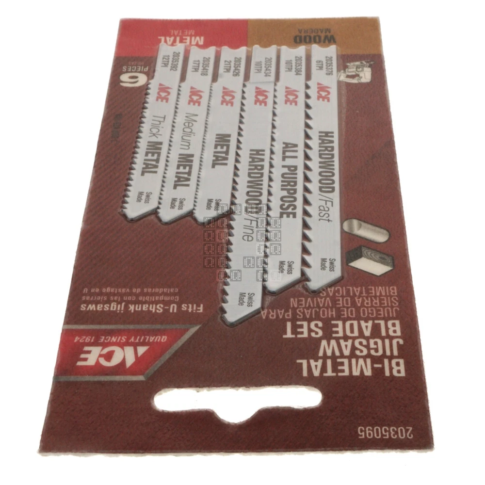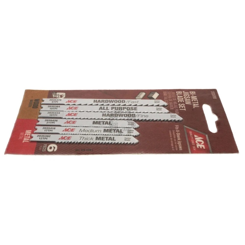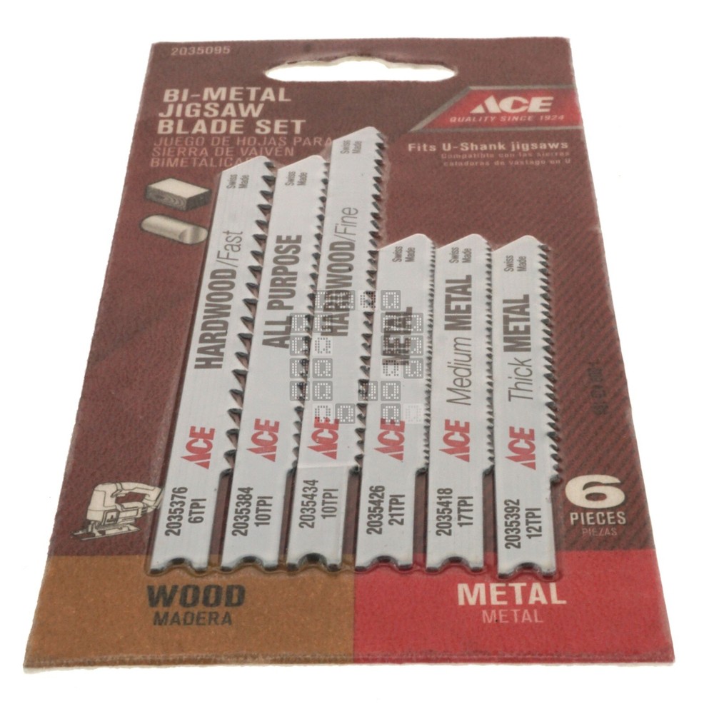 Product Description : ACE Hardware 2035095 6-Piece Bi-Metal Jigsaw Blade Set for Wood and Metal Product Specifications : Brand ACE Hardware Manufacturer Part Number 2035095 Cross Reference (Fit/Form/Function) Shank U-Shank Contents One (1) package containing six (6) Jigsaw blades Color White Overall Length 2-3/4" 3-5/8" Material Bi-Metal TPI 6 10 12 17 21 for use on Metal Wood UPC 082901036852 Country of Origin Switzerland Notes New. Location G2-39 About Us Payments Returns Shipping Listing Mistakes Notes Quagmire Repair LLC is a small repair shop located in Lancaster County, Pennsylvania. Our goal is to save you money and provide quality parts for all your repair projects. Visit our Store See our feedback Accepted Payment Methods: We accept payments through e B a y 's managed payments program. All winning auctions and offers must be paid within 4 days; An unpaid item dispute will be opened through e B a y for all unpaid purchases. Return Policy: We accept returns for 30 days. (starting at the date you received the product) We can only accept returns of new & unused items! (If you installed, used or damaged the product, it is no longer considered 'new'. We ask the buyer to pay for the return shipping charges*. If you would like to return a product, please open a return through e B a y . Please do not send a product back to us without opening a return request first! * We can't afford to offer free returns and keep prices low, so we've decided to skip free returns and keep prices low instead. Defective Products/Seller Mistakes Policy: Please keep all original packaging! Please contact us through e B a y and provide pictures and a description of the problem you identified. If we determine that a product has been damaged in shipping, is dead on arrival (DOA) or is defective from new, we will offer a refund or replacement (provided we have stock). You may be asked to provide pictures or to send the product back to us for inspection before we can offer a refund or replacement. If we realize we shipped the wrong product to you, sent the wrong quantity of parts or otherwise goofed on your order, we will offer you an immediate refund or replacement (provided we have stock). You may be asked to provide pictures or to send the incorrect product(s) back to us (at our expense). Handling Time: We have up to a two (2) day handling time. Shipping Method: United States & its Territories: We offer USPS Ground Advantage, USPS Priority Mail or UPS Ground as our preferred shipping methods. Canada, Mexico and all other Countries: We offer shipments through e B a y 's Global Shipping Program. Combined Shipping: All the listings in our e B a y store have combined shipping enabled by default. This allows you to add parts from our store to your e B a y cart and pay one shipping charge for your entire order. Shipping prices are set by UPS or USPS and are calculated based on total package weight and destination. Please Note: Do not confuse us with the shipping carrier. We DO NOT set delivery estimates, NOR do we offer refunds or replacements for packages that are lost, delayed, mis-delivered or damaged. It is the buyer's responsibility to contact the Shipping Carrier to resolve any delivery issues or file any claims. Listing Quality Disclaimer: Quagmire Repair has done their best to make this listing accurate and reliable. Quagmire Repair will not be held liable for any mistakes in this listing or any damages and/or losses related to mistakes in this listing. Manufacturer product information (where available) supersedes any information in this listing. Product manufacturers can and do change product suppliers and products at any time without prior notice. It is the duty of the buyer to verify that the product fits their intended use before buying. If a buyer notices an error in this listing, identifies a difference between the listing and the product or has any questions, please contact Quagmire Repair using e B a y 's 'contact seller' button. Corrections, if needed, will be made in a timely manner to this listing. relisted on 11/6/2024