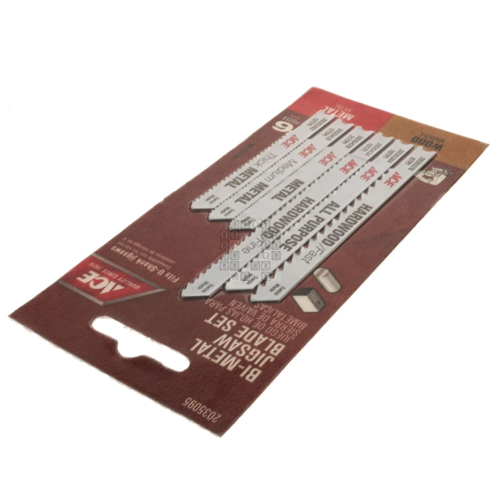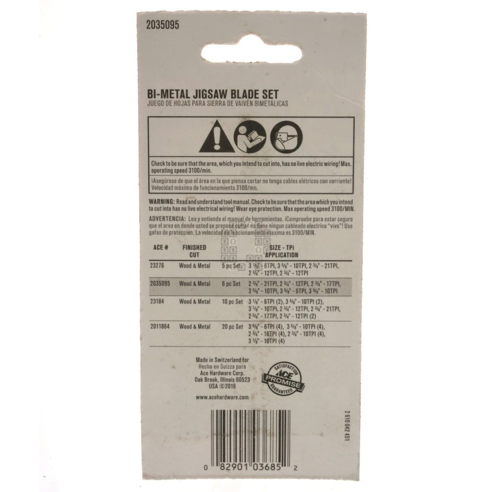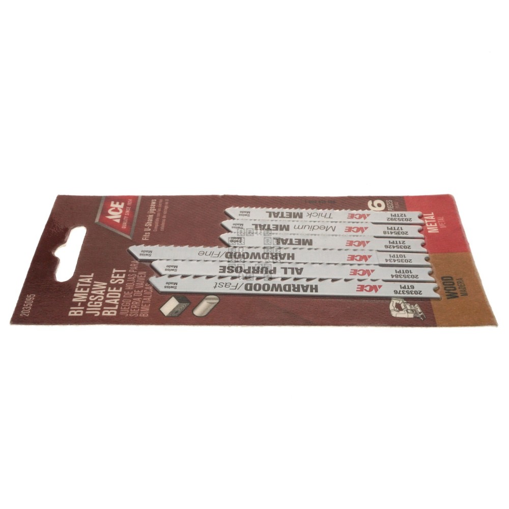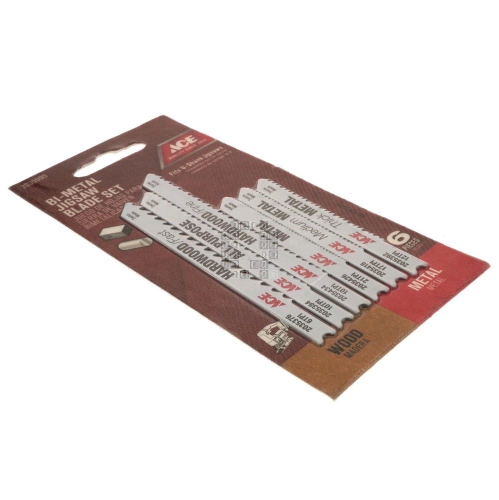 Product Description : ACE Hardware 2035095 6-Piece Bi-Metal Jigsaw Blade Set for Wood and Metal Product Specifications : Brand ACE Hardware Manufacturer Part Number 2035095 Cross Reference (Fit/Form/Function) Shank U-Shank Contents One (1) package containing six (6) Jigsaw blades Color White Overall Length 2-3/4" 3-5/8" Material Bi-Metal TPI 6 10 12 17 21 for use on Metal Wood UPC 082901036852 Country of Origin Switzerland Notes New. Location G2-39 About Us Payments Returns Shipping Listing Mistakes Notes Quagmire Repair LLC is a small repair shop located in Lancaster County, Pennsylvania. Our goal is to save you money and provide quality parts for all your repair projects. Visit our Store See our feedback Accepted Payment Methods: We accept payments through e B a y 's managed payments program. All winning auctions and offers must be paid within 4 days; An unpaid item dispute will be opened through e B a y for all unpaid purchases. Return Policy: We accept returns for 30 days. (starting at the date you received the product) We can only accept returns of new & unused items! (If you installed, used or damaged the product, it is no longer considered 'new'. We ask the buyer to pay for the return shipping charges*. If you would like to return a product, please open a return through e B a y . Please do not send a product back to us without opening a return request first! * We can't afford to offer free returns and keep prices low, so we've decided to skip free returns and keep prices low instead. Defective Products/Seller Mistakes Policy: Please keep all original packaging! Please contact us through e B a y and provide pictures and a description of the problem you identified. If we determine that a product has been damaged in shipping, is dead on arrival (DOA) or is defective from new, we will offer a refund or replacement (provided we have stock). You may be asked to provide pictures or to send the product back to us for inspection before we can offer a refund or replacement. If we realize we shipped the wrong product to you, sent the wrong quantity of parts or otherwise goofed on your order, we will offer you an immediate refund or replacement (provided we have stock). You may be asked to provide pictures or to send the incorrect product(s) back to us (at our expense). Handling Time: We have up to a two (2) day handling time. Shipping Method: United States & its Territories: We offer USPS Ground Advantage, USPS Priority Mail or UPS Ground as our preferred shipping methods. Canada, Mexico and all other Countries: We offer shipments through e B a y 's Global Shipping Program. Combined Shipping: All the listings in our e B a y store have combined shipping enabled by default. This allows you to add parts from our store to your e B a y cart and pay one shipping charge for your entire order. Shipping prices are set by UPS or USPS and are calculated based on total package weight and destination. Please Note: Do not confuse us with the shipping carrier. We DO NOT set delivery estimates, NOR do we offer refunds or replacements for packages that are lost, delayed, mis-delivered or damaged. It is the buyer's responsibility to contact the Shipping Carrier to resolve any delivery issues or file any claims. Listing Quality Disclaimer: Quagmire Repair has done their best to make this listing accurate and reliable. Quagmire Repair will not be held liable for any mistakes in this listing or any damages and/or losses related to mistakes in this listing. Manufacturer product information (where available) supersedes any information in this listing. Product manufacturers can and do change product suppliers and products at any time without prior notice. It is the duty of the buyer to verify that the product fits their intended use before buying. If a buyer notices an error in this listing, identifies a difference between the listing and the product or has any questions, please contact Quagmire Repair using e B a y 's 'contact seller' button. Corrections, if needed, will be made in a timely manner to this listing. relisted on 11/6/2024