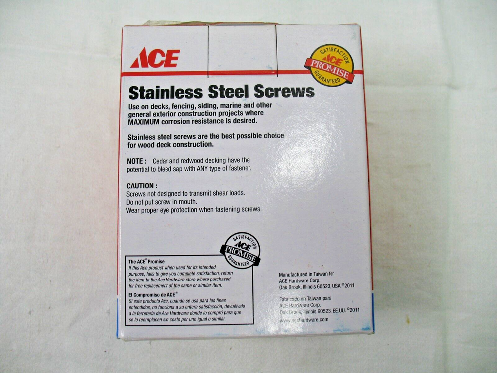 ACE Hardware Stainless Steel Decking Screws #8 x 1-3/4 inch 1# box = approx. 138 Torx T20 star drive Flat head with self-counter sink nibs Type 17 drilling point