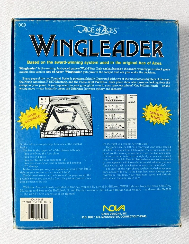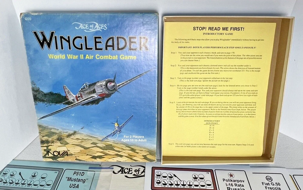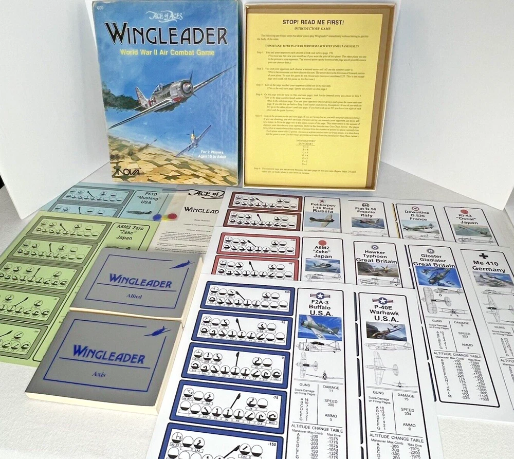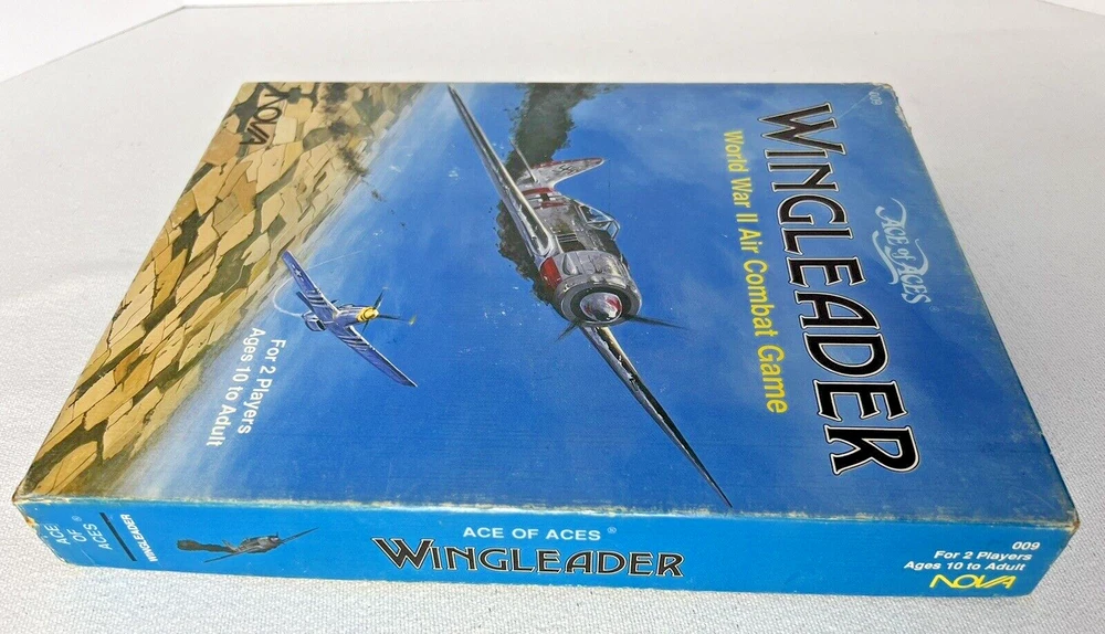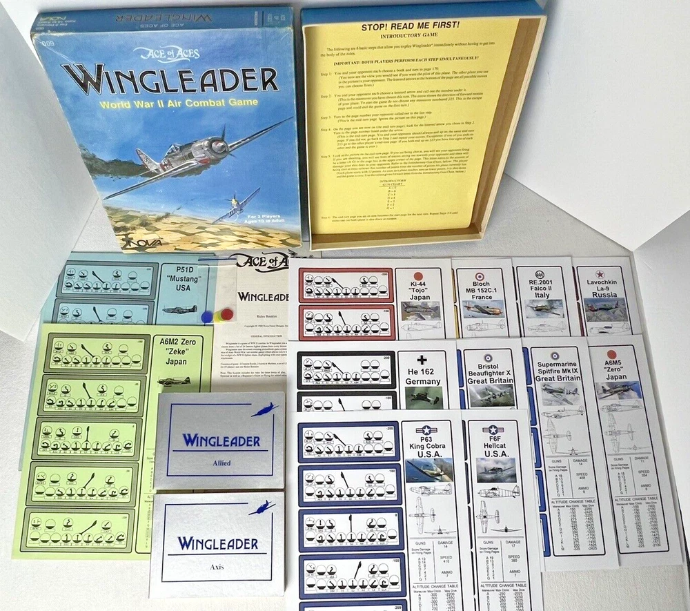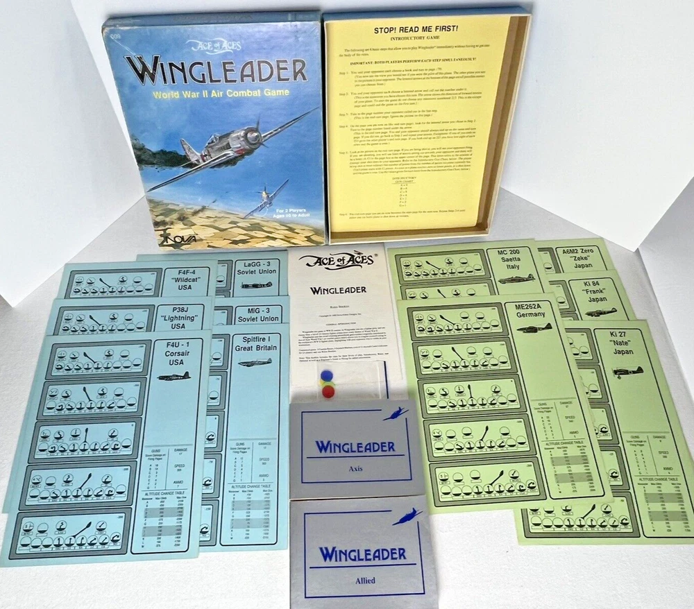 ACE of ACES - WINGLEADER, World War II Air Combat + Player Aide Extras 10 plane cards (20 additional planes) 1988 - Nova Game Designs A game in the Ace of Aces series, Wingleader focuses on WWII fighter combat. 24 fighters are modeled in the game. The booklet game design allows this game to be highly portable, immediate play, and is easy to learn. The two booklets are paperbacks depicting the pilots view from the cockpit. There are 24 historic planes in the original game. Each plane is represented in a cardstock sheet which gives the plane's speed, gunnery damage, and the five throttle positions. Original Components: 1. Two 4-1/2" x 6" silver paperback gamebooks with blue printing on cover (one Axis and one Allied.) 2. One 8-1/2" x 11" sheet with the six steps for basic play. 3. Twelve 8-1/2" x 11" two-sided card stock Aircraft Cards (six blue allied and six green axis.) 4. Four different colored 5/8" diameter plastic discs. 5. One 5-1/2" x 8-1/2" rules booklet bound with two staples. Extra Components: 1. Ten 8-1/2" x 11" two-sided white card stock Aircraft Cards (twenty additional Allies and Axis aircraft in color)