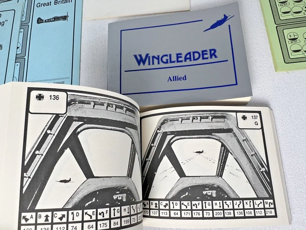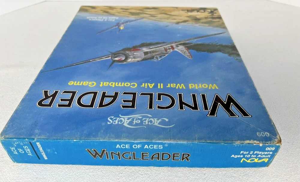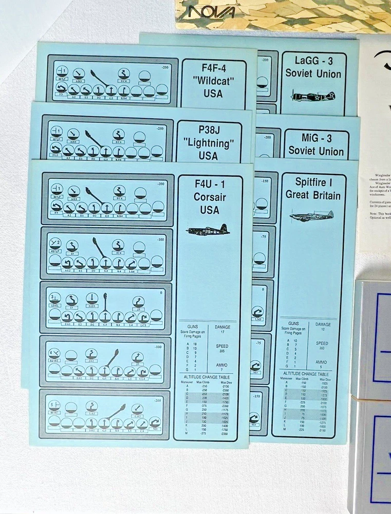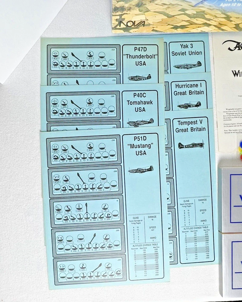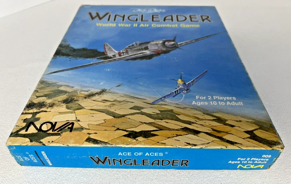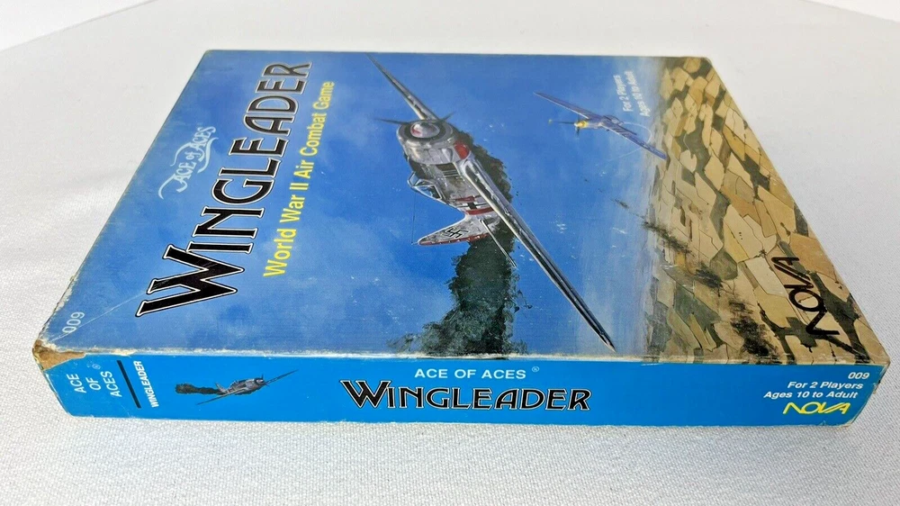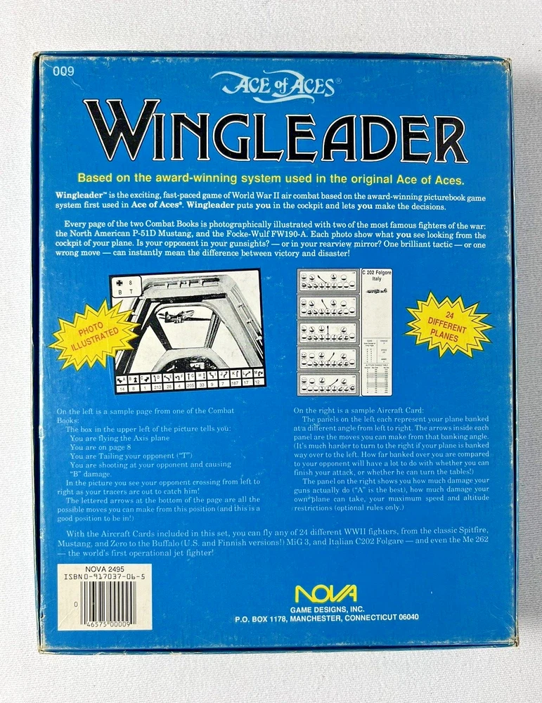 ACE of ACES - WINGLEADER, World War II Air Combat + Player Aide Extras 10 plane cards (20 additional planes) 1988 - Nova Game Designs A game in the Ace of Aces series, Wingleader focuses on WWII fighter combat. 24 fighters are modeled in the game. The booklet game design allows this game to be highly portable, immediate play, and is easy to learn. The two booklets are paperbacks depicting the pilots view from the cockpit. There are 24 historic planes in the original game. Each plane is represented in a cardstock sheet which gives the plane's speed, gunnery damage, and the five throttle positions. Original Components: 1. Two 4-1/2" x 6" silver paperback gamebooks with blue printing on cover (one Axis and one Allied.) 2. One 8-1/2" x 11" sheet with the six steps for basic play. 3. Twelve 8-1/2" x 11" two-sided card stock Aircraft Cards (six blue allied and six green axis.) 4. Four different colored 5/8" diameter plastic discs. 5. One 5-1/2" x 8-1/2" rules booklet bound with two staples. Extra Components: 1. Ten 8-1/2" x 11" two-sided white card stock Aircraft Cards (twenty additional Allies and Axis aircraft in color)