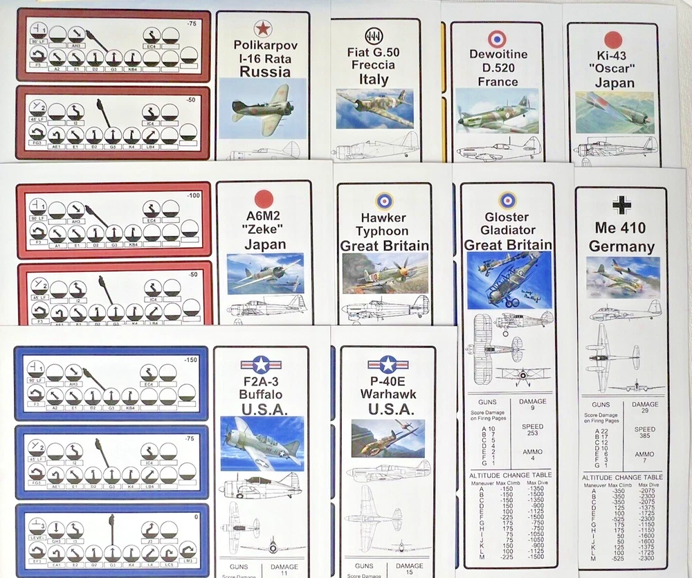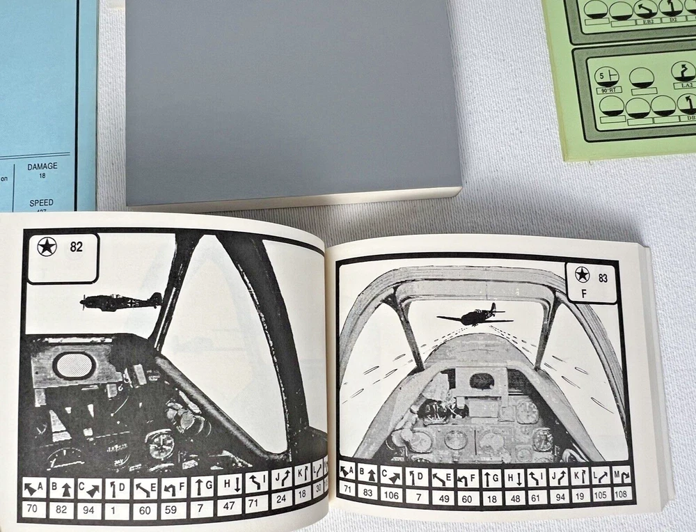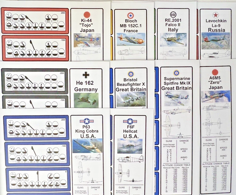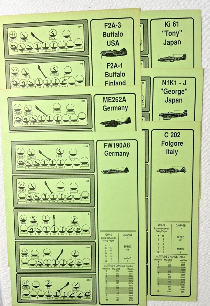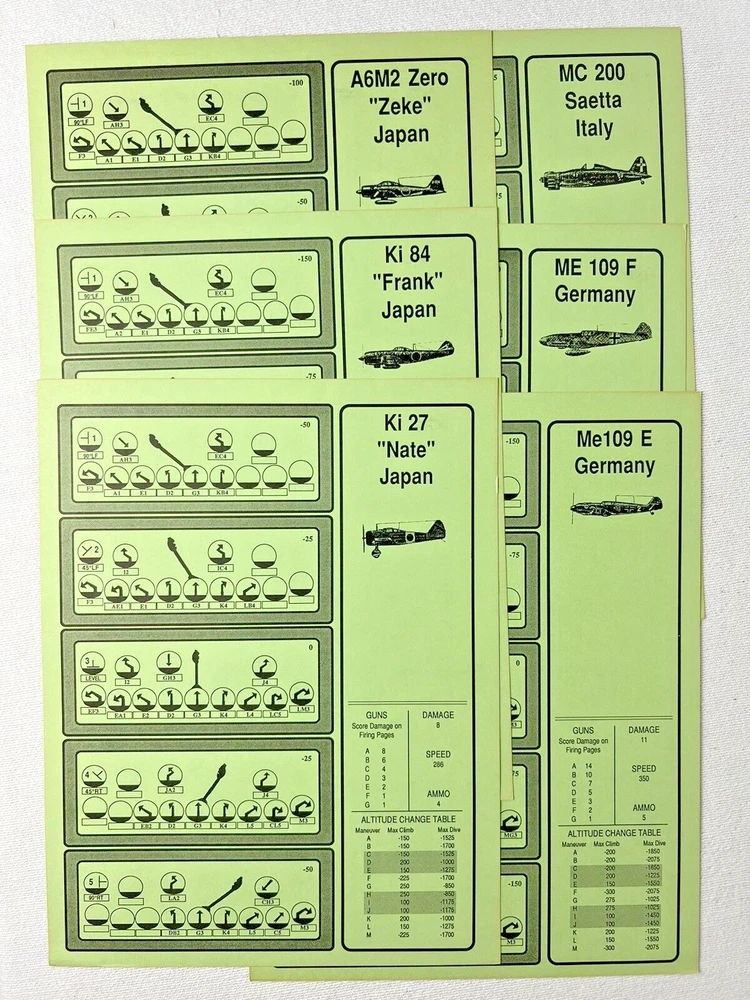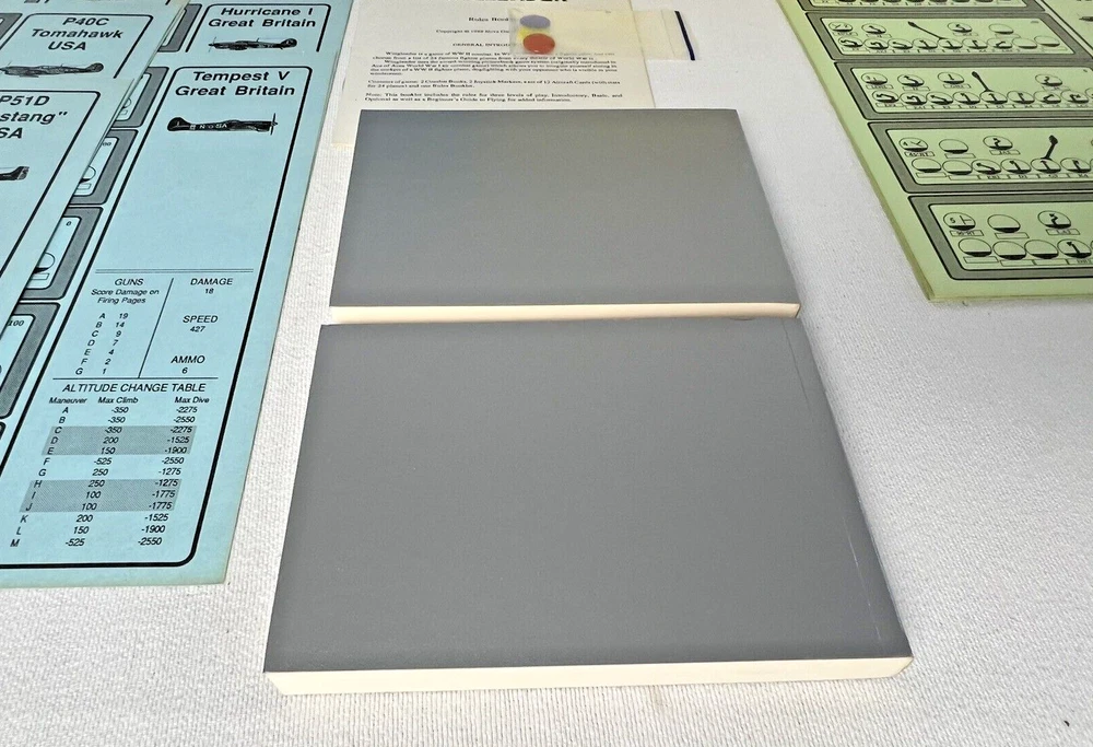ACE of ACES - WINGLEADER, World War II Air Combat + Player Aide Extras 10 plane cards (20 additional planes) 1988 - Nova Game Designs A game in the Ace of Aces series, Wingleader focuses on WWII fighter combat. 24 fighters are modeled in the game. The booklet game design allows this game to be highly portable, immediate play, and is easy to learn. The two booklets are paperbacks depicting the pilots view from the cockpit. There are 24 historic planes in the original game. Each plane is represented in a cardstock sheet which gives the plane's speed, gunnery damage, and the five throttle positions. Original Components: 1. Two 4-1/2" x 6" silver paperback gamebooks with blue printing on cover (one Axis and one Allied.) 2. One 8-1/2" x 11" sheet with the six steps for basic play. 3. Twelve 8-1/2" x 11" two-sided card stock Aircraft Cards (six blue allied and six green axis.) 4. Four different colored 5/8" diameter plastic discs. 5. One 5-1/2" x 8-1/2" rules booklet bound with two staples. Extra Components: 1. Ten 8-1/2" x 11" two-sided white card stock Aircraft Cards (twenty additional Allies and Axis aircraft in color)