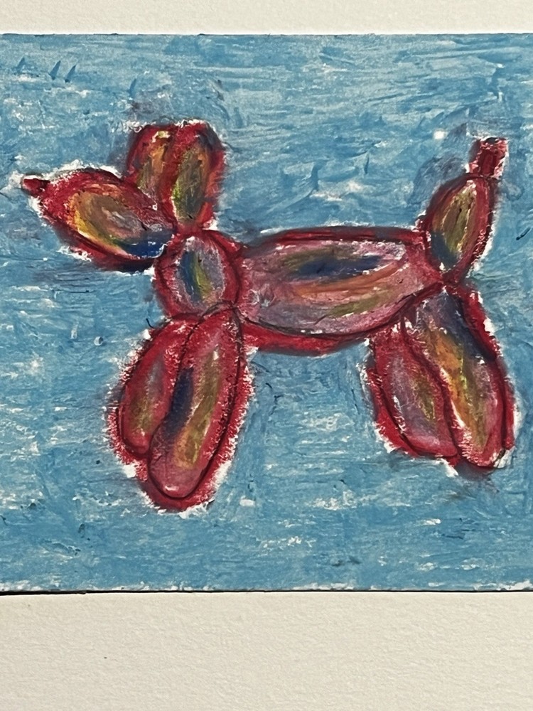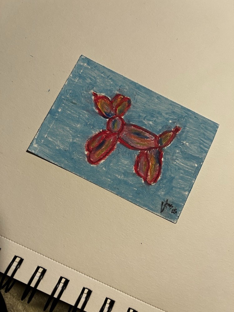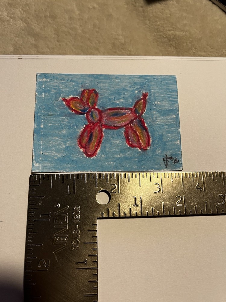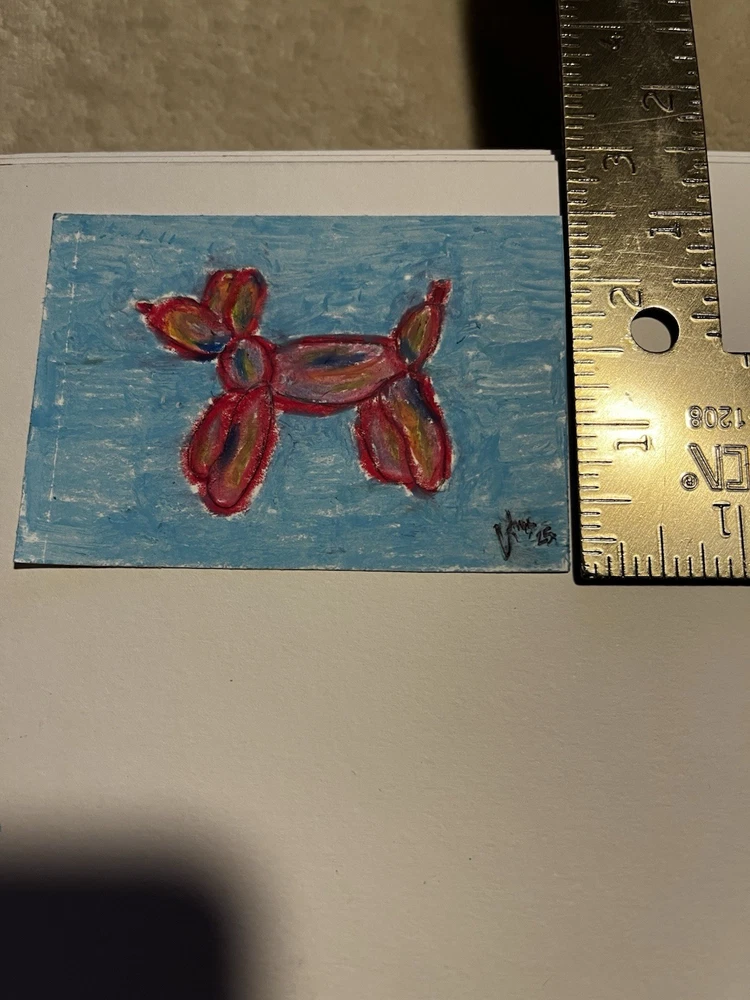 The ACEO Art Card featuring a Balloon Animal design is a small, original drawing made with oil pastel on paper. Measuring 2.5 x 3.5 inches, this ultra-contemporary piece showcases a pop art and expressionistic style. Handmade in Texas, USA, this unique artwork captures the theme of art in a fun and creative way, making it a perfect addition to any art collection or as a standalone statement piece. Made by: Angelina Rodriguez