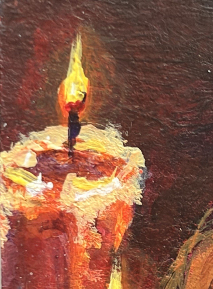 Portrait art of woman wearing red clothes between lit candles in the dark, high contrast contemporary realism. Original OOAK art by Emily Tomeu Lorenzo 3.5 x 2.5 inches (ACEO) Acrylic paint on 140 1b paper. Sealed with Acrylic DAS13 matte sealer. Number 2 out of 5 in "Quiet Companions" collection. Free Shipping. Shipped inside a plastic sleeve and packaged with care. Please check out my other art in my Ebay shop and don't forget to leave a review after purchase. If you want to join my email list, send me your email after purchase! Thank you for considering me! <3