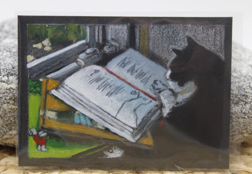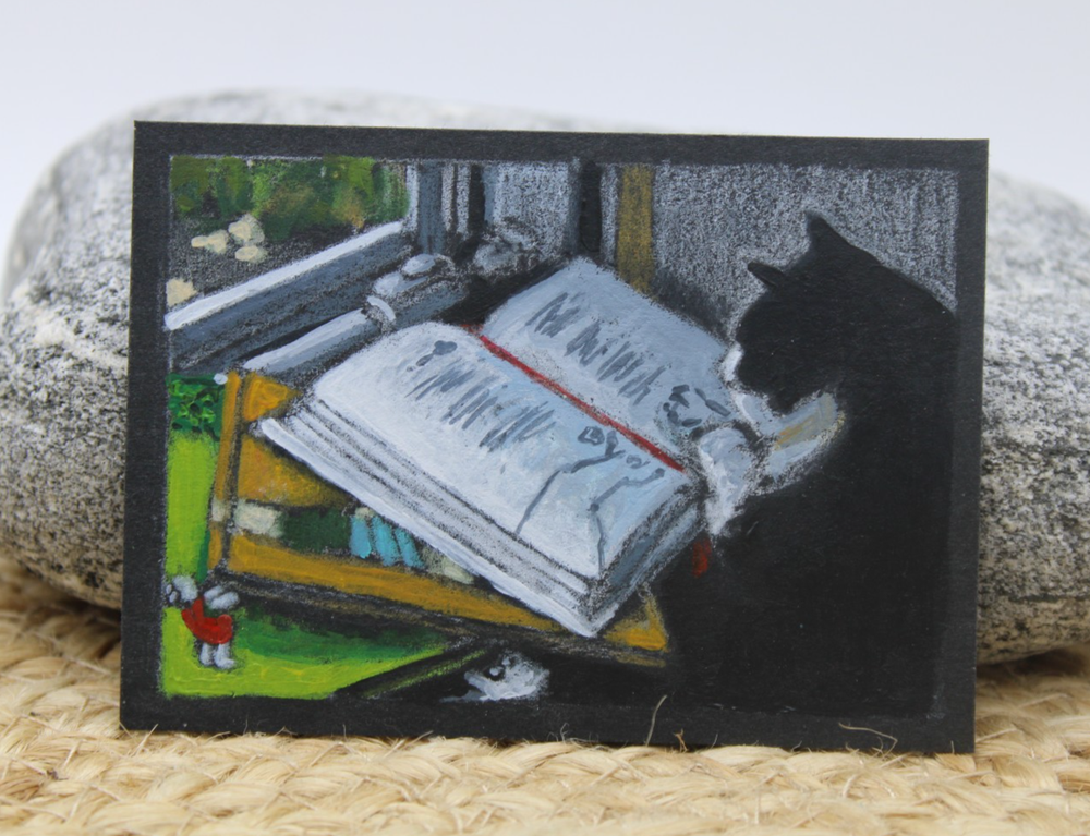 This is an adorable original artwork done by me, Rockn Palette/ Amy Moreno. It is of my cute tuxedo cat, Thomas, sitting at my front door "reading". This artwork is made with (mixed media) colored pencil and acrylic paint on black mixed media paper. It is signed on the back with COA attached. Title: The Reader. ❤️ . Size: 3.5" by 2.5" Date: 7/17/25 This will ship in a regular envelope with stamps. I will make sure artwork in protected in envelope.