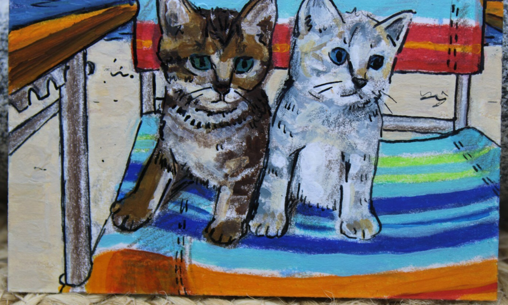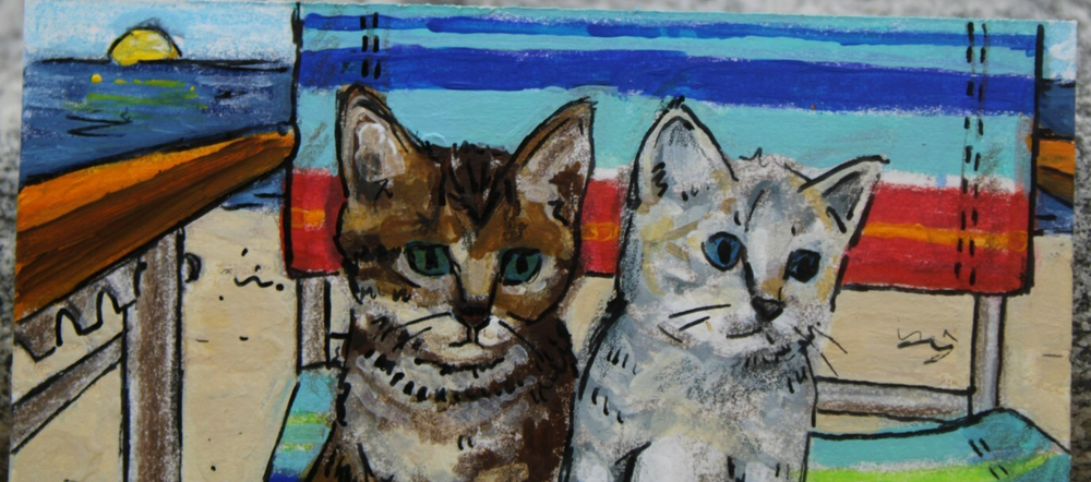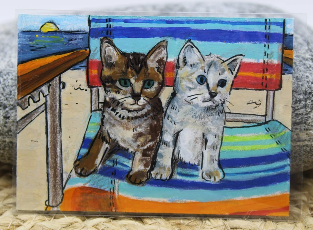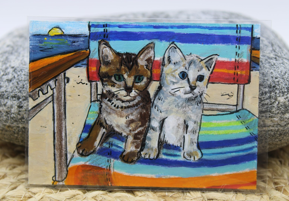 ACEO Original Cat Art - Cute Kittens at Beach by Rockn Palette